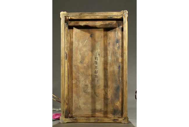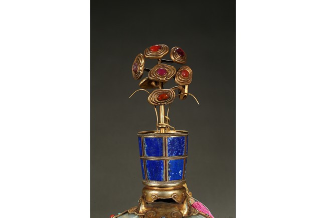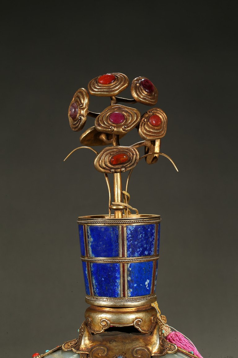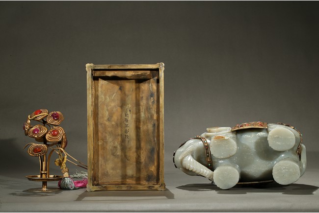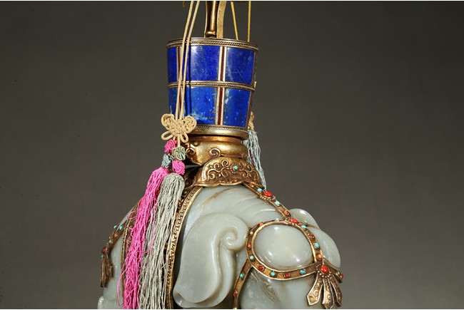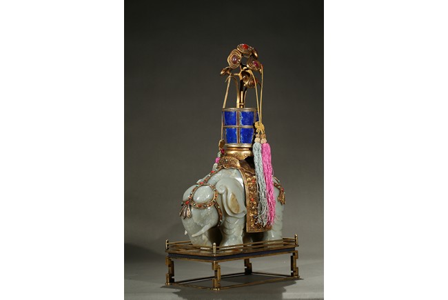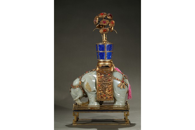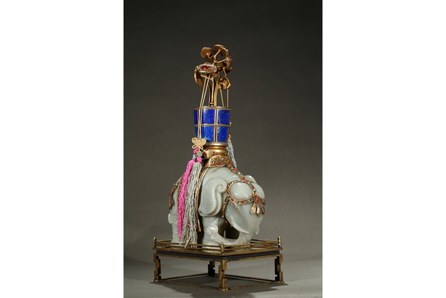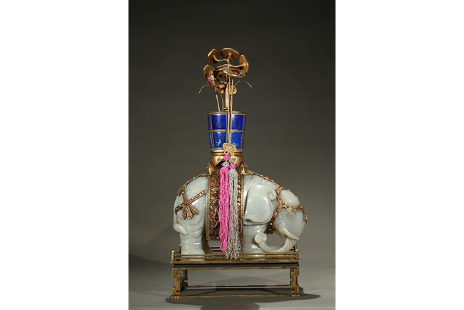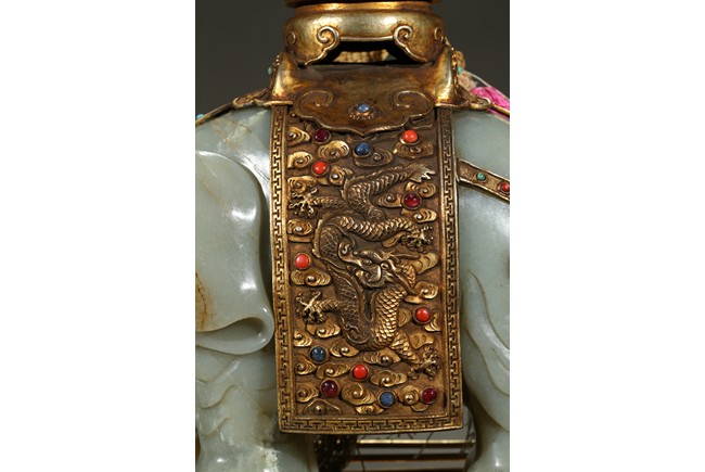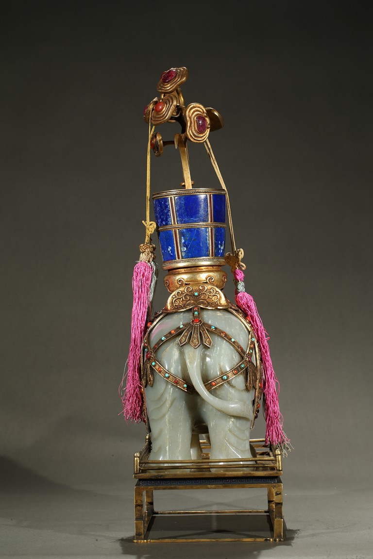 此青白玉太平有像擺件做工精細,造型準確,體形碩大,保存完整,實為難得。器主體為象形,背馱青金石瓶。大象體態渾圓,神情憨態可掬,身配瓔珞、綰具,背上搭一錦袱,上放鞍韉,寶瓶置於鞍上。像背上所置鞍韉、寶瓶為銅鎏金裝飾,圖樣繁覆而不亂,鑲紅寶,珊瑚,綠松,青金石等,華美異常。寶瓶插嵌靈芝,靈芝頭嵌瑪瑙,碧璽。“太平有像”,寓意天下太平,五谷豐登。此件用料奢華,工藝繁縟,制作精細,栩栩如生,令人嘆為觀止,一器之成必將費時日久,人力物力不可計數,堪稱案供神品。