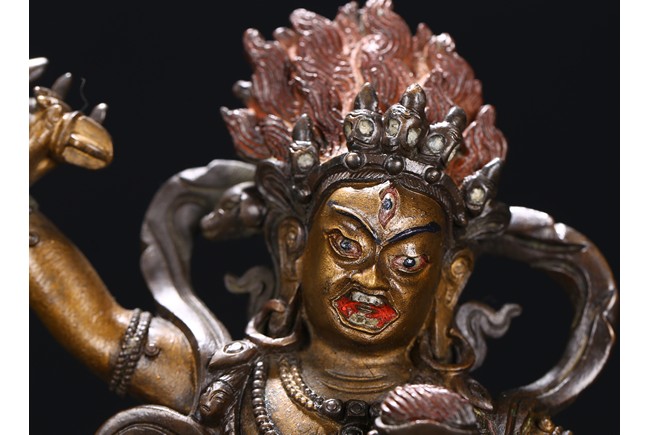 在藏傳佛教噶舉派中, 金剛亥母為女性本尊之首, 在格魯派中,她是三大本尊之一上樂金剛的明妃。此尊左腿單腿立於蓮花寶台之上,呈舞蹈姿,袒胸露乳,右手持鉞刀上舉,象徵清除人的一切愚昧,勾召真性智慧;左手應托盛滿鮮血的嘎巴拉碗,象徵她獲得了極樂的體驗,修證事業的成功。