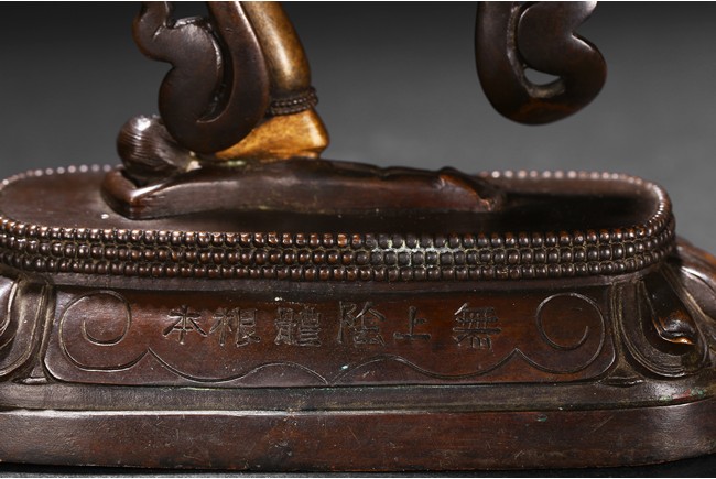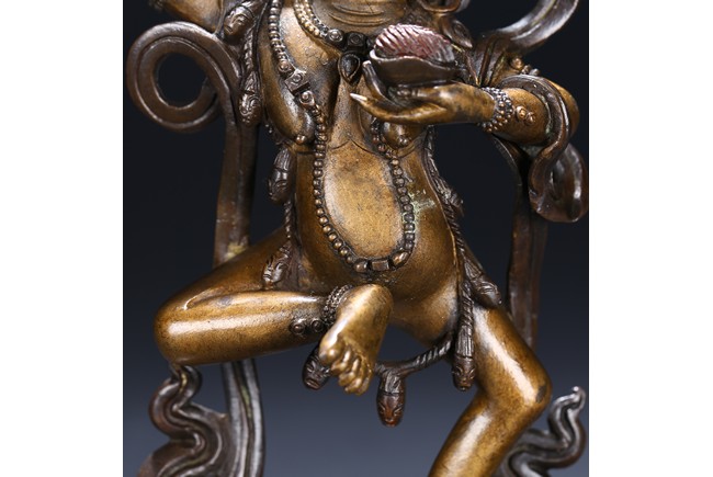 Expressively cast dancing on a prostrated figure over a round lotus base, brandishing the vajra and skull cup, wearing a garland, necklace and beaded sash securing the short dhoti, her braided hair gathered in a high chignon, base with marks. Qing Dynasty period.