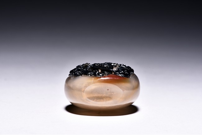 Of oblong form, the bottle is carved on one side utilizing the dark black areas with scene of five elderly scholars appreciating a scroll painting under a pine, the other side undecorated showing the natural texture of the stone. Qing Dynasty period.