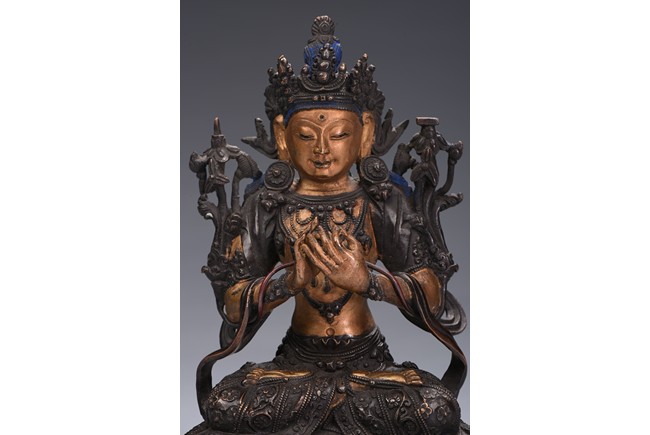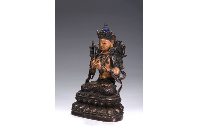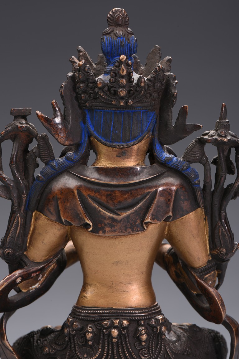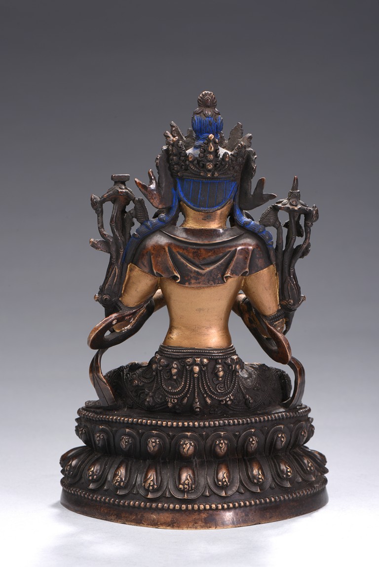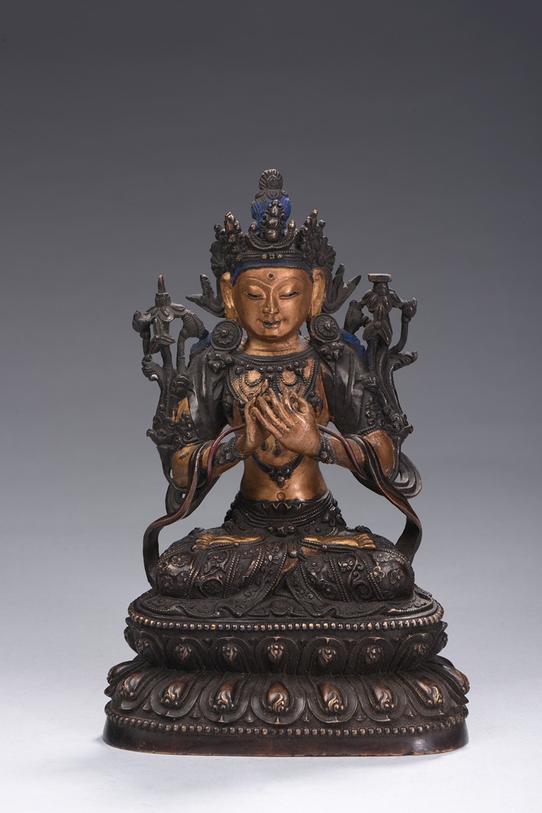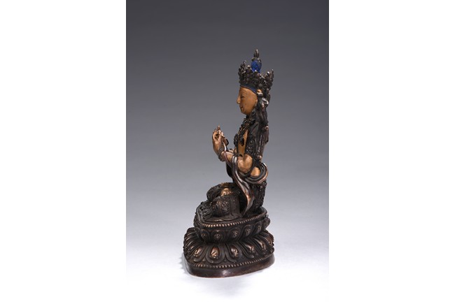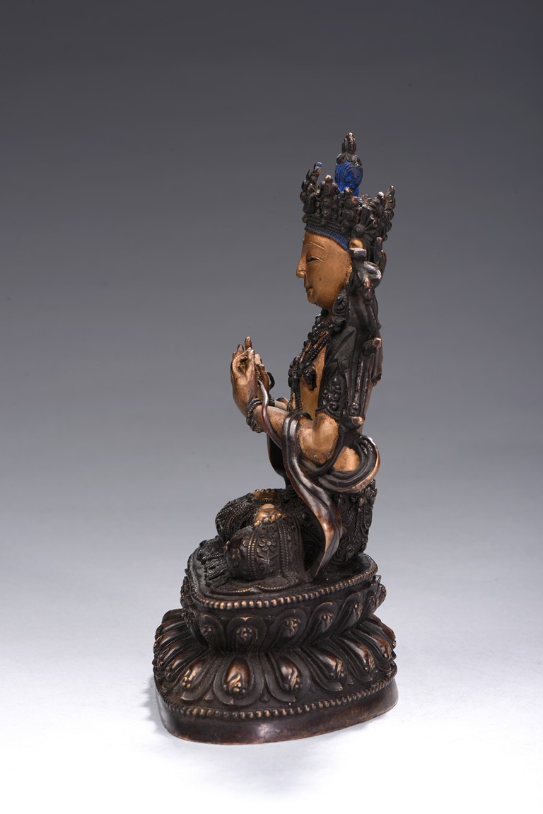 The bodhisattva is cast seated on double lotus throne, hands in dharmachakira mudra, wearing flowing dhoti in folds around knees and sash around shoulders revealing bare chest adorned with jewellery, face with benevolent expression, which are cold-gilted. Qing Dynasty period.