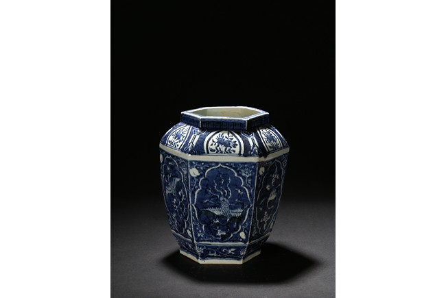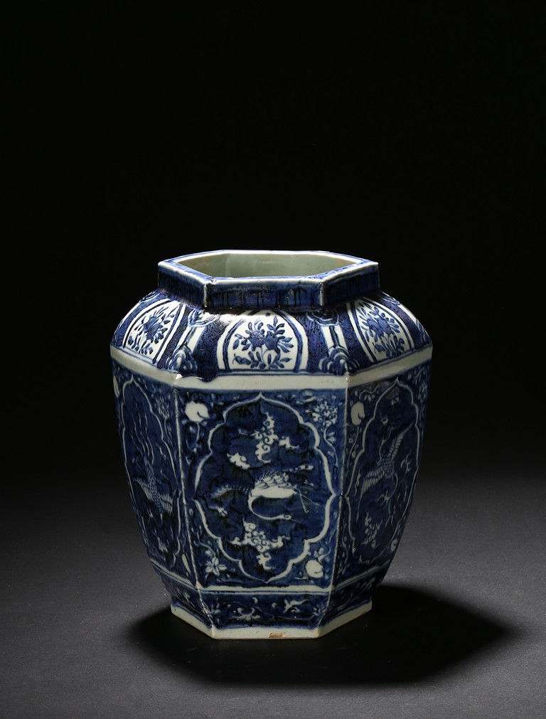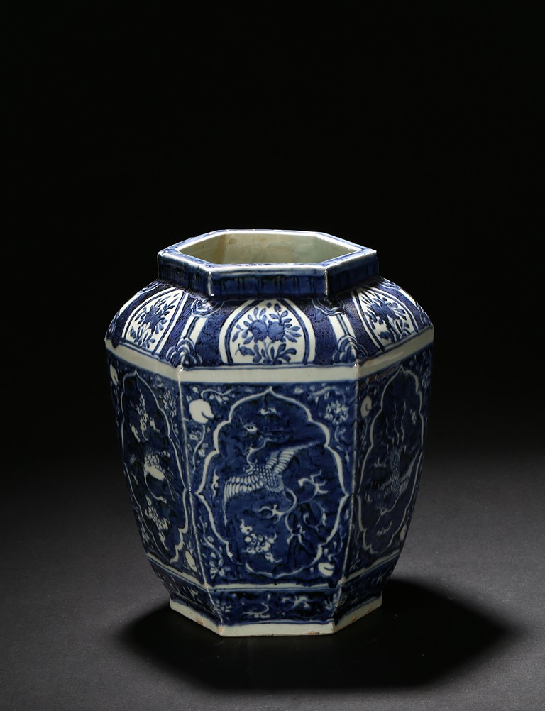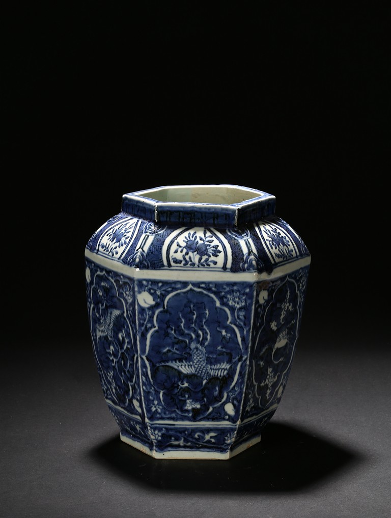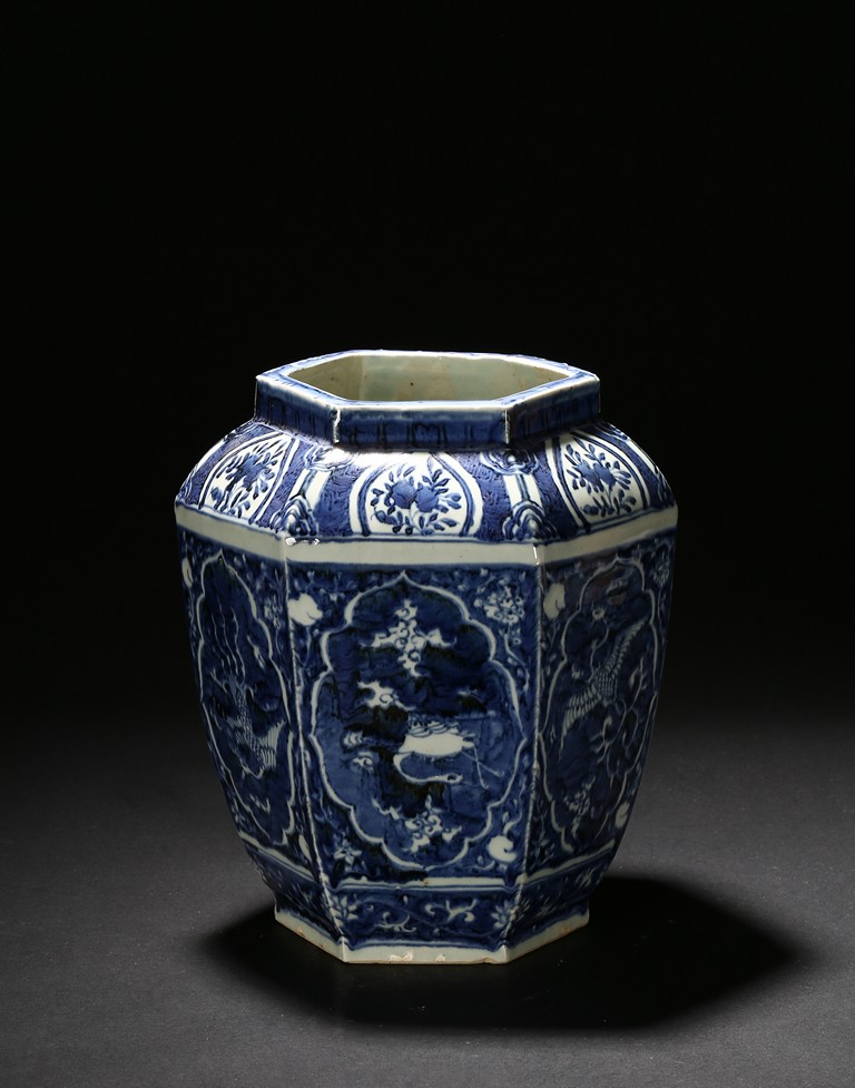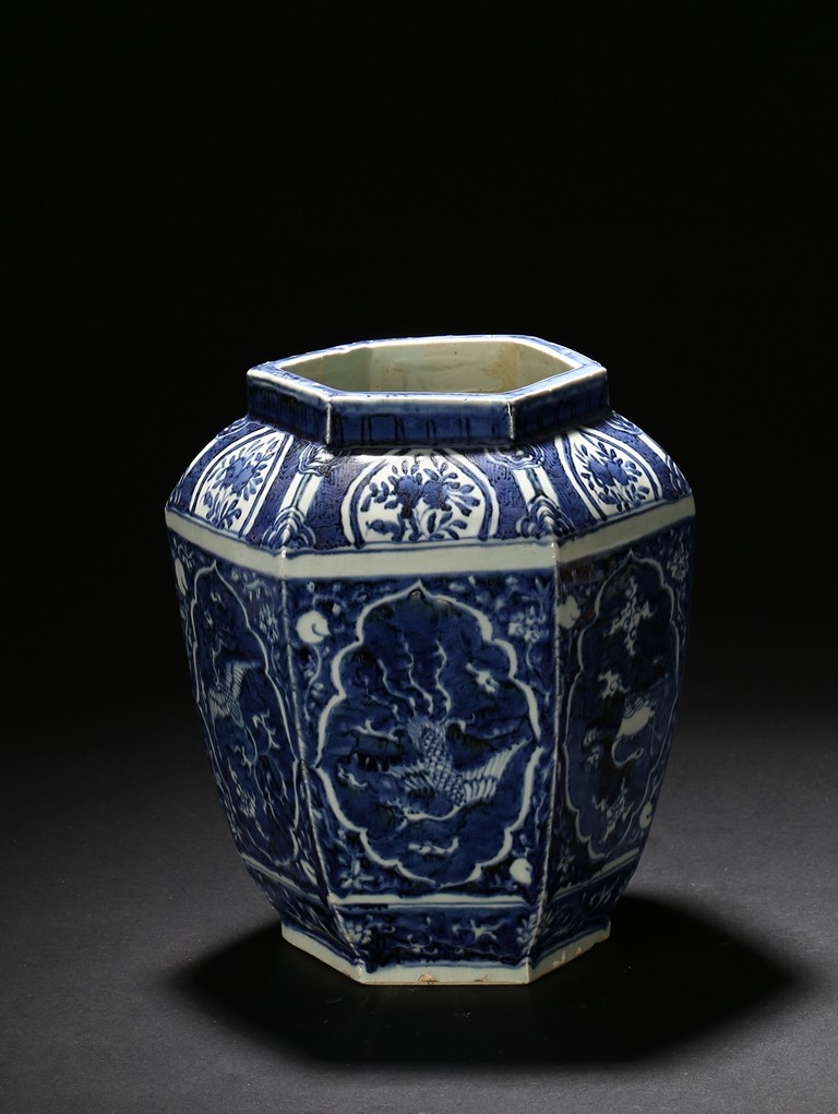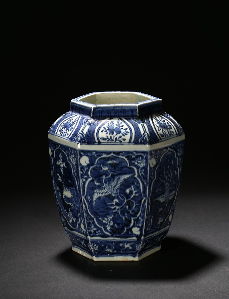 Of hexagonal form, each side painted with mythical phoenix enclosed in a shaped cartouche, the shoulder painted further with leafy fruit sprig. Qing Dynasty period.