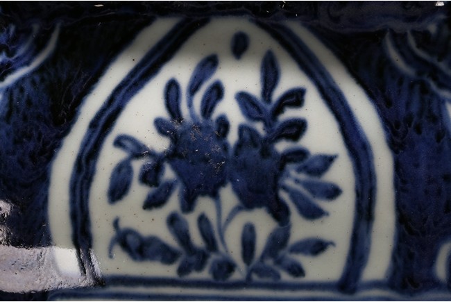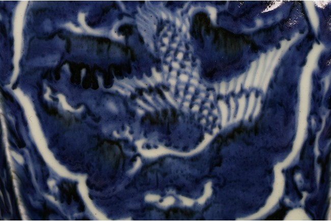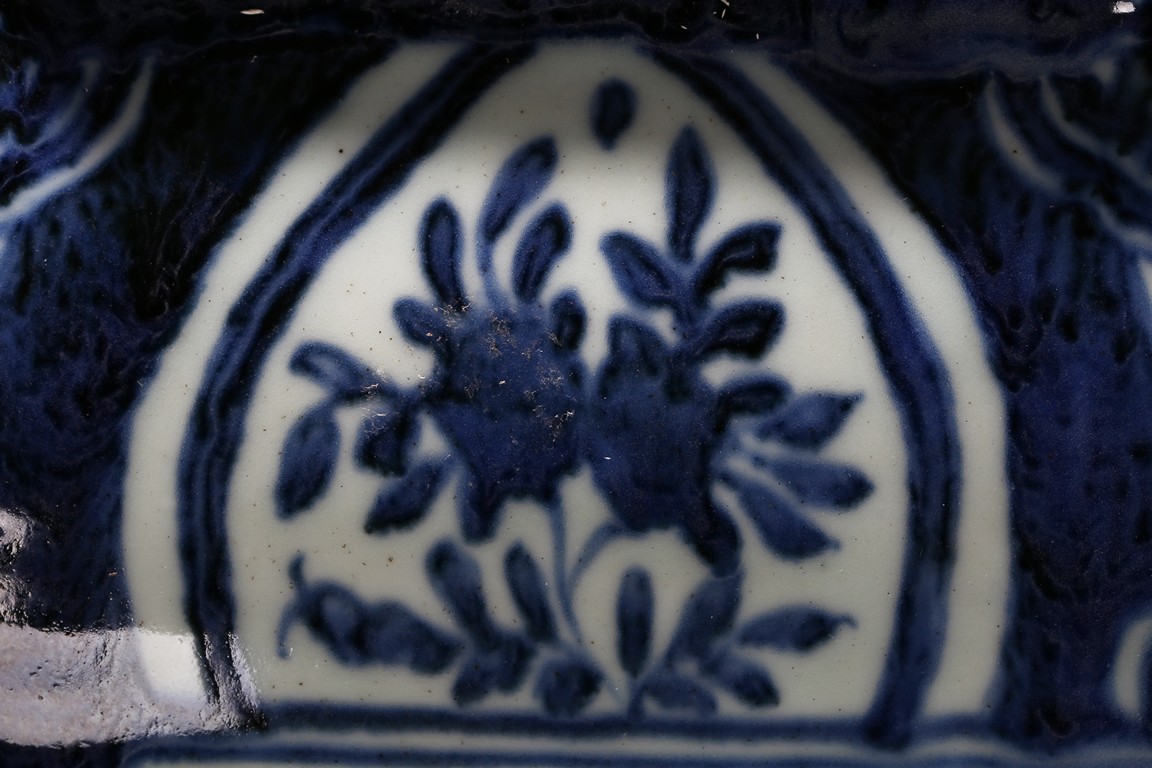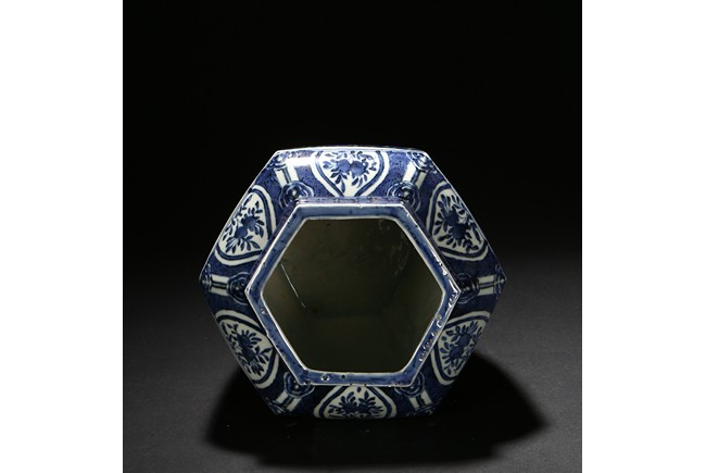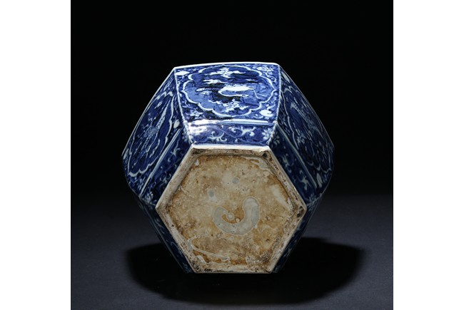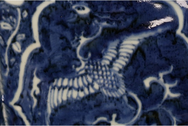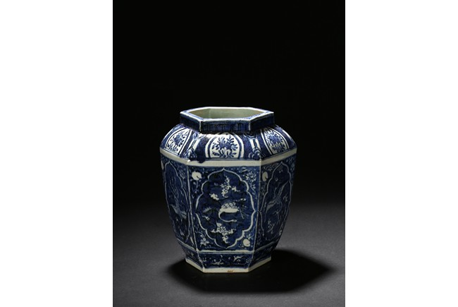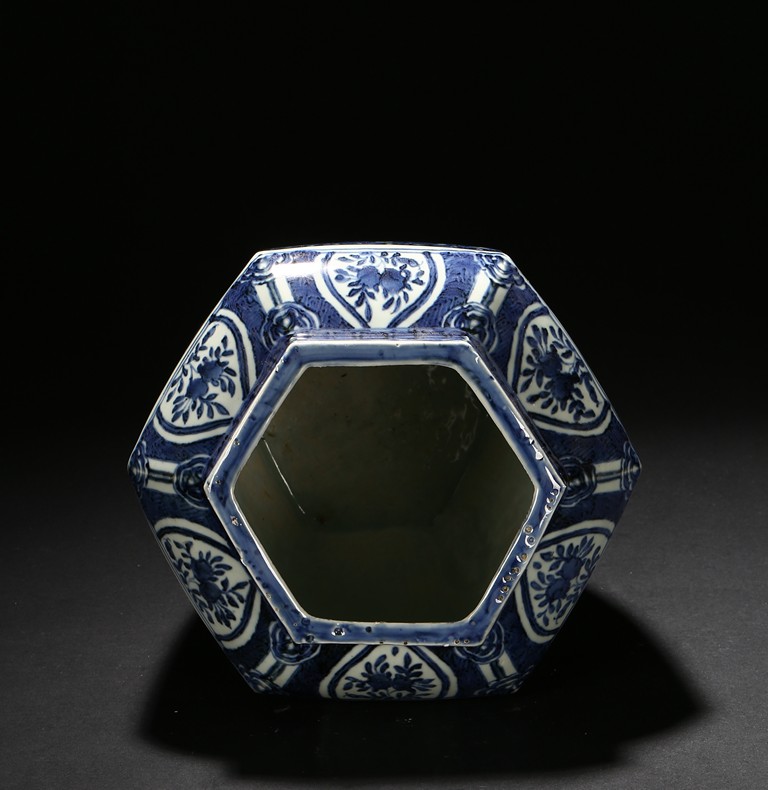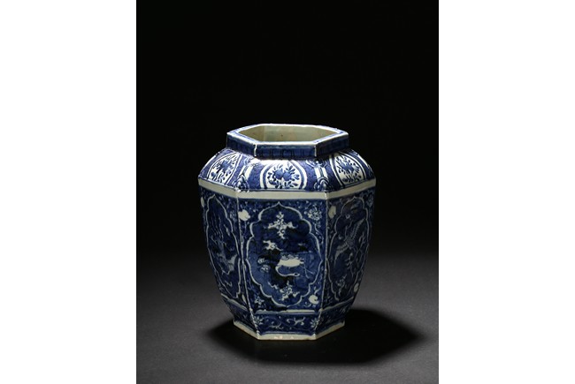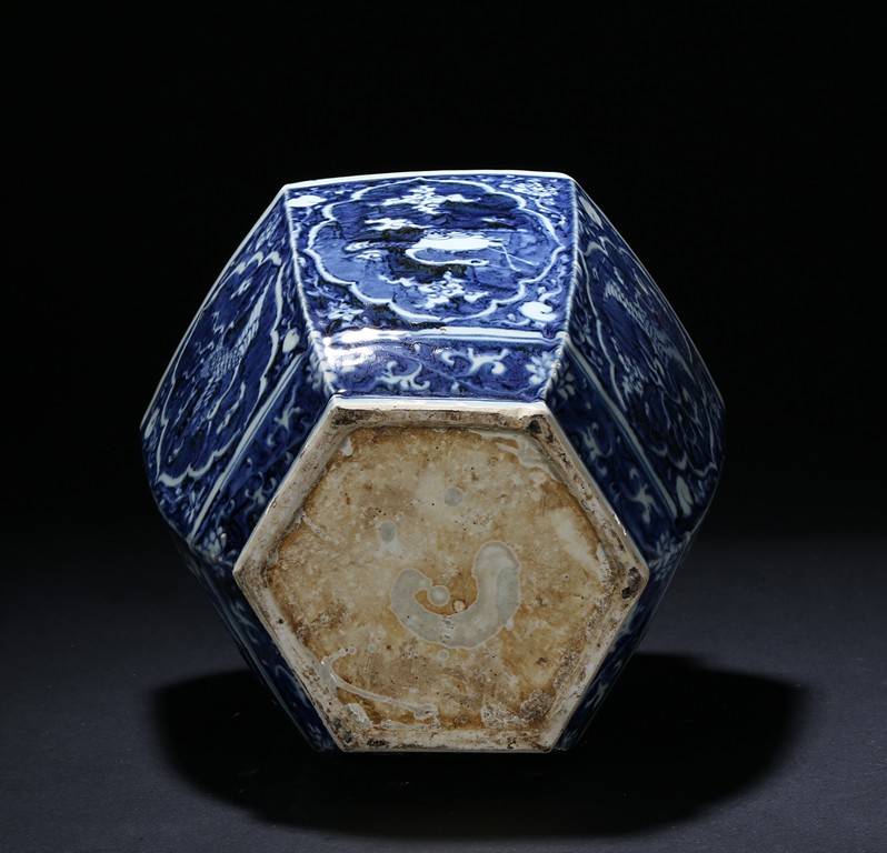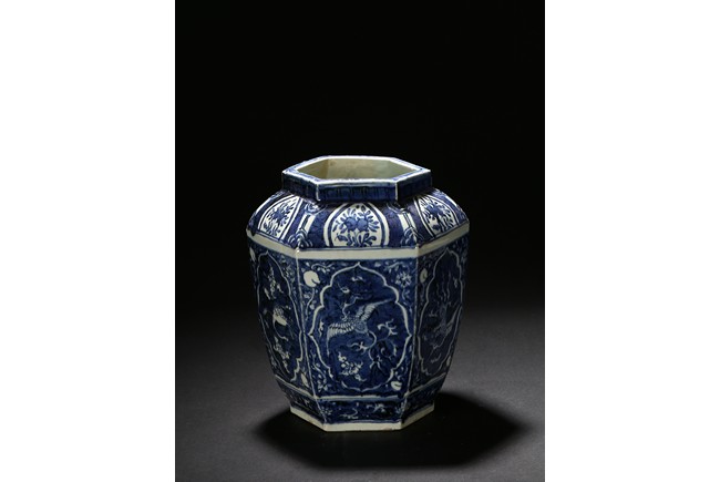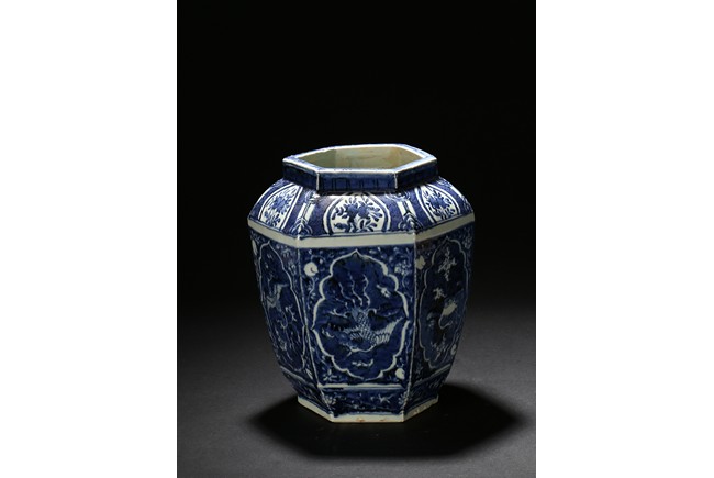 Of hexagonal form, each side painted with mythical phoenix enclosed in a shaped cartouche, the shoulder painted further with leafy fruit sprig. Qing Dynasty period.