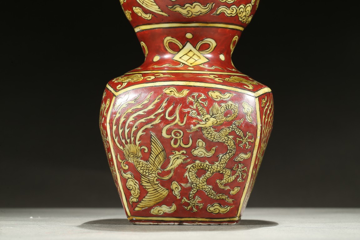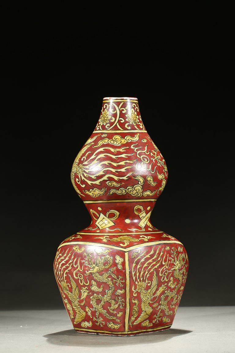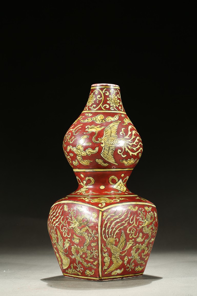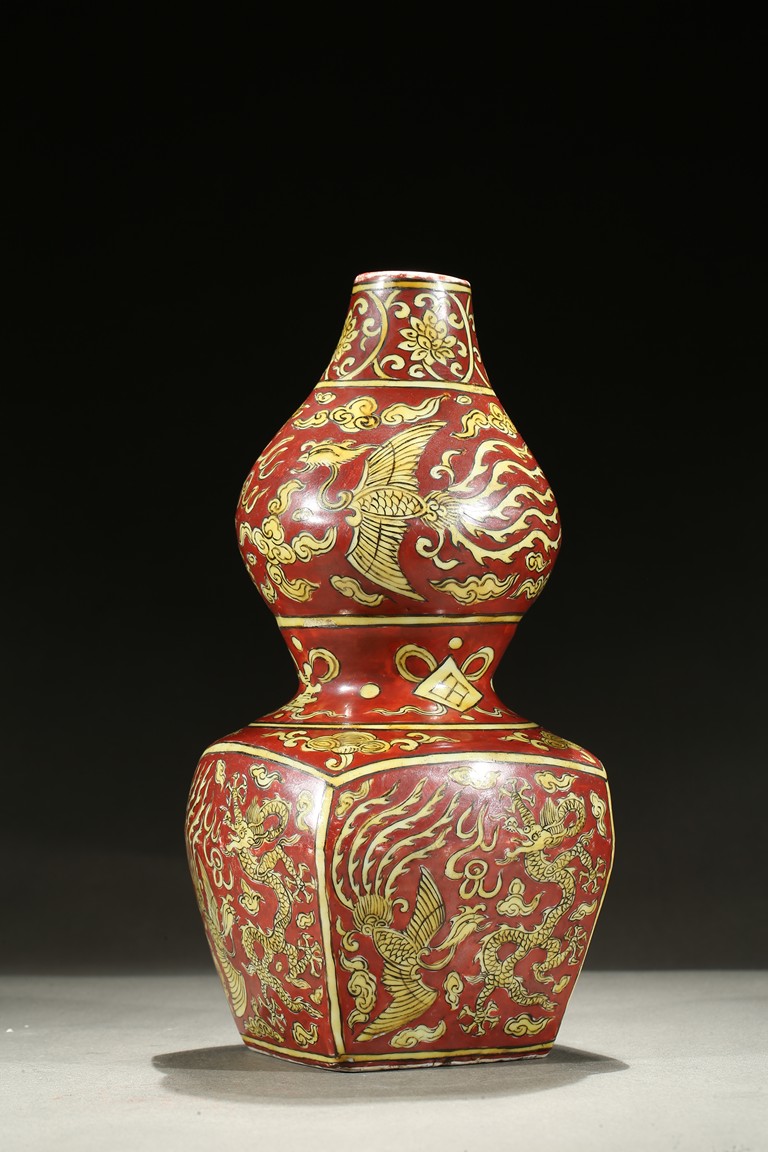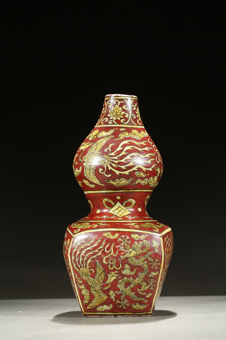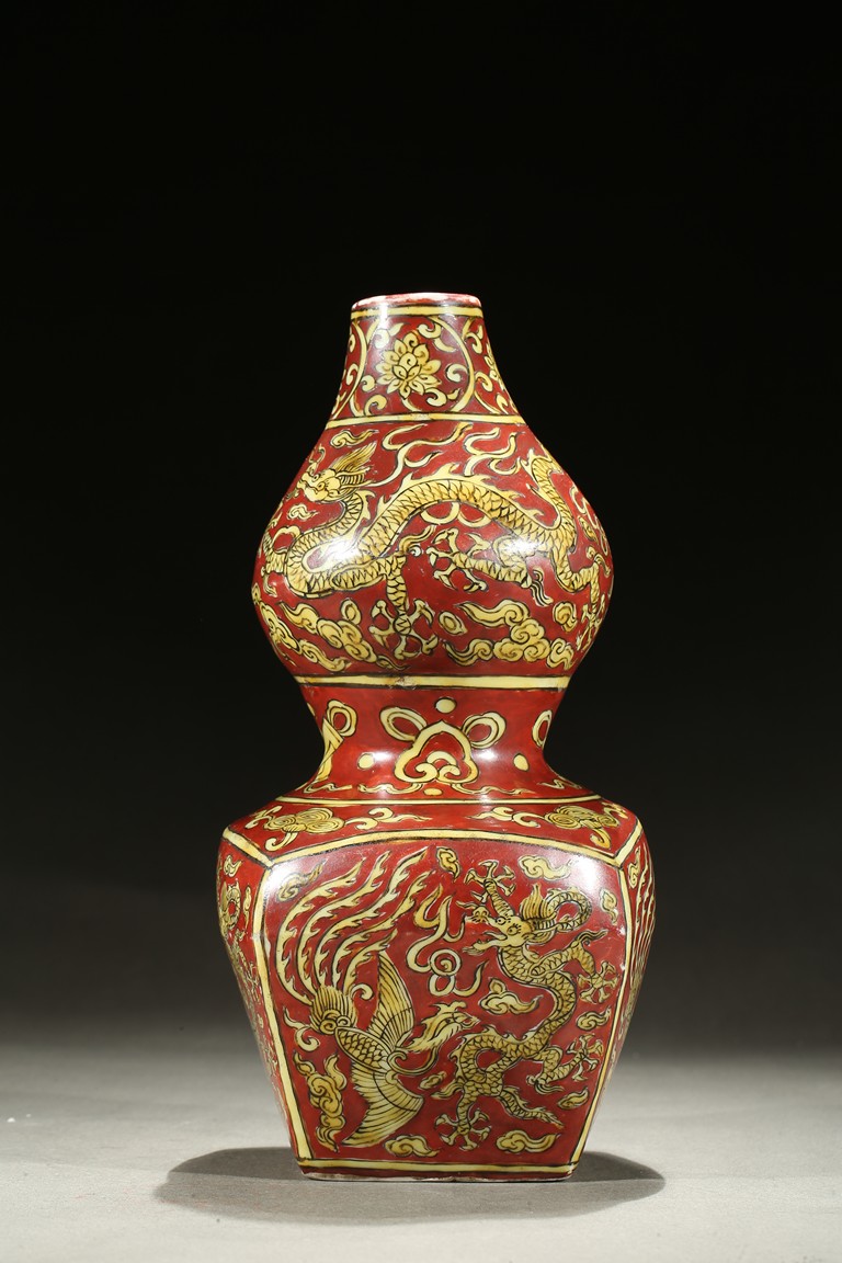 來源:南加州聖地亞哥私人舊藏 Provenance: Property from a private San Diego collection, California 瓶呈葫蘆式,上圓下方,直口、束腰、方形圈足,通體飾五爪龍紋及鳳紋,紅黃相配,「黃」為帝王用色,「紅」則表意幸運,兩種色彩相輔相成,顏色比對分明,紋飾寓意祥瑞,類似紋飾可比較大阪市立東洋陶瓷美術館所藏明黃地紅彩龍紋罐。