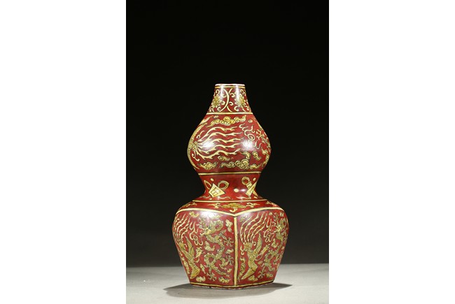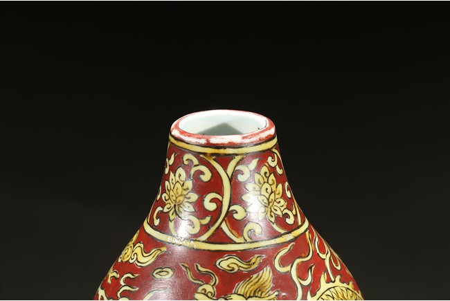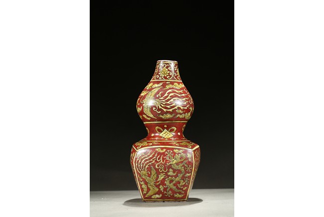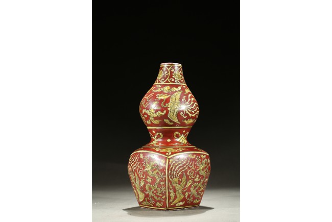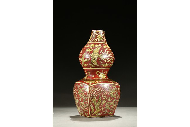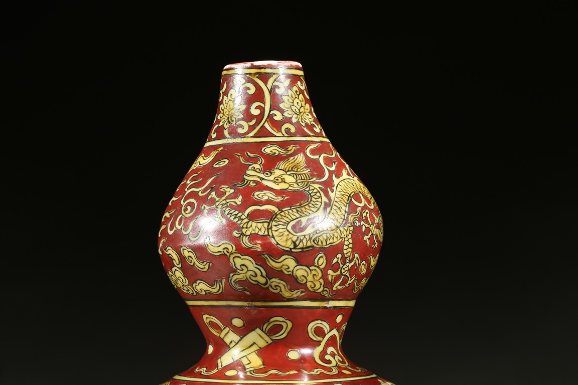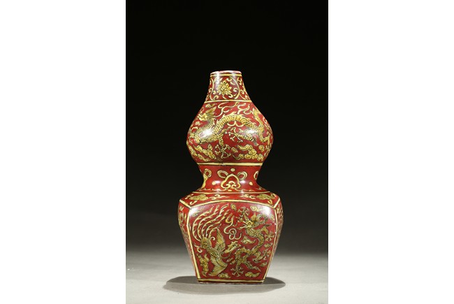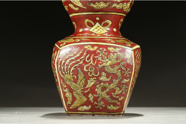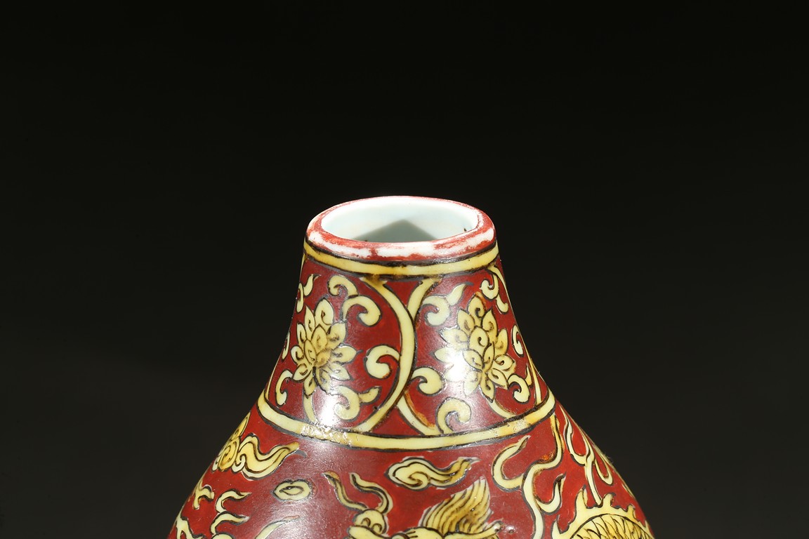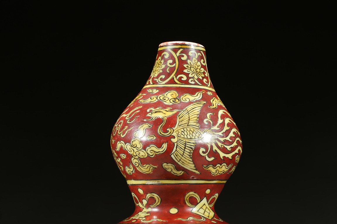 來源:南加州聖地亞哥私人舊藏 Provenance: Property from a private San Diego collection, California 瓶呈葫蘆式,上圓下方,直口、束腰、方形圈足,通體飾五爪龍紋及鳳紋,紅黃相配,「黃」為帝王用色,「紅」則表意幸運,兩種色彩相輔相成,顏色比對分明,紋飾寓意祥瑞,類似紋飾可比較大阪市立東洋陶瓷美術館所藏明黃地紅彩龍紋罐。