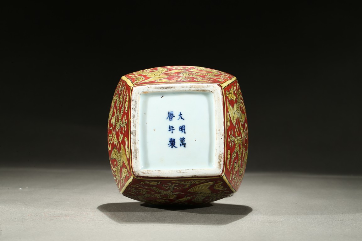 The lower section of the vase is of rounded square form rising to a bulbous upper section, decorated in yellow glaze overall with phoenix and dragon in flight amidst auspicious clouds, the middle section painted with Taoist objects, the band below the rim with scrolled lotus spray, all reserved on an iron-red ground. The base with six character WANLI mark. Ming Dynasty period.