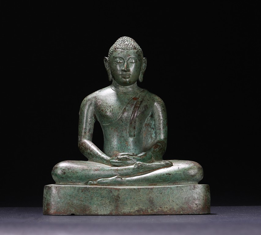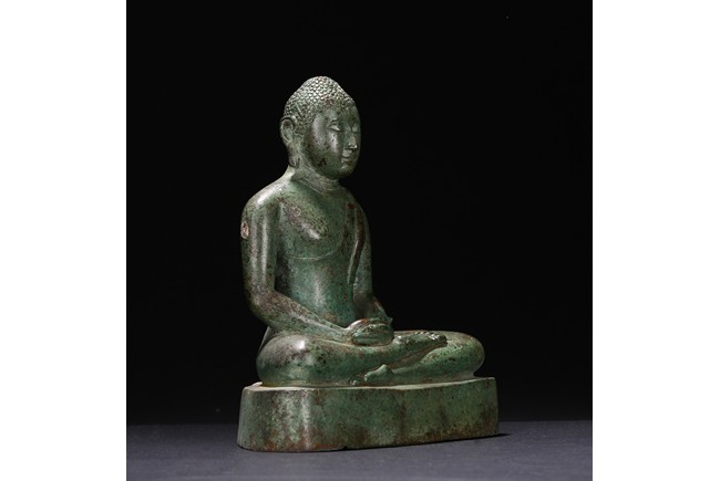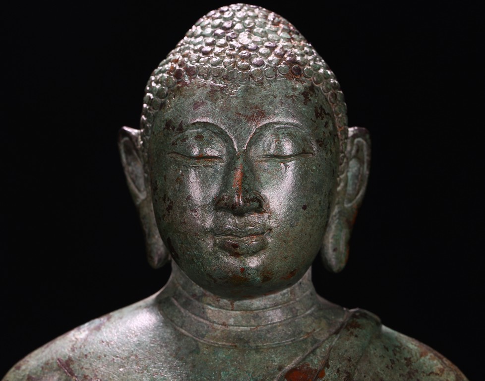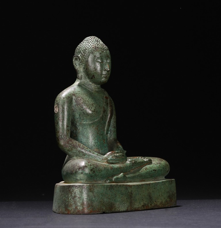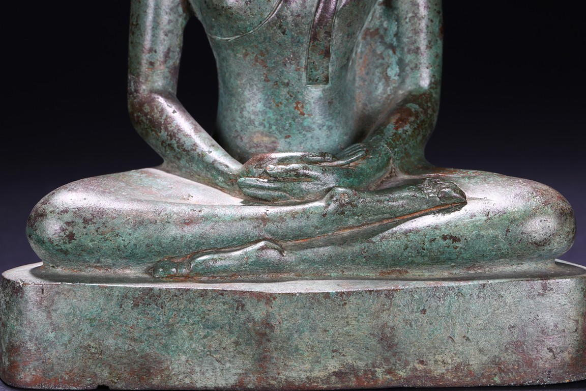 Sri Lanka. Seated on base with folded hands resting in his lap, the face with serene expression flanked by pendulous earlobes, the hair in tight curls. 17th century