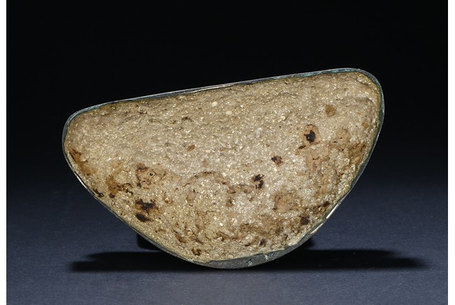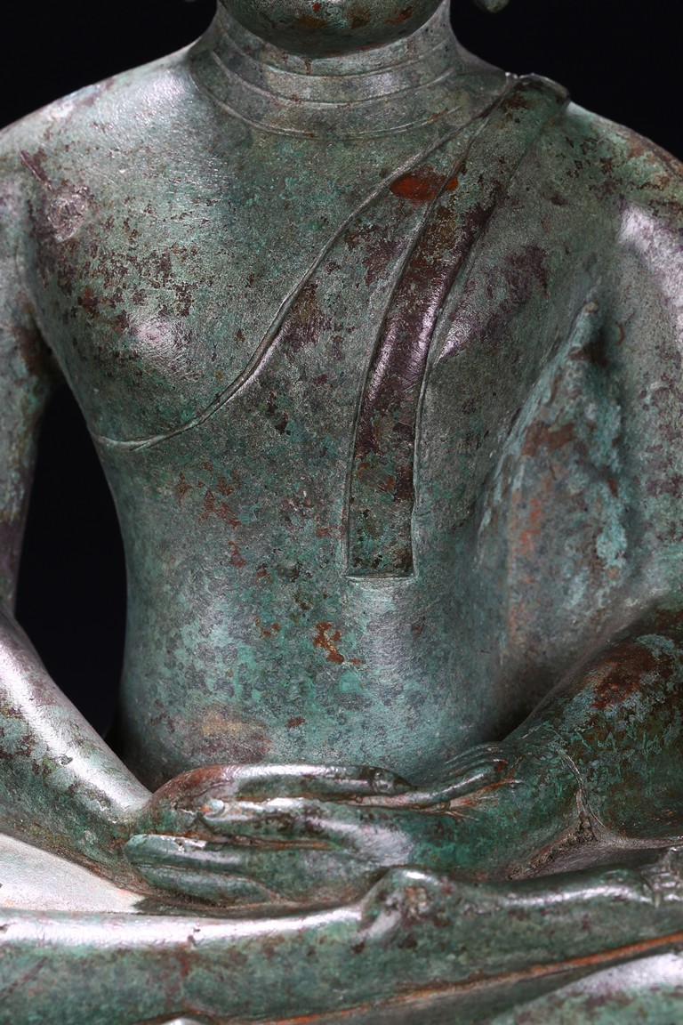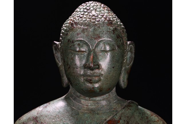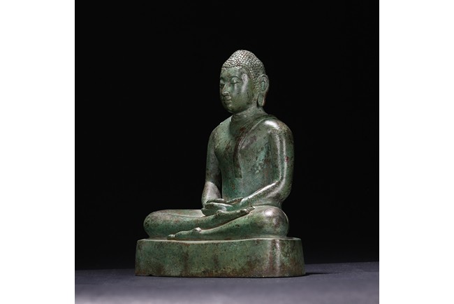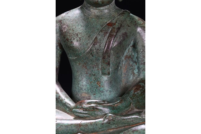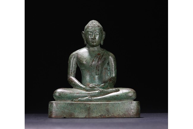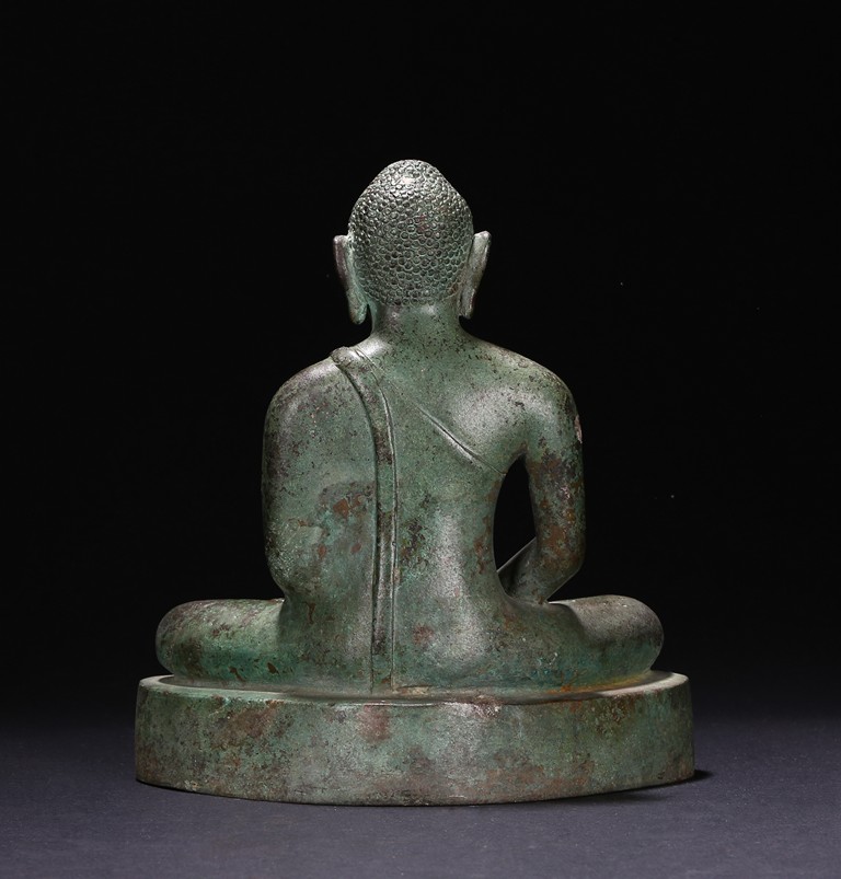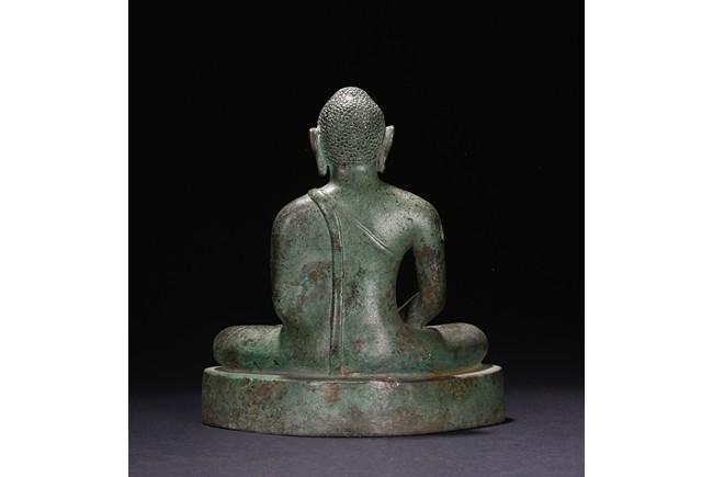 Sri Lanka. Seated on base with folded hands resting in his lap, the face with serene expression flanked by pendulous earlobes, the hair in tight curls. 17th century