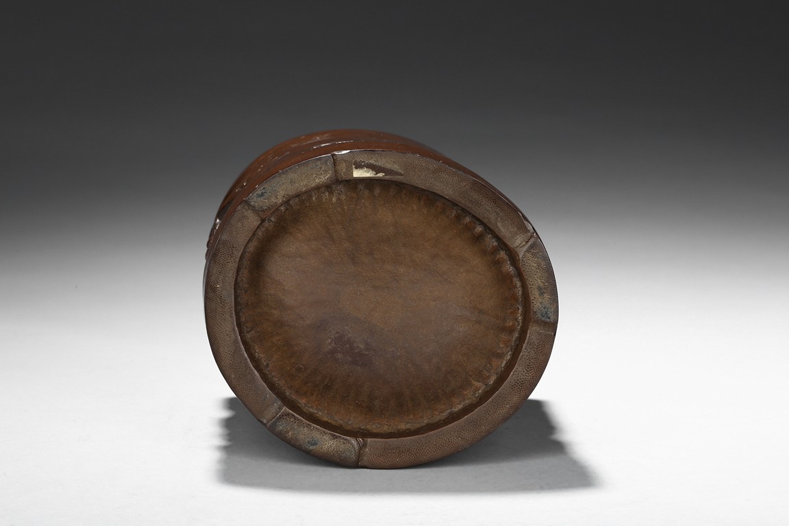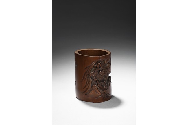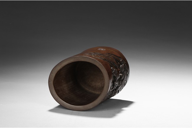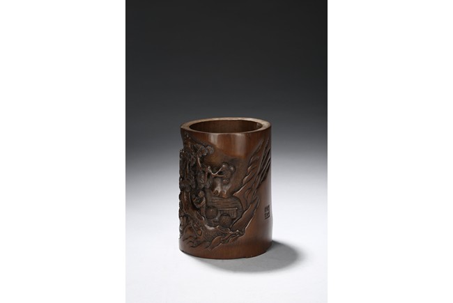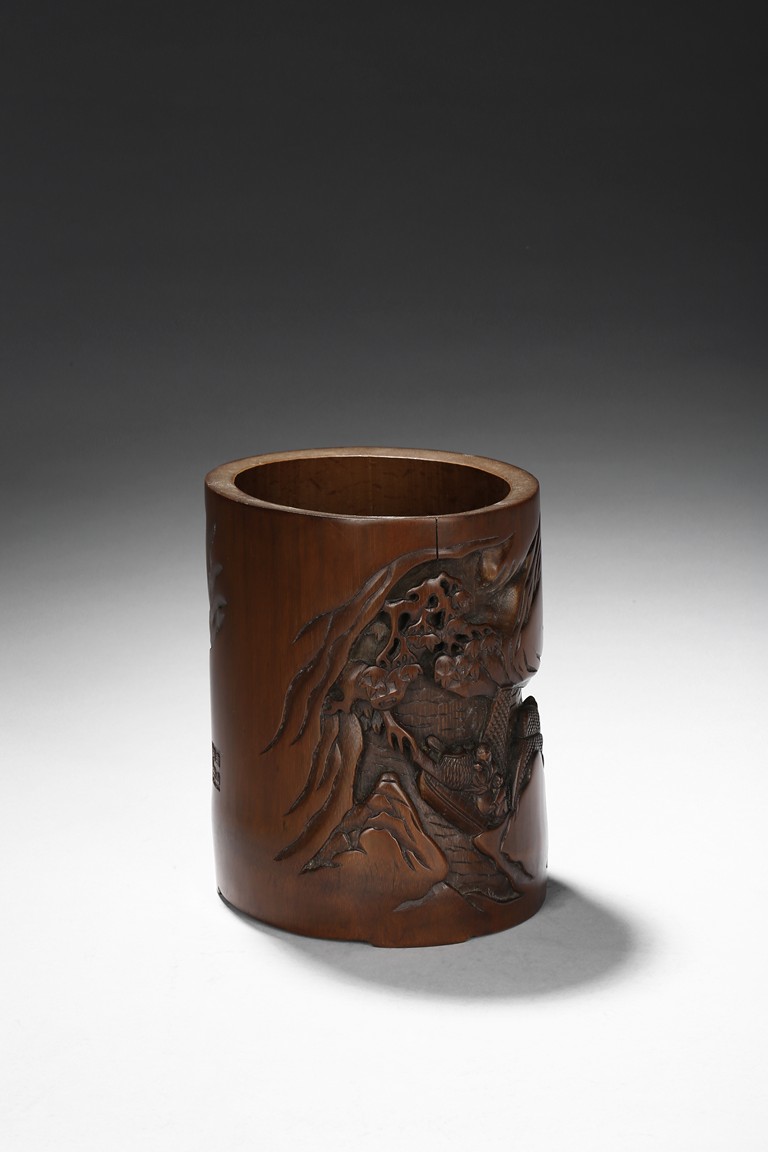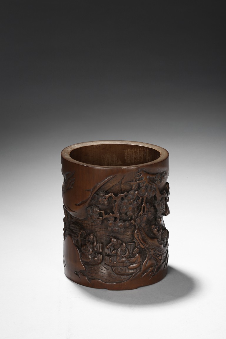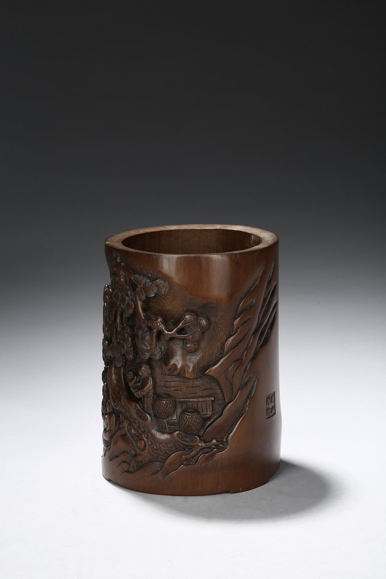 Of cylindrical form, the body carved with a continous scene of eldery scholars on boats conversing under a large pine tree, impressed with a square mark. Republic period.