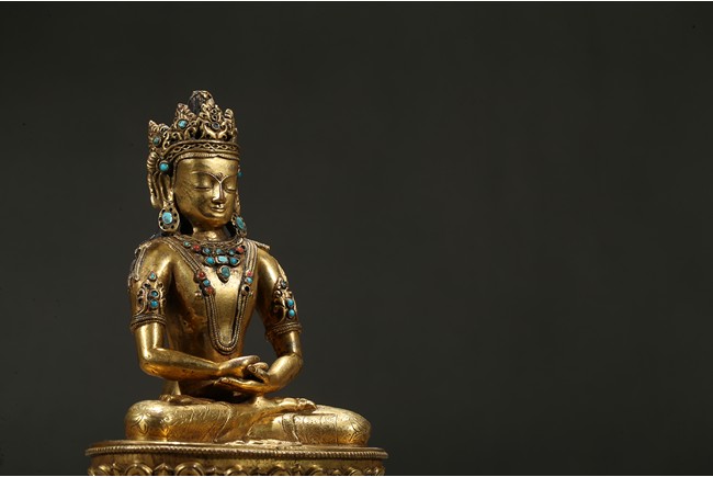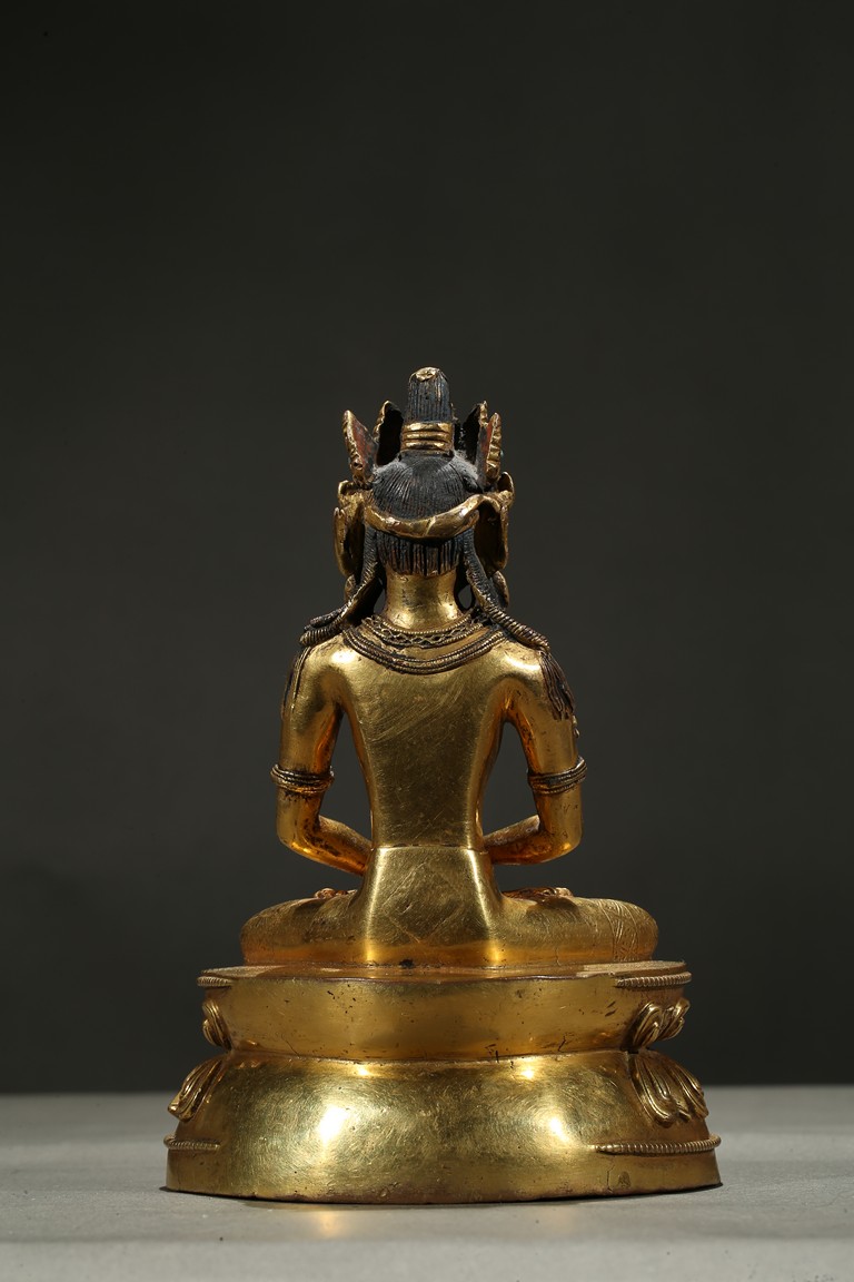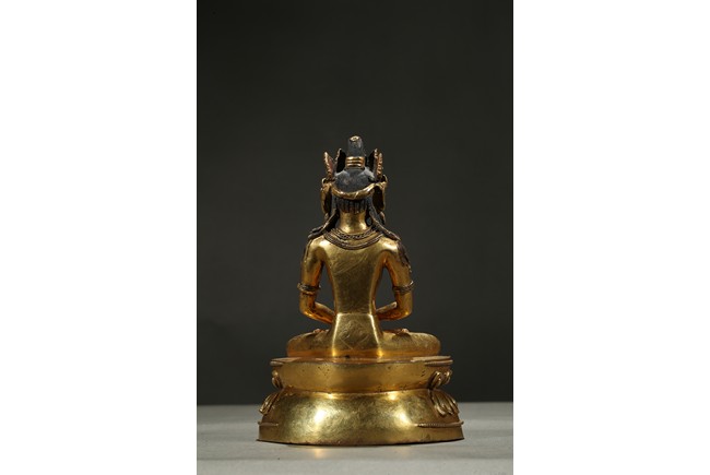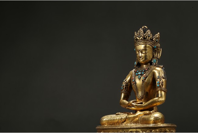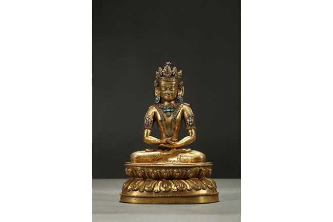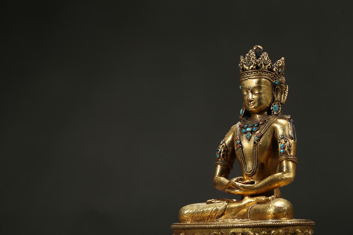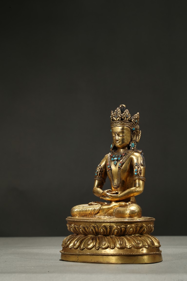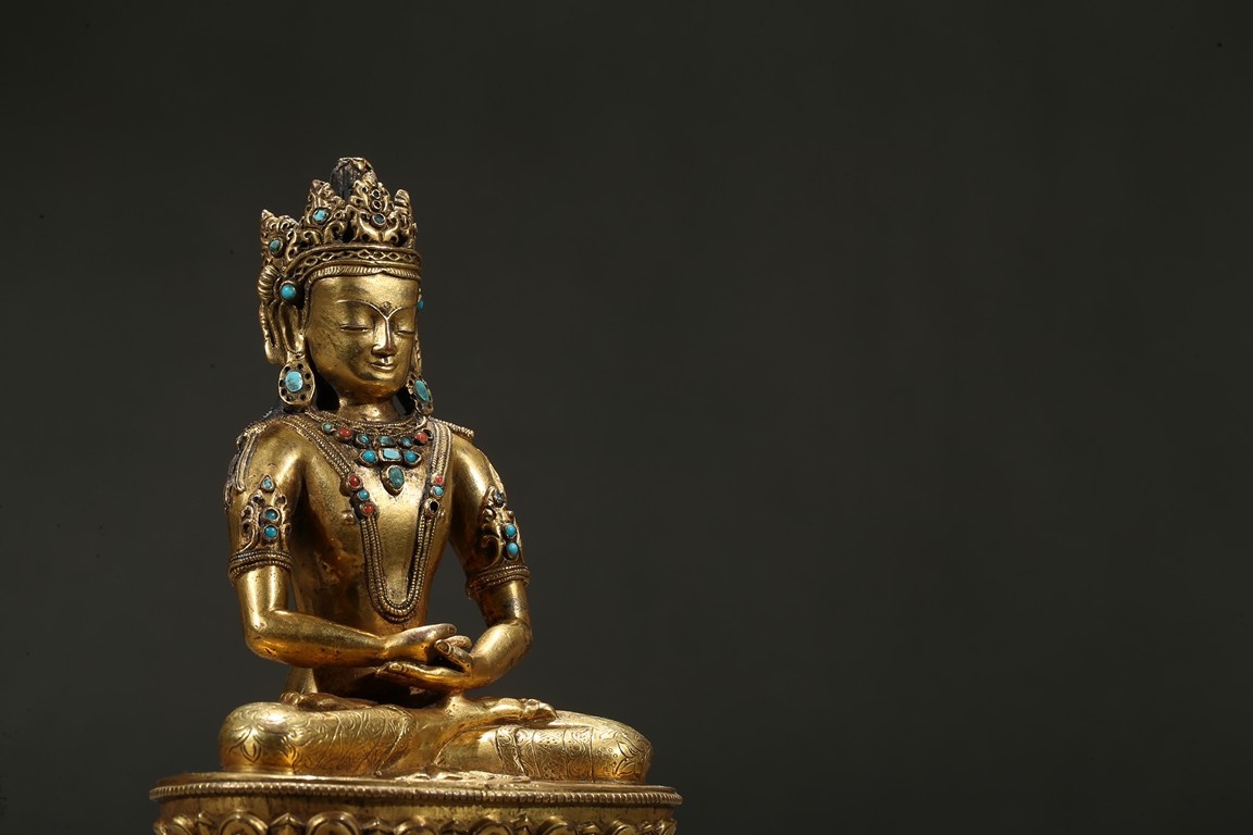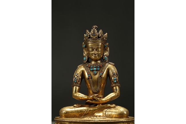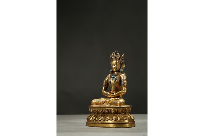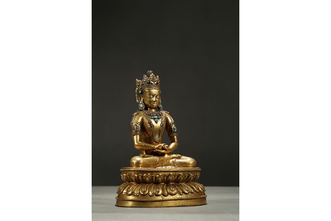 Cast seated in dhyanasana on a double lotus base, the hands folded in dhyanamudra, dressed in a dhoti and embellished with beaded coral and turquoise, the face with a meditative expression, crowned with a five-leaf diadem. Late Ming Dynasty period.