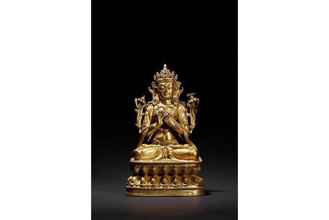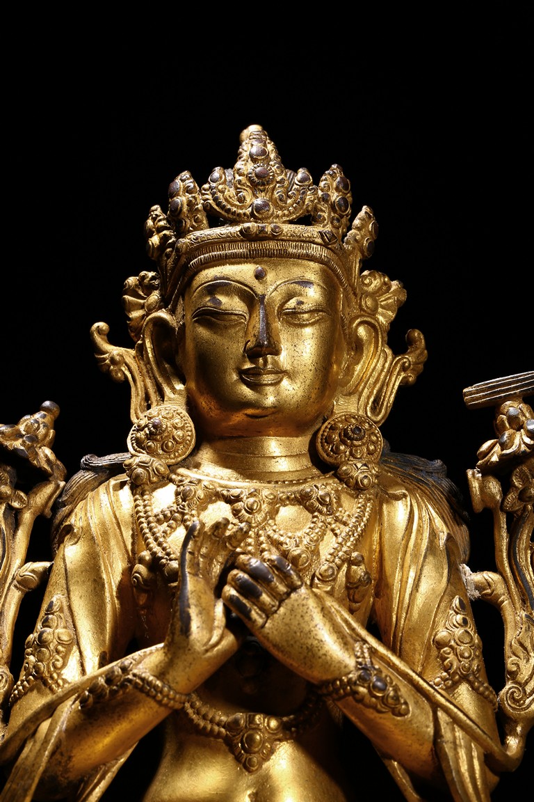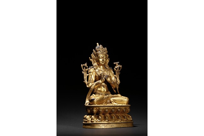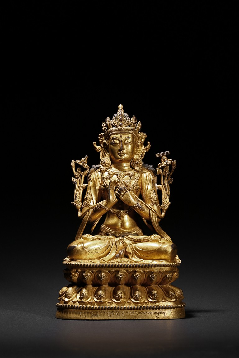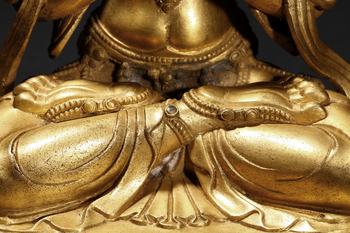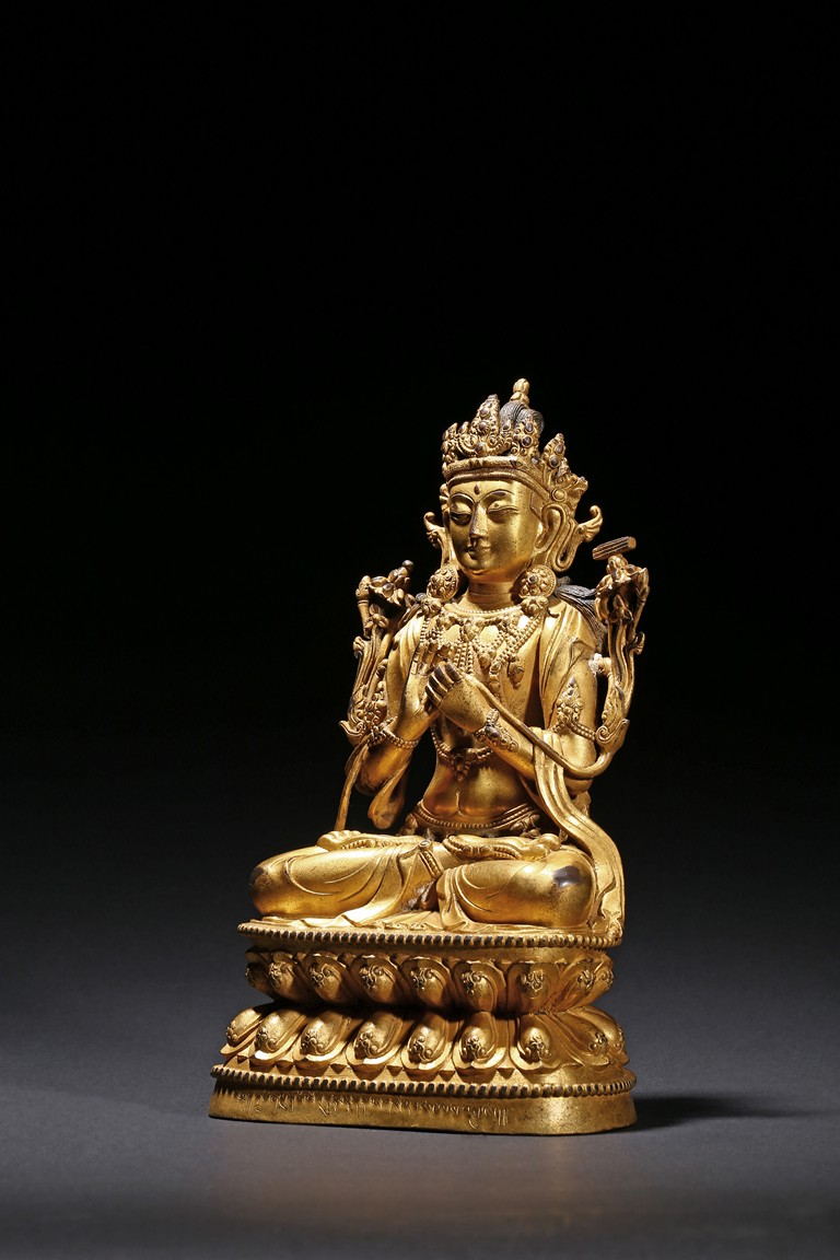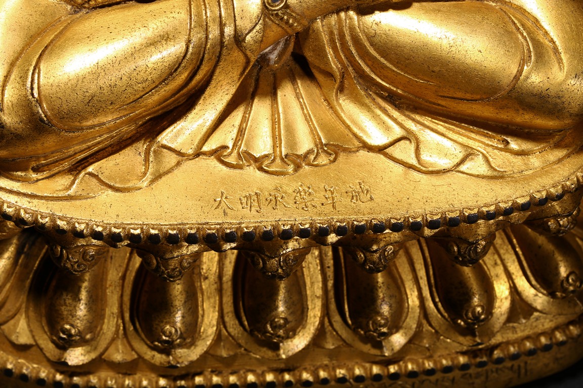 cast seated in dhyanasana on a double-lotus pedestal, the arms raised in dharamcakramudra to the chest, holding two stalks of uptala lotuses rising up the shoulders, the gracefully swaying figure wearing a dhoti falling into elegant pleats, draped with a celestial scarf around the shoulders and arms, the chest and the waist adorned by elaborate beaded necklaces, the face with a benevolent expression, surmounted by a five-leaf diadem around a high chignon, the lotus base incised with a reign mark reading Da Ming Yongle nian shi. Ming Dynasty period.
