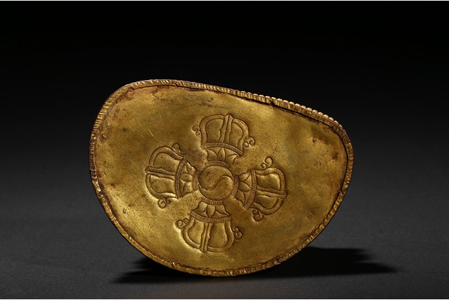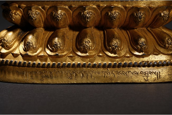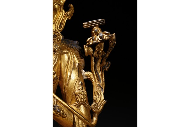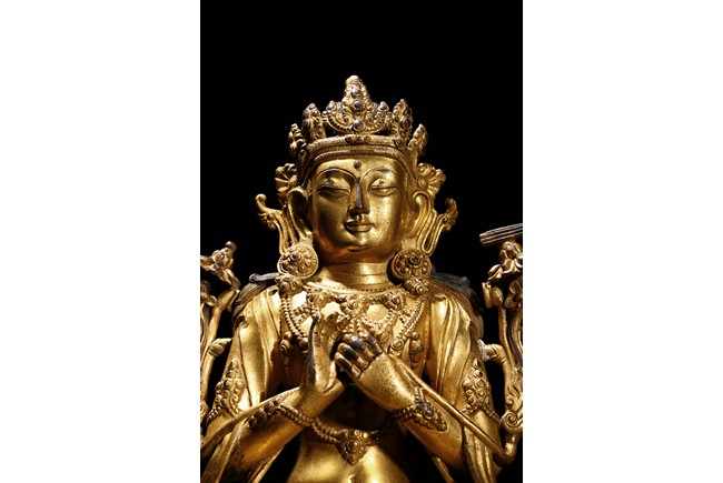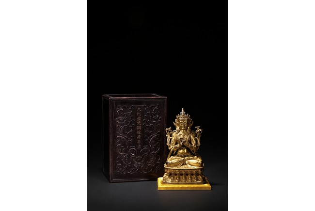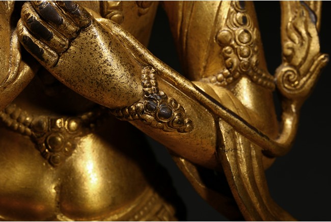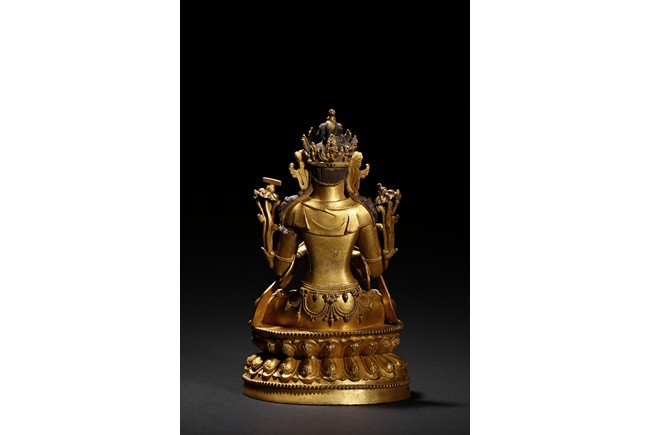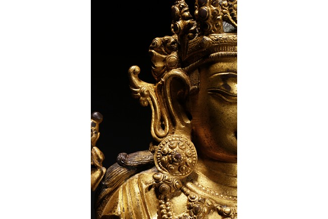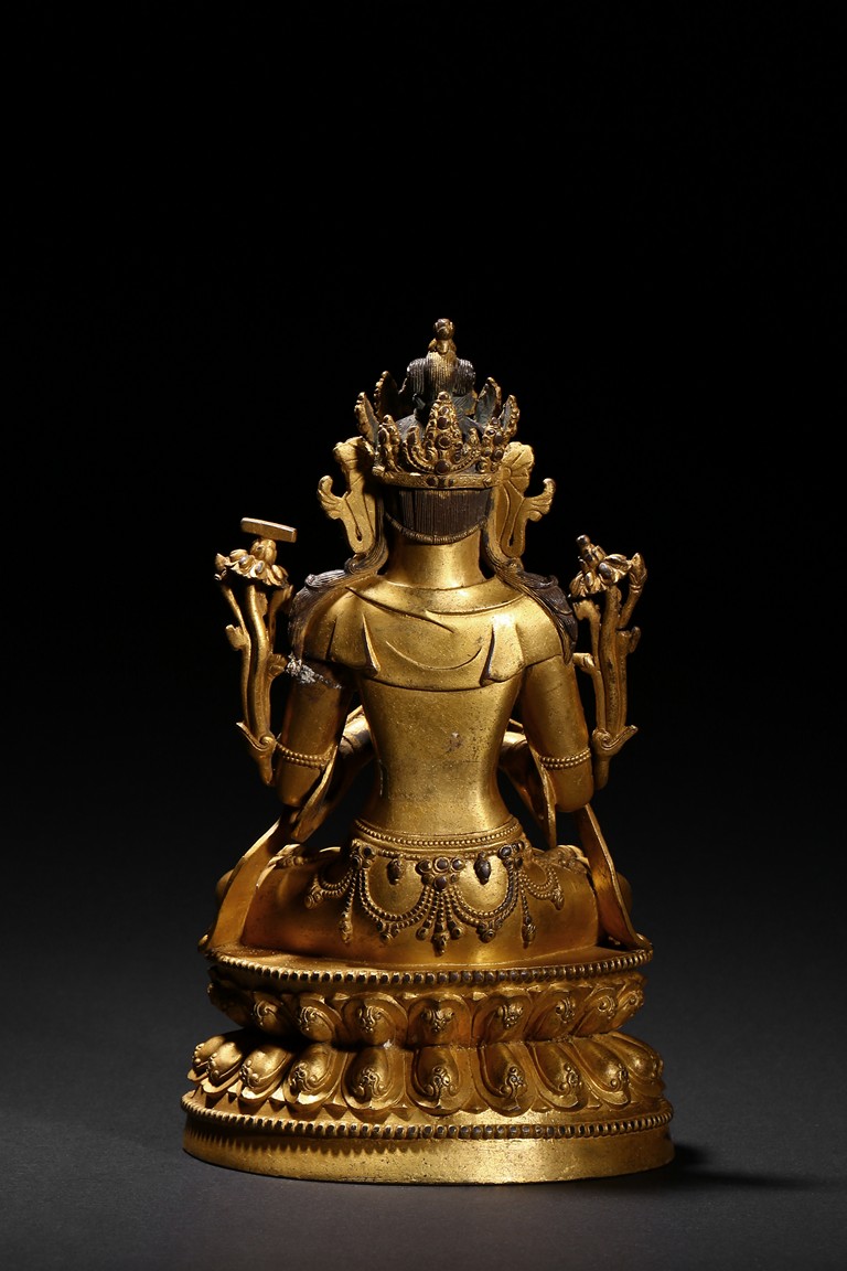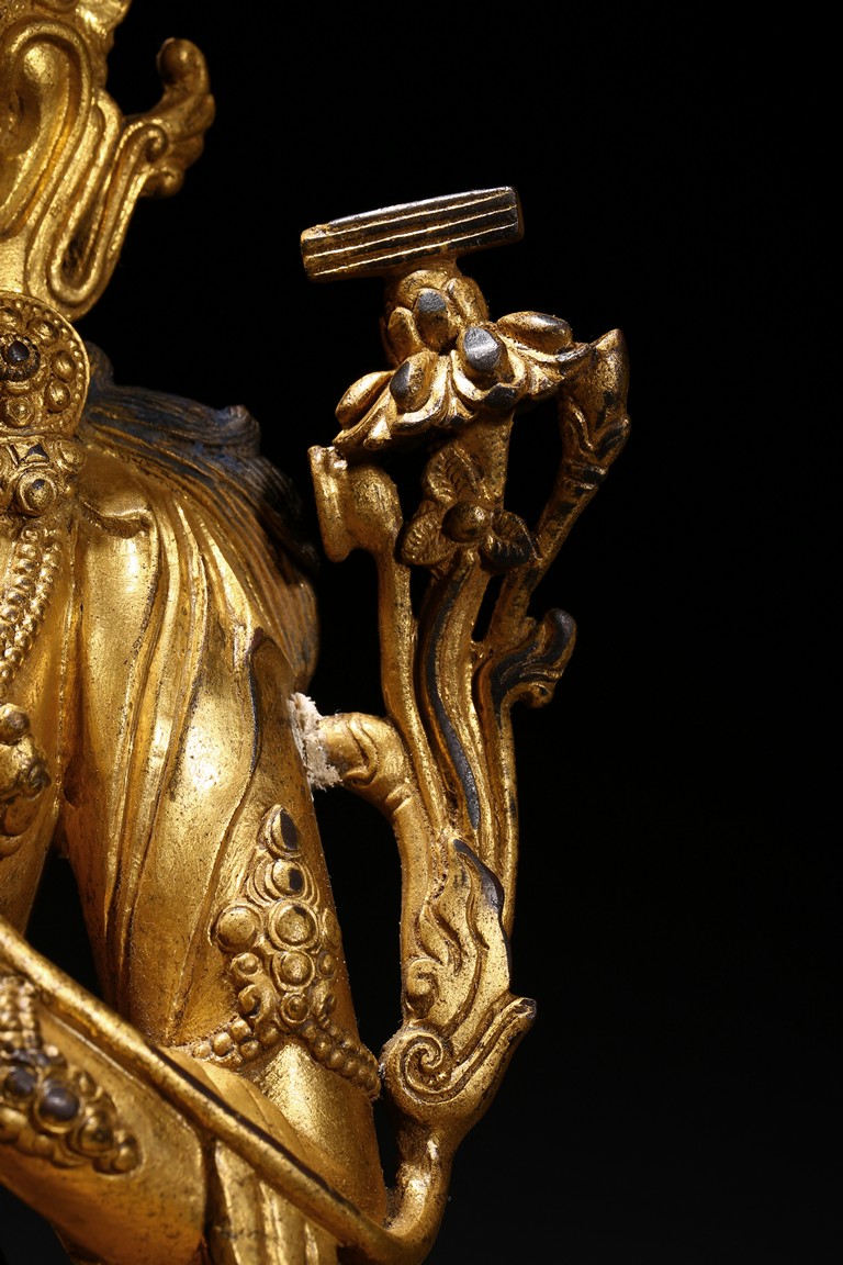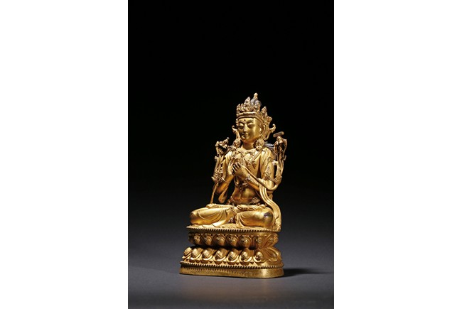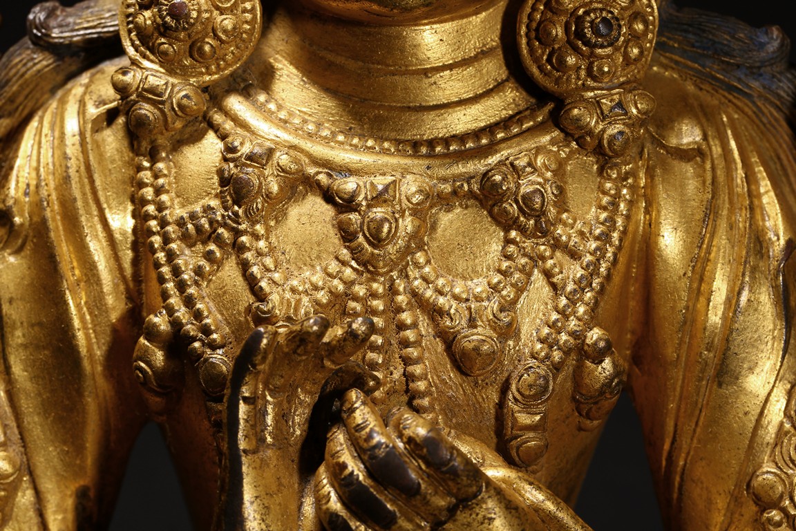 cast seated in dhyanasana on a double-lotus pedestal, the arms raised in dharamcakramudra to the chest, holding two stalks of uptala lotuses rising up the shoulders, the gracefully swaying figure wearing a dhoti falling into elegant pleats, draped with a celestial scarf around the shoulders and arms, the chest and the waist adorned by elaborate beaded necklaces, the face with a benevolent expression, surmounted by a five-leaf diadem around a high chignon, the lotus base incised with a reign mark reading Da Ming Yongle nian shi. Ming Dynasty period.