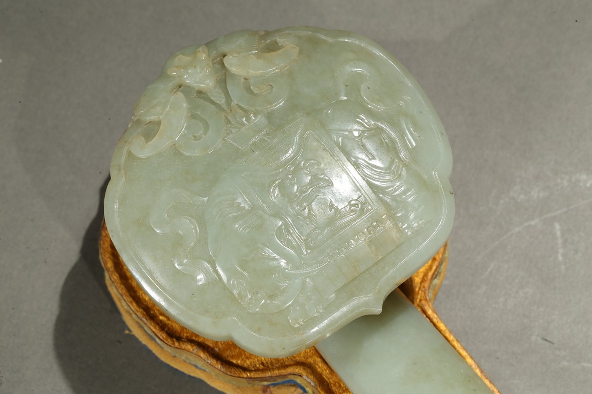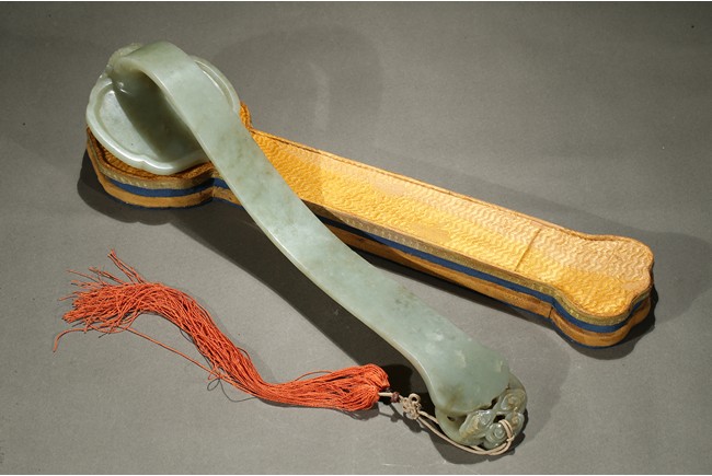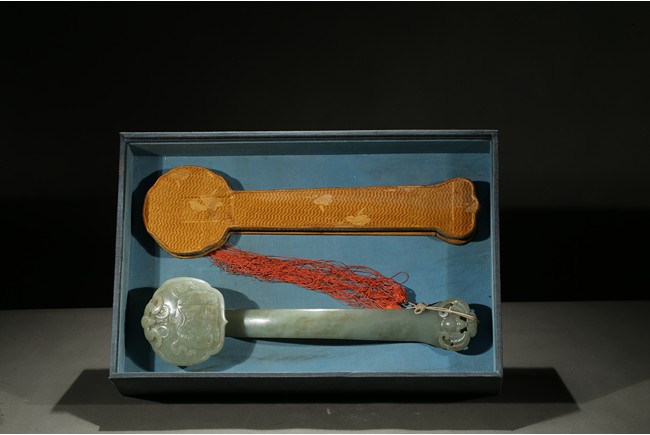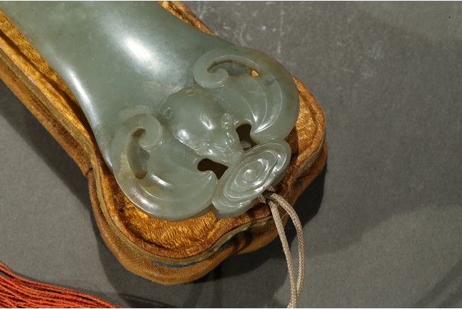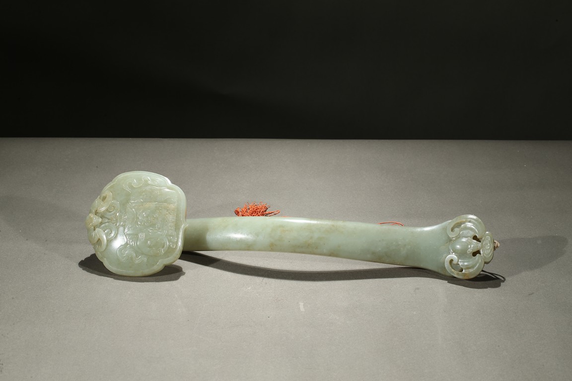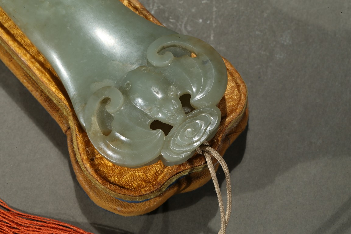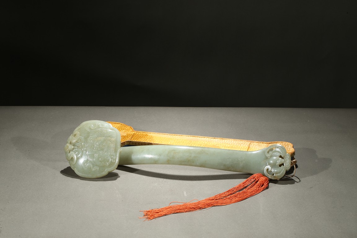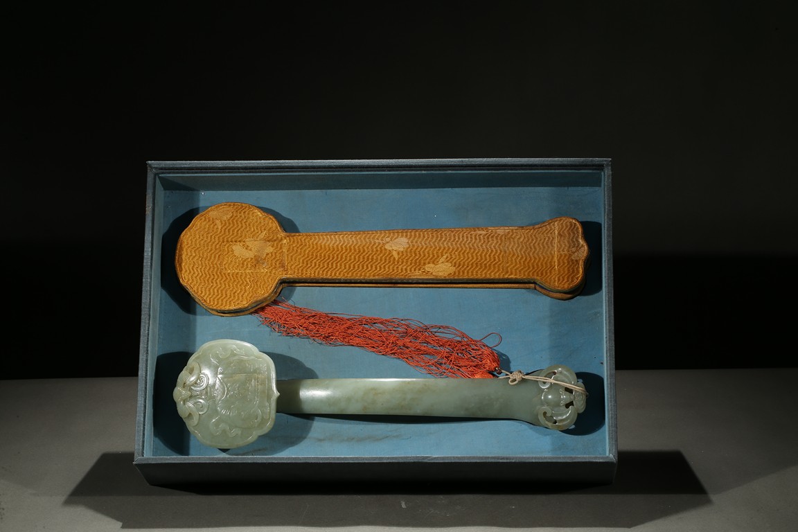 The ruyi scepter head carved elephant and bat in shallow relief, the end of the scepter further carved with a large bat, accompanied with a fitted box. Qing Dynasty period.