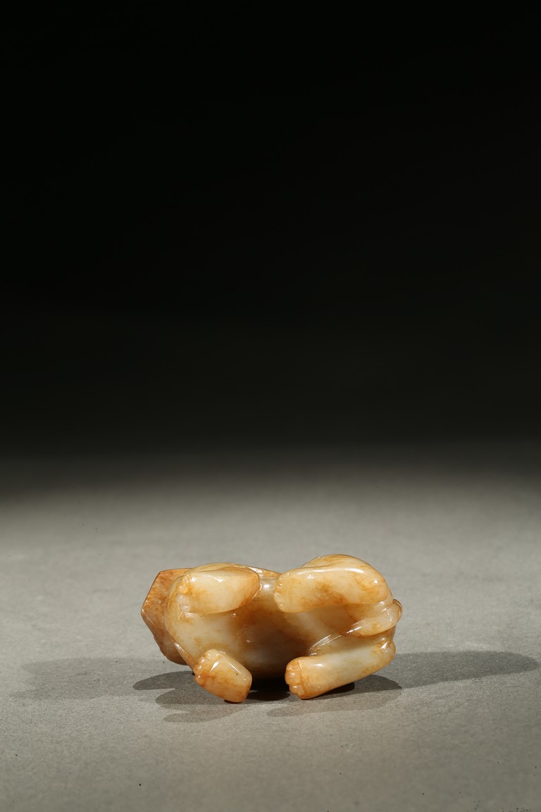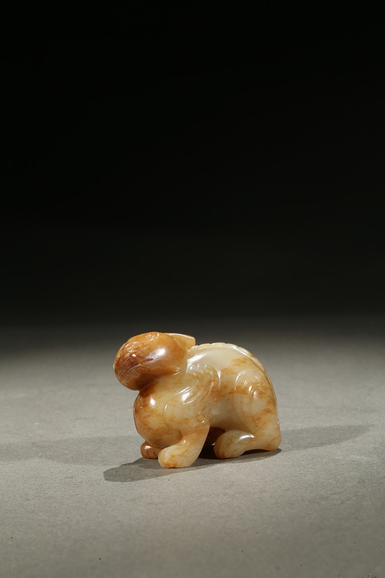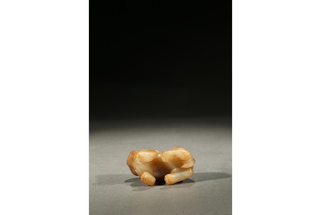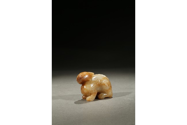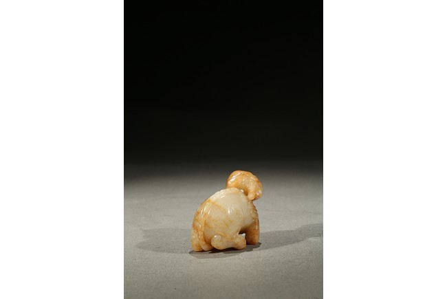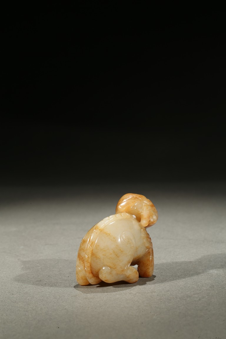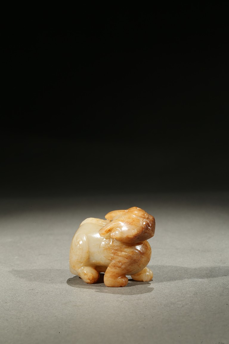 Well worked in the round and detailed with winged haunches, the white tone stone with russet inclusions and veins. Ming Dynasty period.