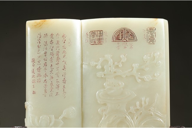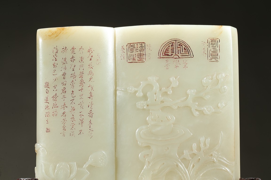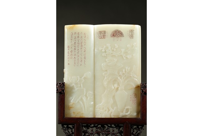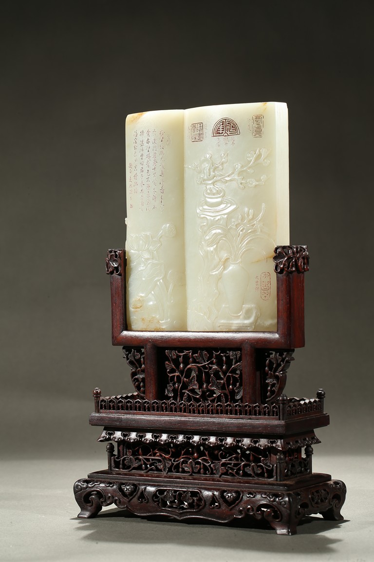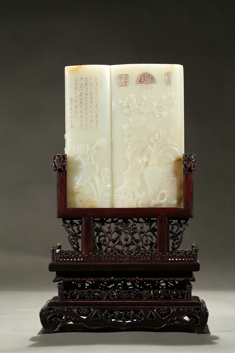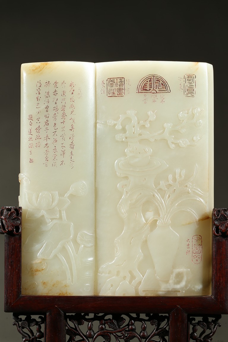 Carved in the form of a folded book, the slightly curved rectangular white jade panel is divided into two parts, one carved in shallow relief with vase containing orchids next to a tall wood trunk stand supporting a plum blossom planter, below three carved seal marks; the other part carved with lotus in shallow relief below running script calligraphy, the reverse further carved with inscription and two seal marks, all supported on elaborately carved and reticulated tierd wood stand. Qing Dynasty period.