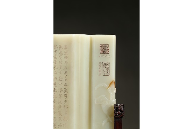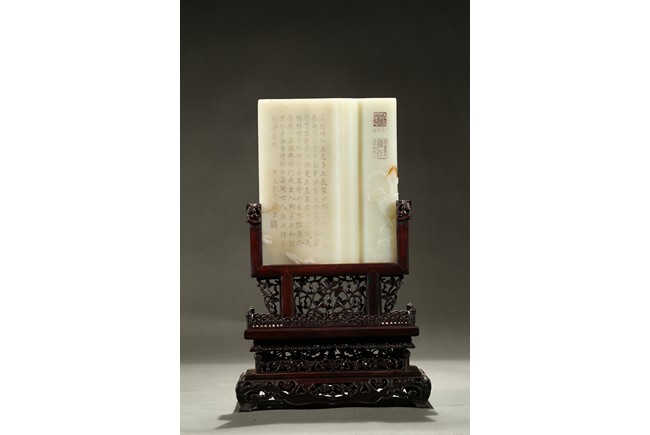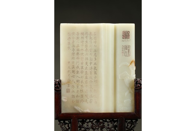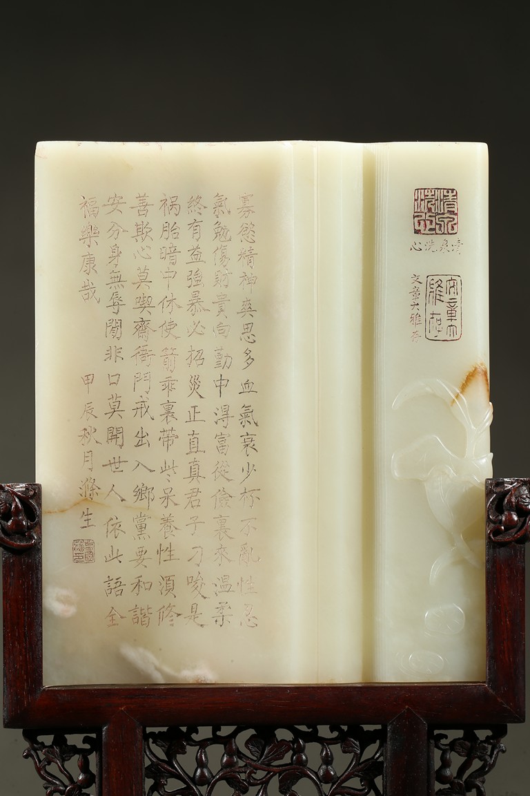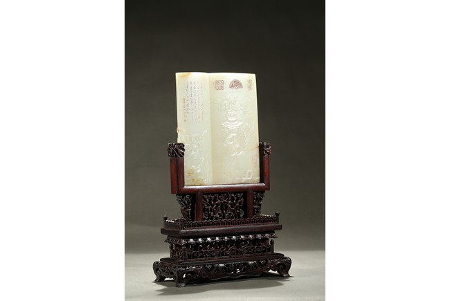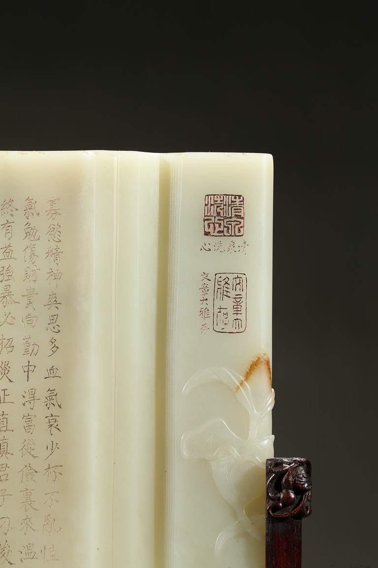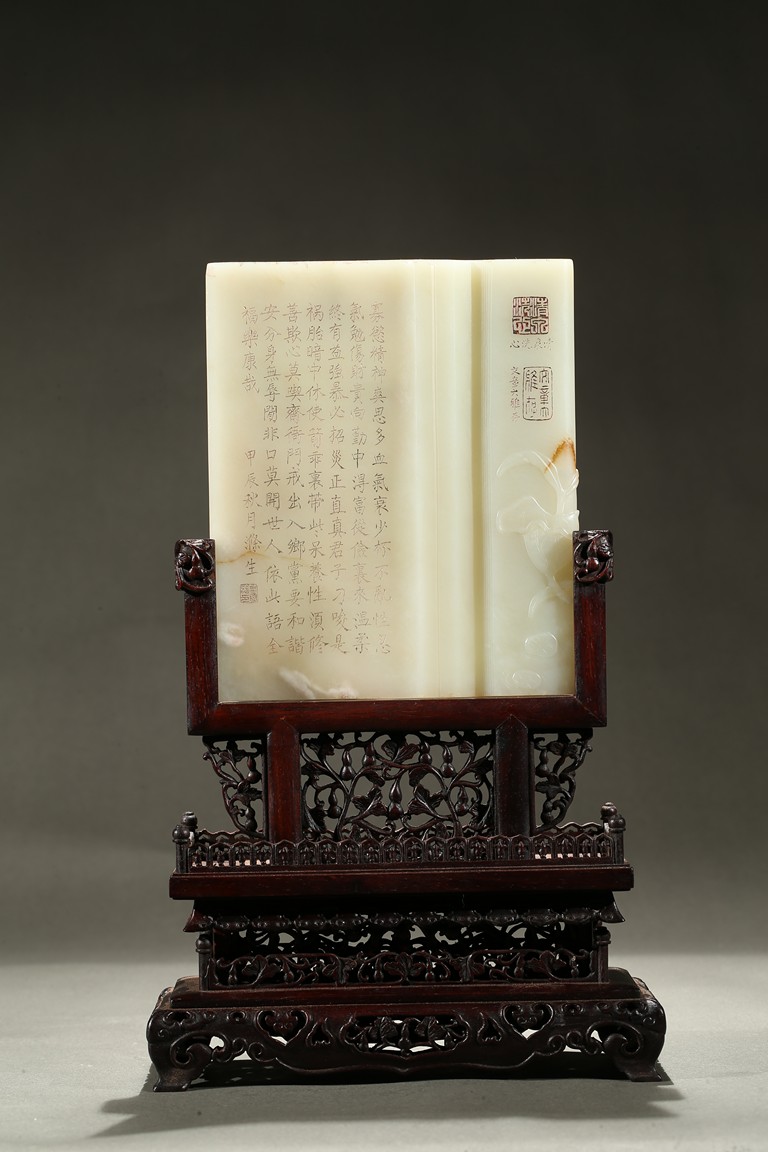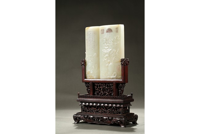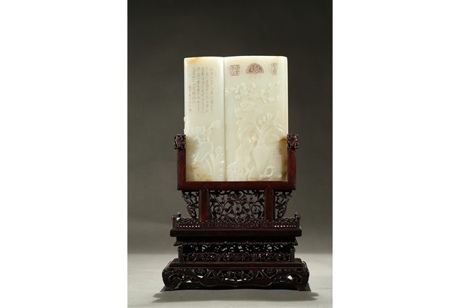 Carved in the form of a folded book, the slightly curved rectangular white jade panel is divided into two parts, one carved in shallow relief with vase containing orchids next to a tall wood trunk stand supporting a plum blossom planter, below three carved seal marks; the other part carved with lotus in shallow relief below running script calligraphy, the reverse further carved with inscription and two seal marks, all supported on elaborately carved and reticulated tierd wood stand. Qing Dynasty period.