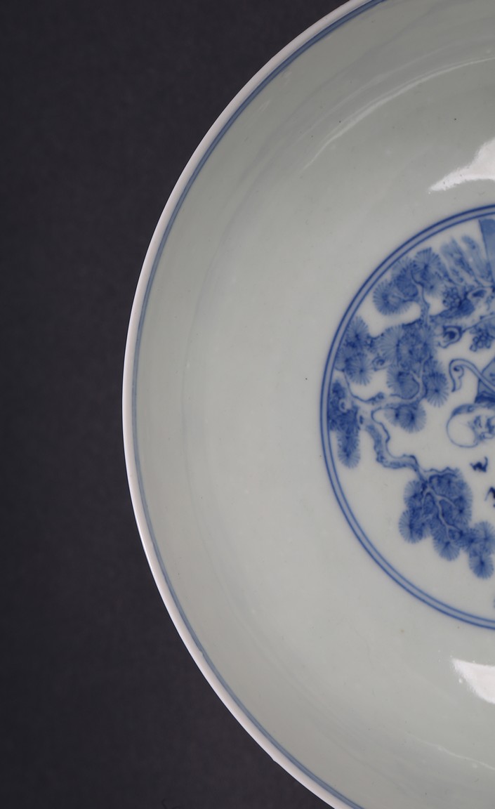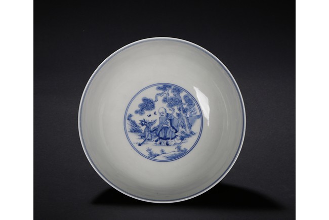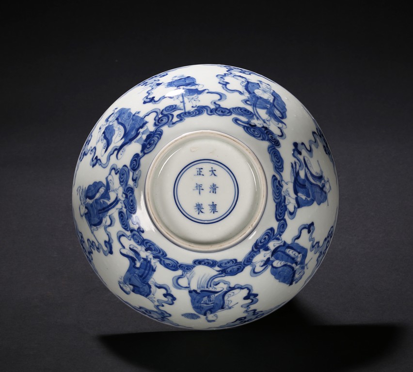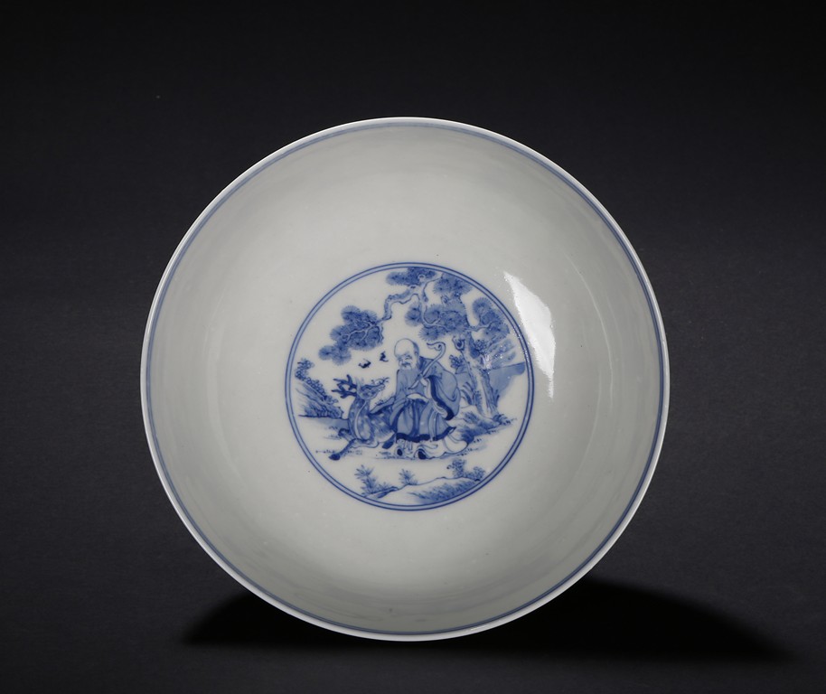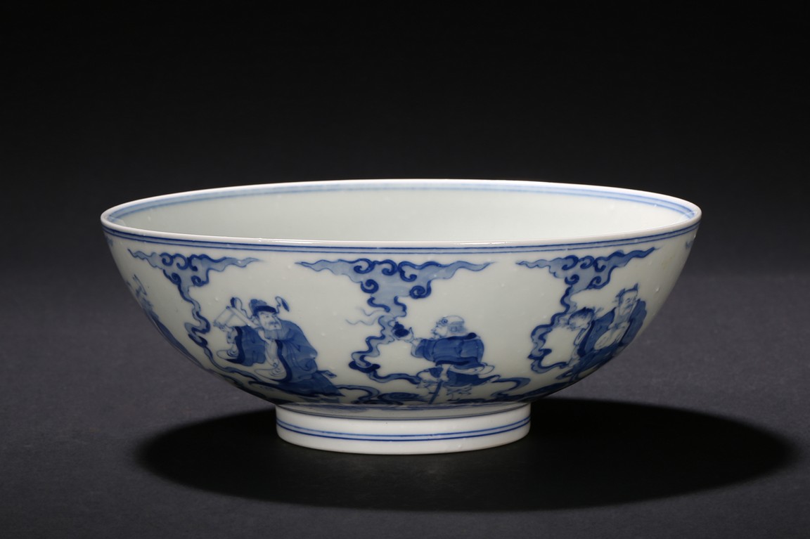 The bowl is decorated on the exterior with the Eight Daoist Immortals shown with their attributes standing amidst vapor atop a wave border. The centre of the interior is decorated with the longevity god with a deer under a tall pine tree, base with six character mark. Qing Dynasty period.
