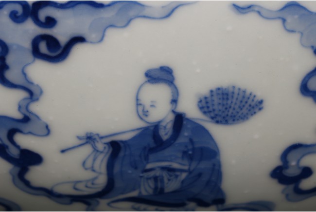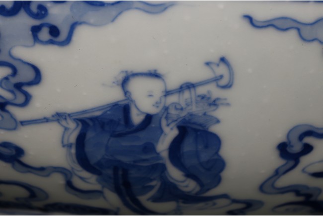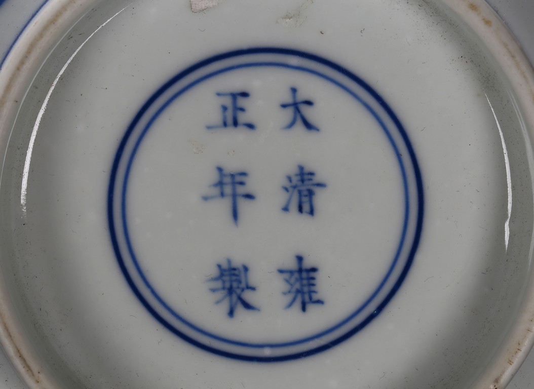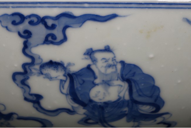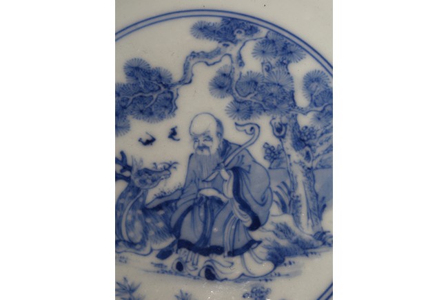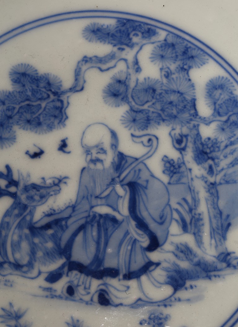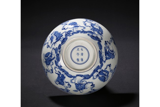 The bowl is decorated on the exterior with the Eight Daoist Immortals shown with their attributes standing amidst vapor atop a wave border. The centre of the interior is decorated with the longevity god with a deer under a tall pine tree, base with six character mark. Qing Dynasty period.