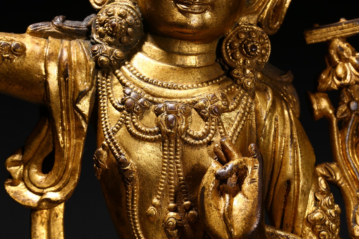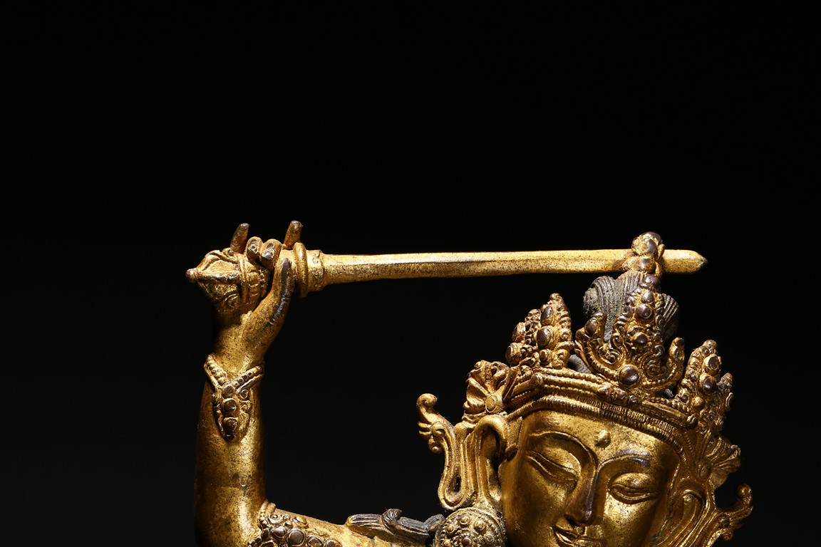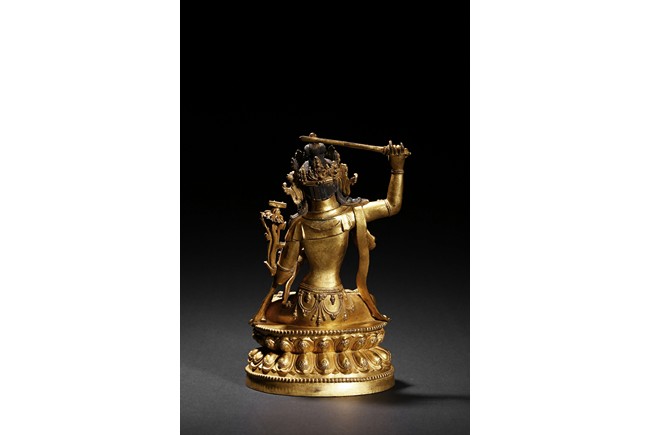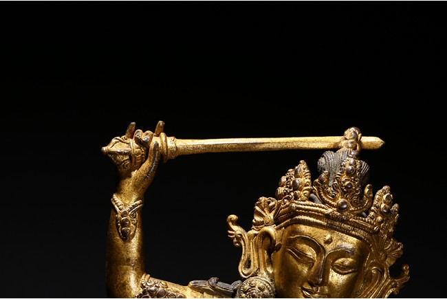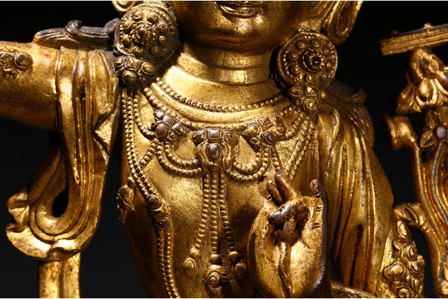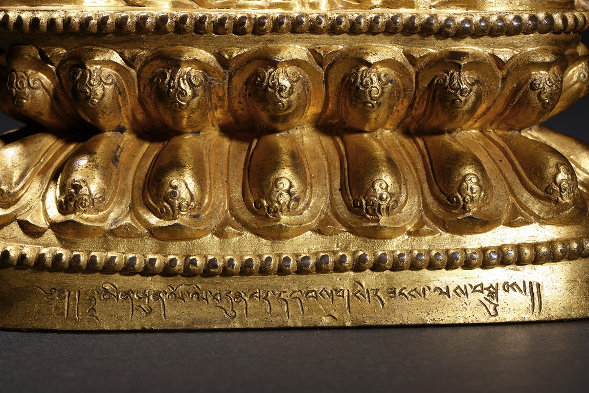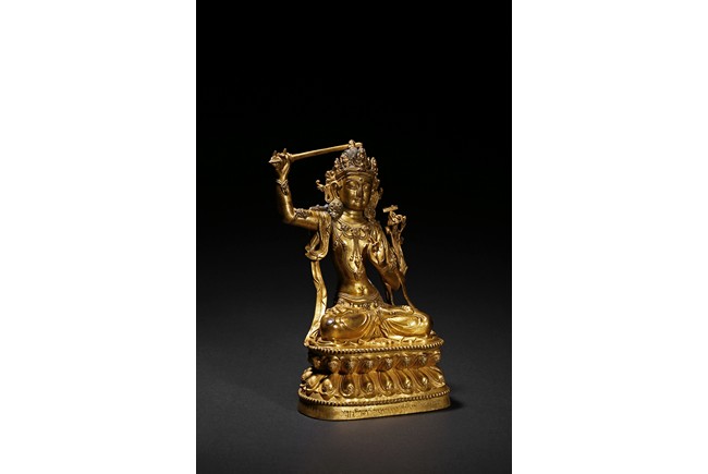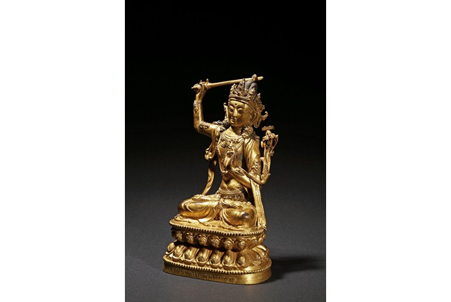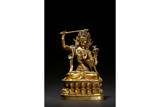 Seated cross-legged on a double lotus throne, with a sword in his raised right hand, his left hand in prithvi mudra, a lotus rising to his left with a stylized sutra on top, a double vajra mark on base.