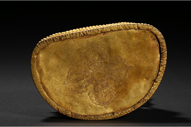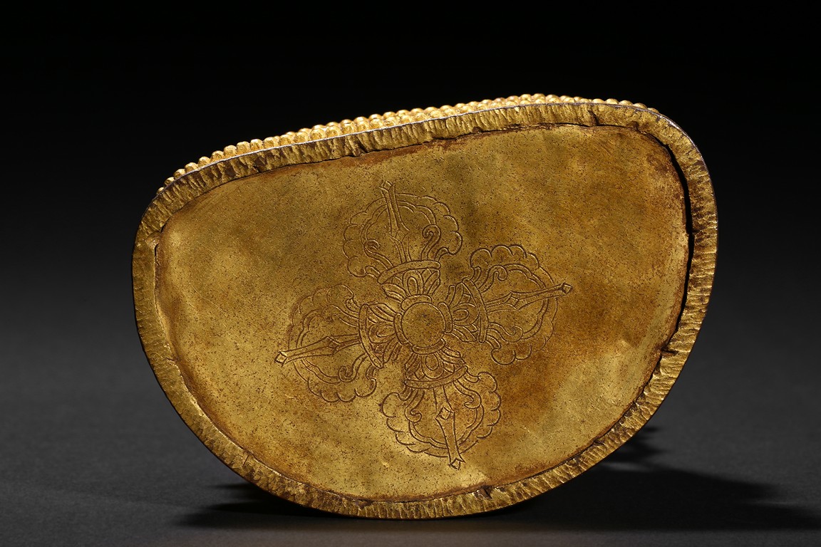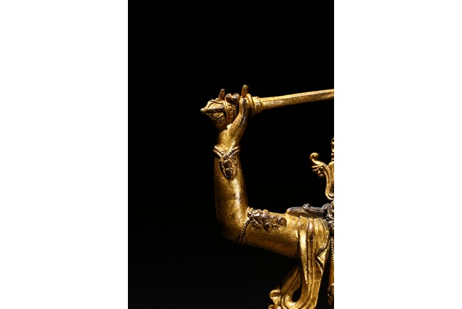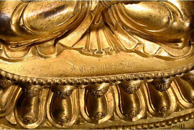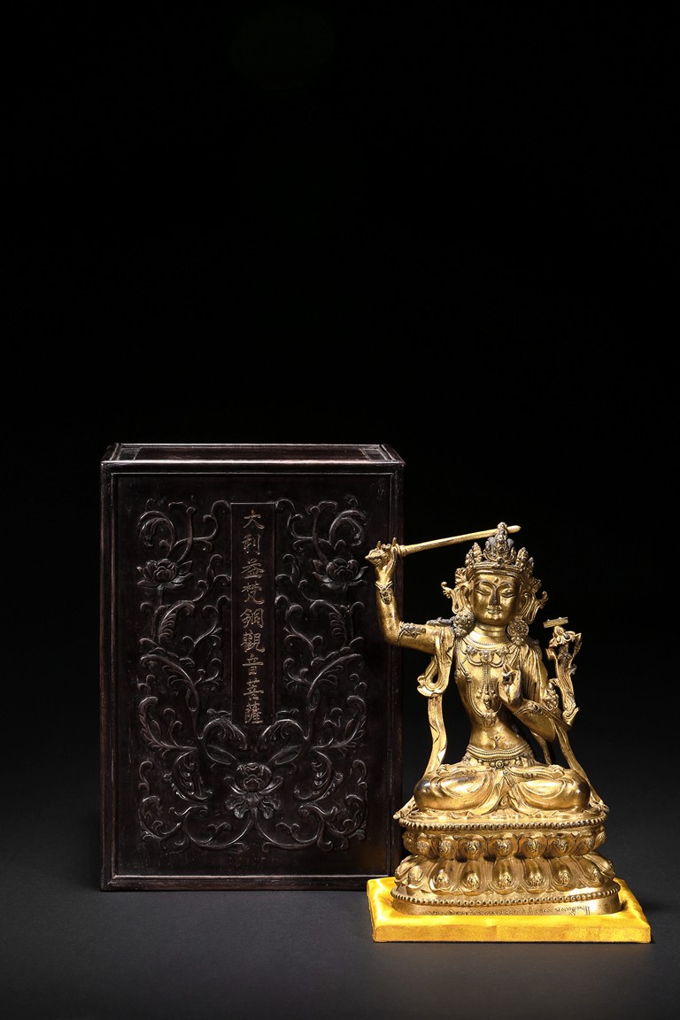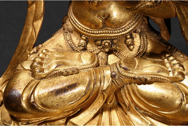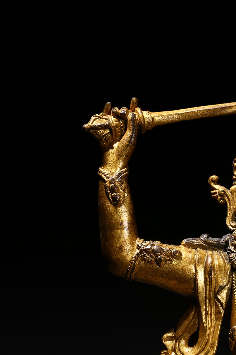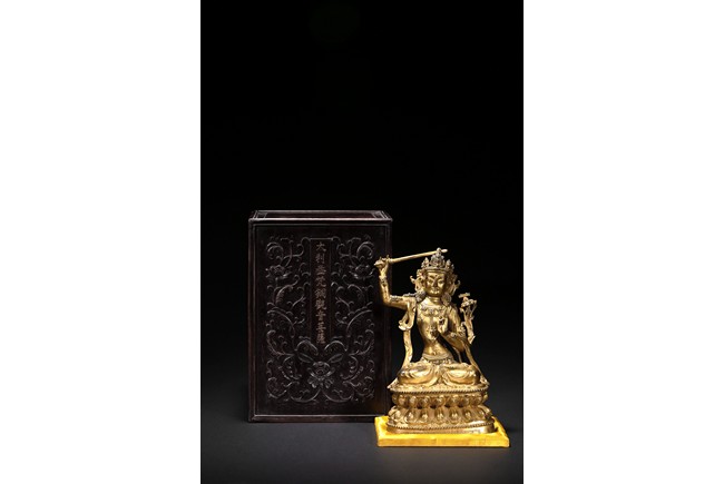 Seated cross-legged on a double lotus throne, with a sword in his raised right hand, his left hand in prithvi mudra, a lotus rising to his left with a stylized sutra on top, a double vajra mark on base.
