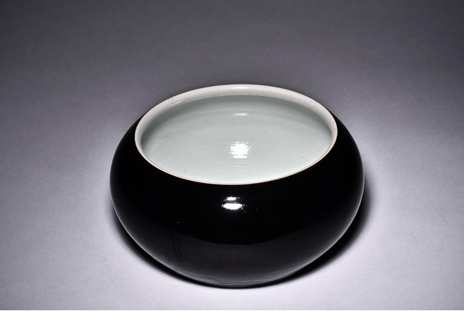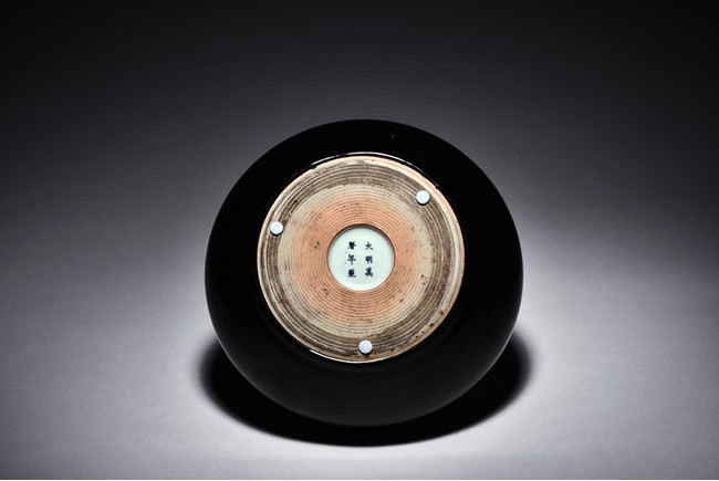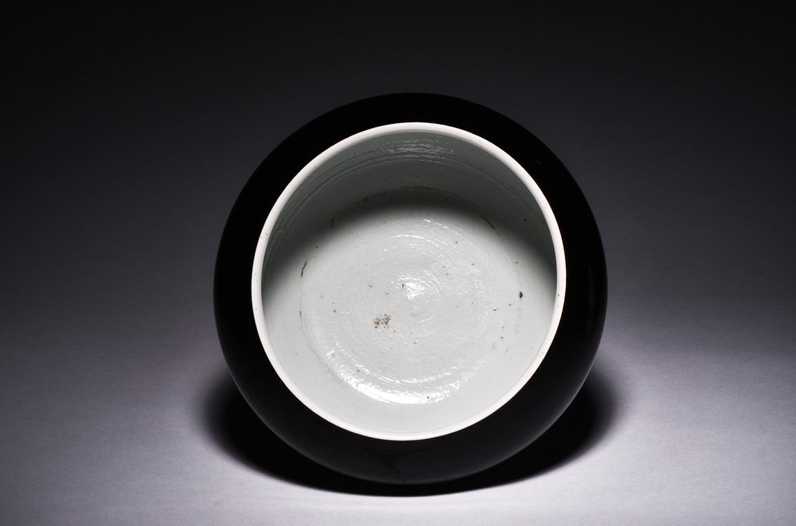 The finely potted jar is of compressed globular form and raises on a ribbed unglazed base, the rounded body rises to inward-curving mouth rim, the exterior covered overall in mirror black tone glaze and stopping neatly above the foot ring. The base bears six character 'WANLI' mark. Qing Dynasty period.