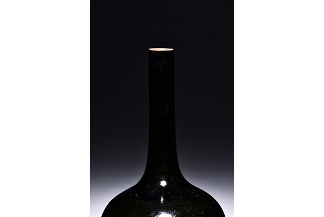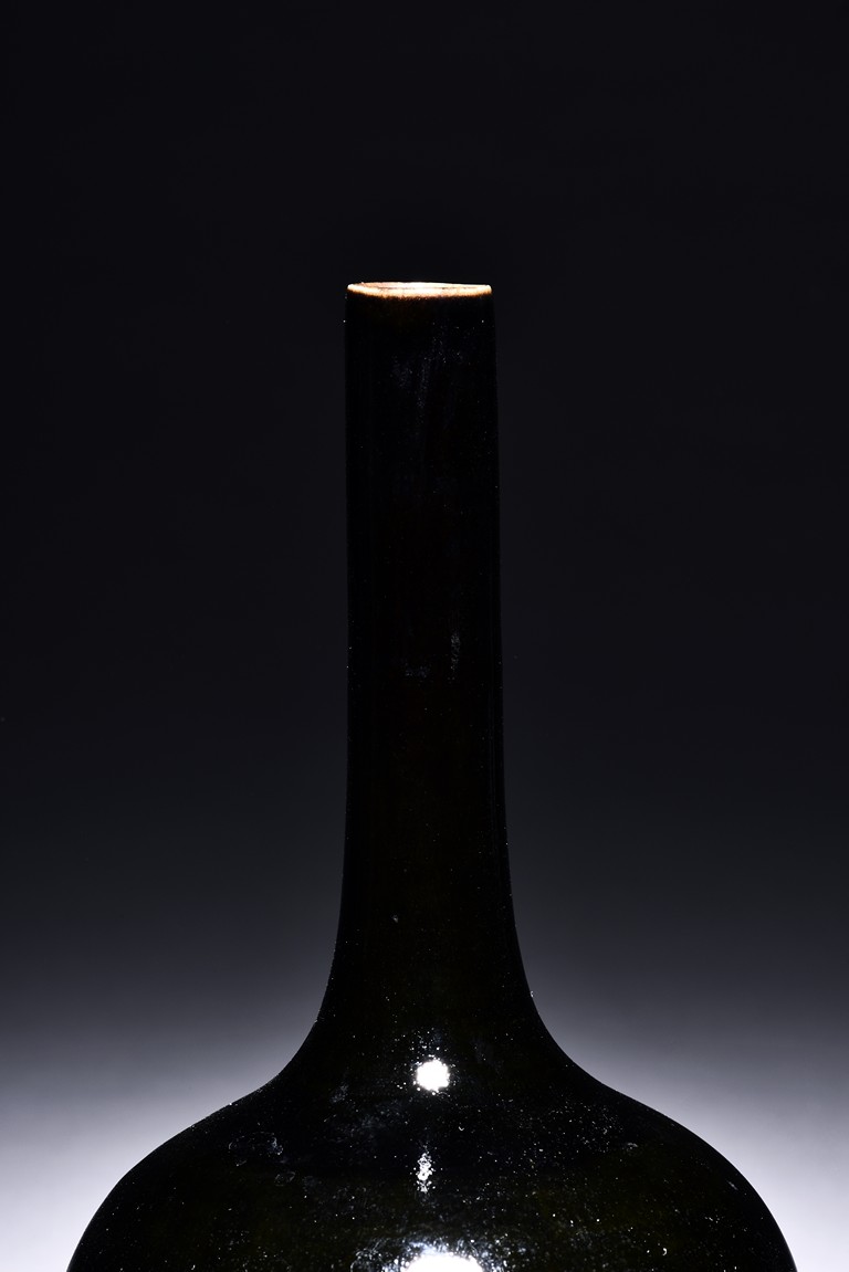 Modelled in the form of bulbous body and rises to a slender long neck, it is overall covered with luminous mirror black glaze. Qing Dynasty period.