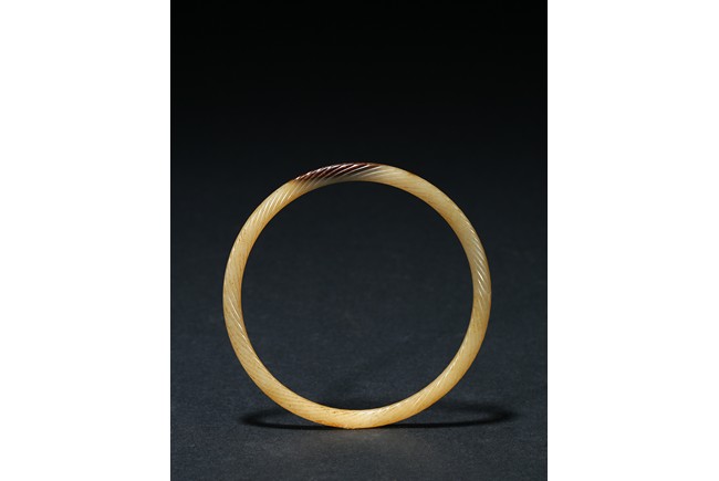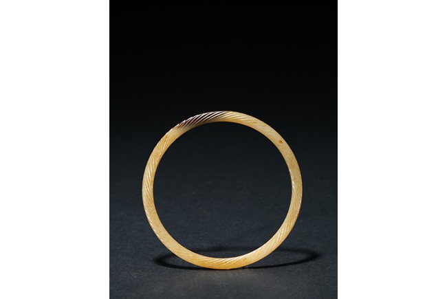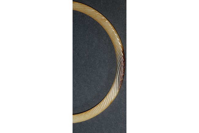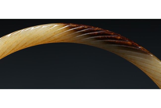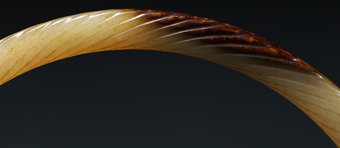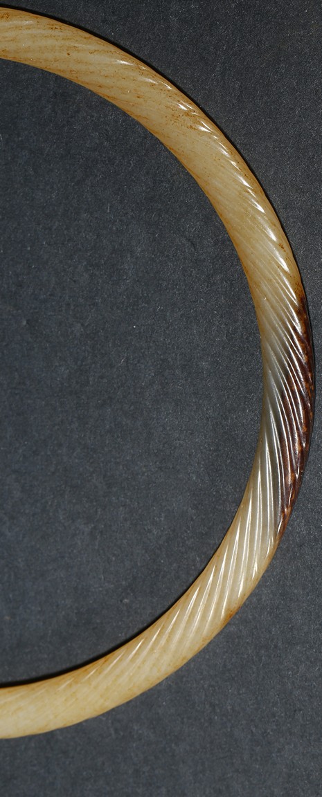 Of circular form, exquisitely carved with twisted rope design, the stone displaying a pale white tone with dark russet area. Warring State period.