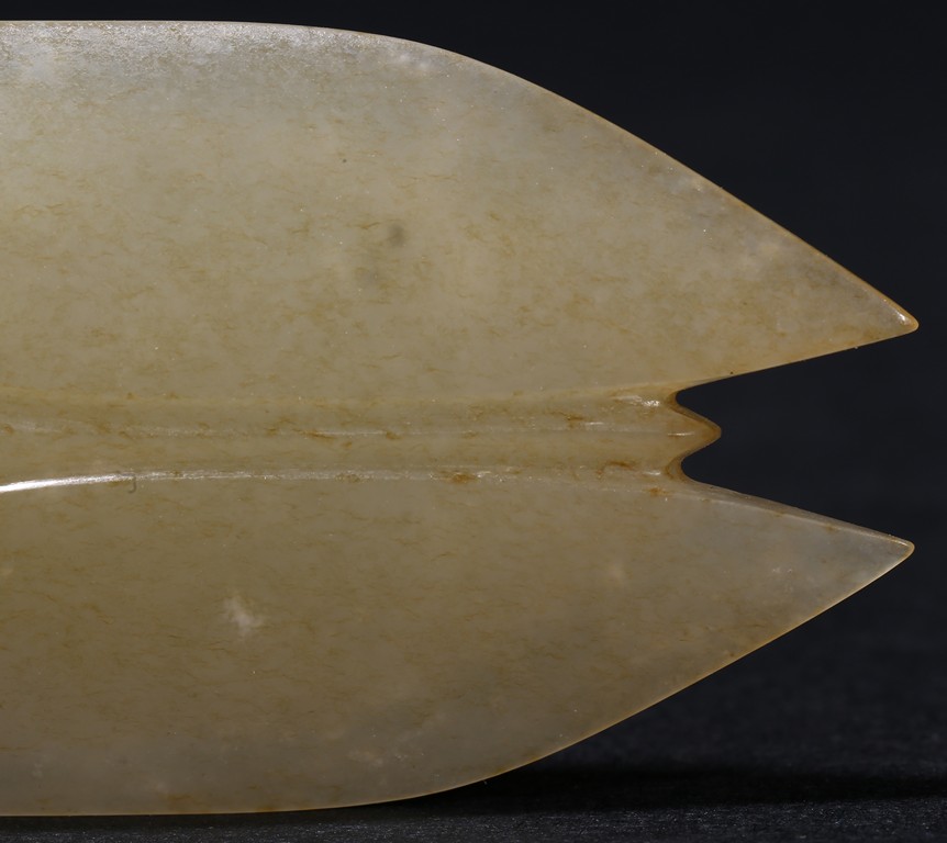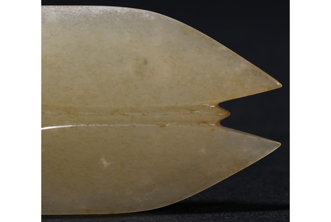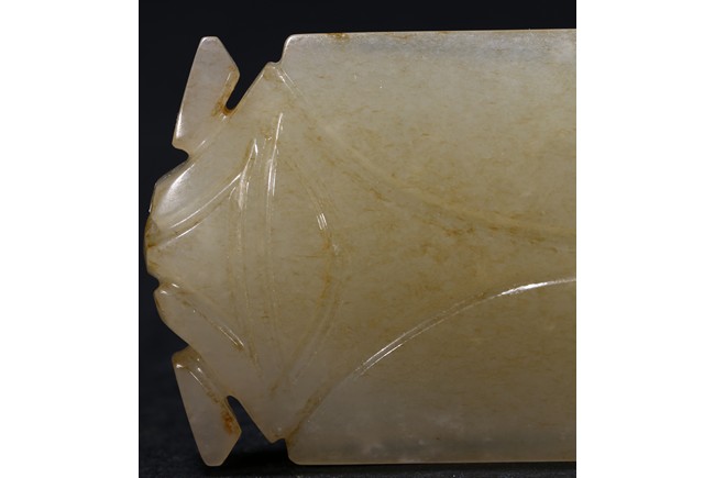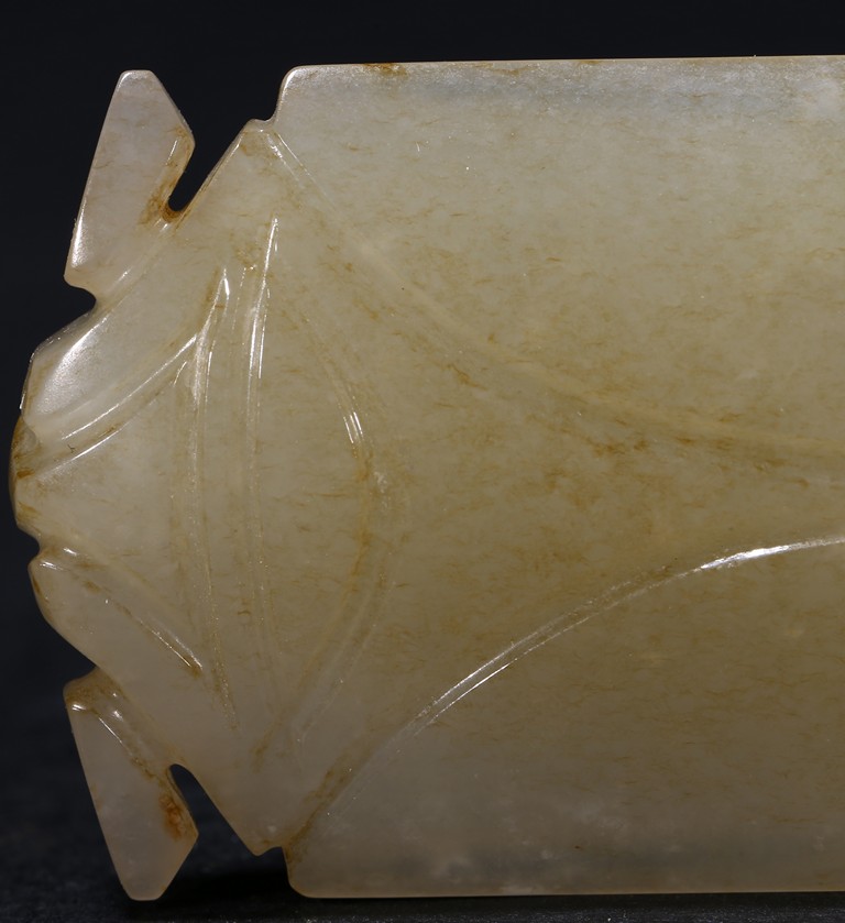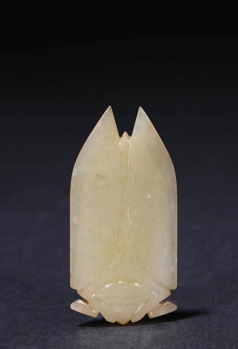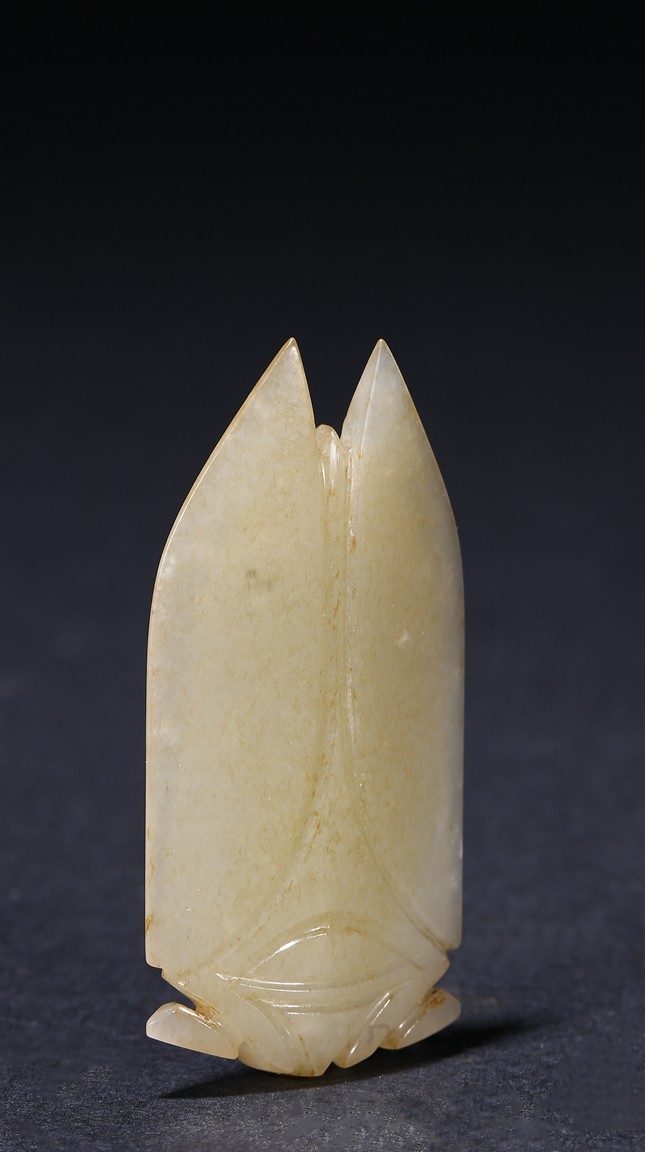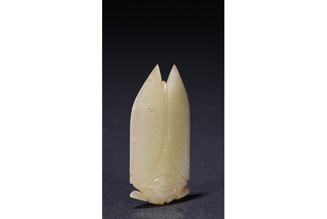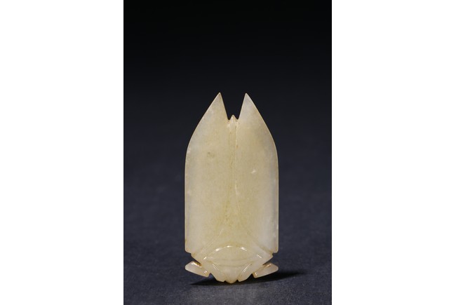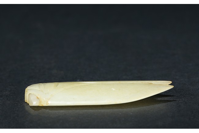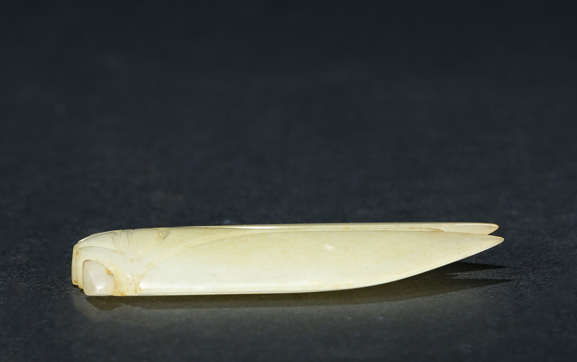 Modelled in the form of a stylised cicada with incised details, the softly polished stone of an even pale celadon color. Han Dynasty period.