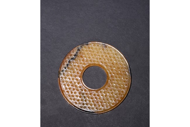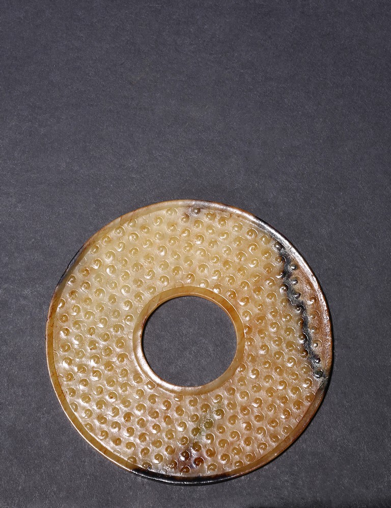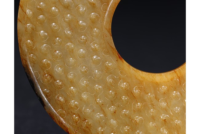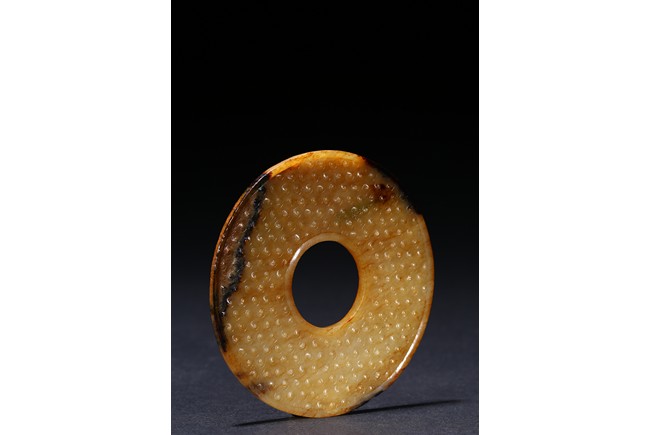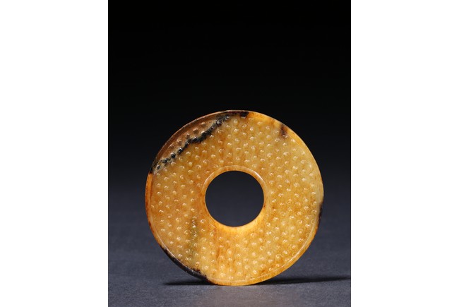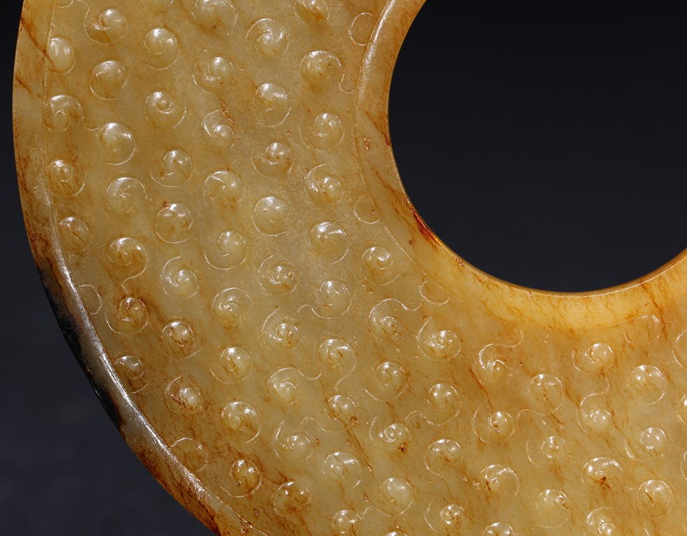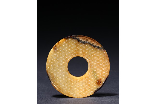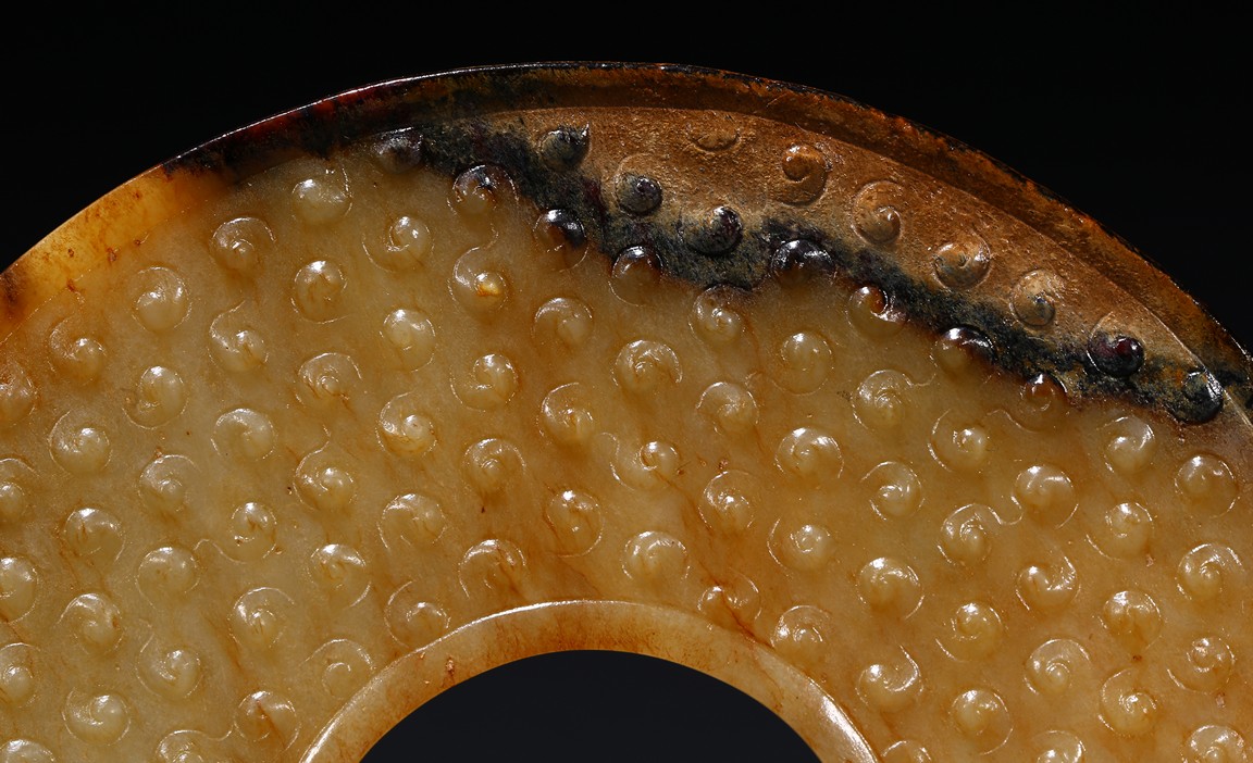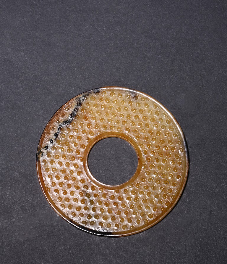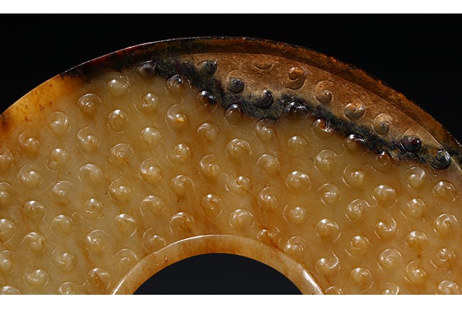 The translucent yellow and russet stone carved in the form of a circular disc with beaded edges around the interior and exterior circle, the surface carved with dense rows of raised spirals, one side with black tone inclusions and calcification. Warring State period.