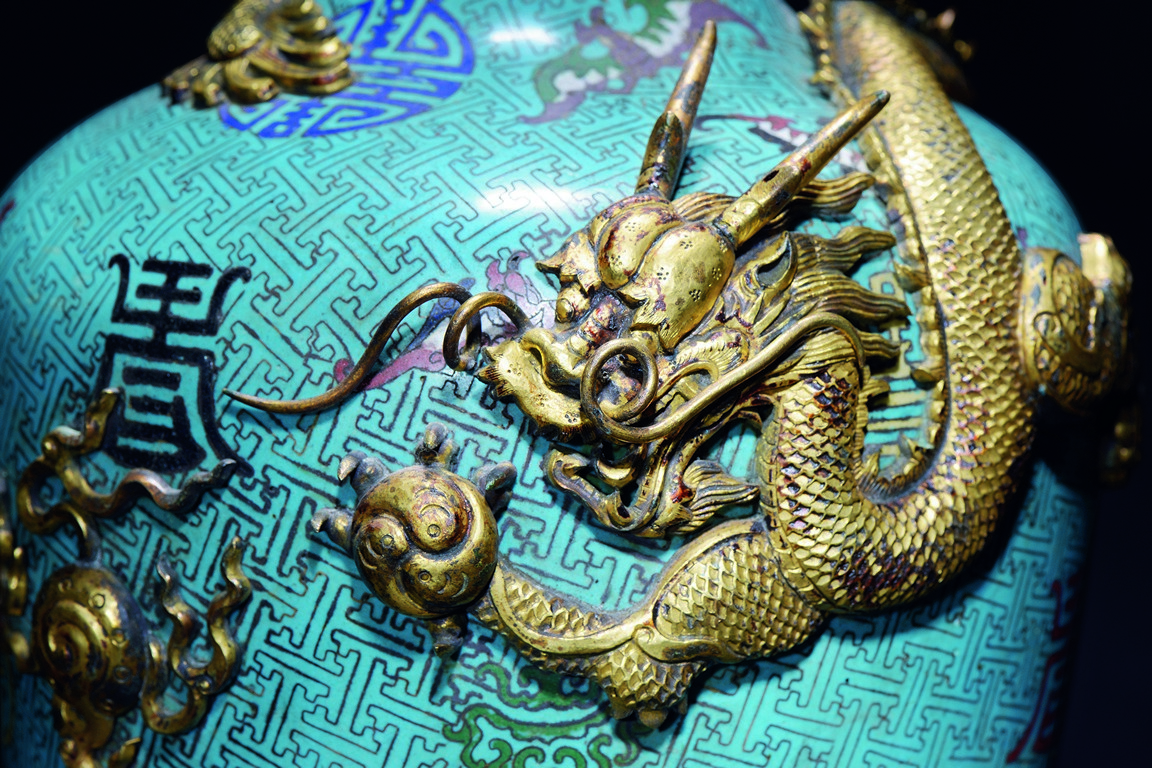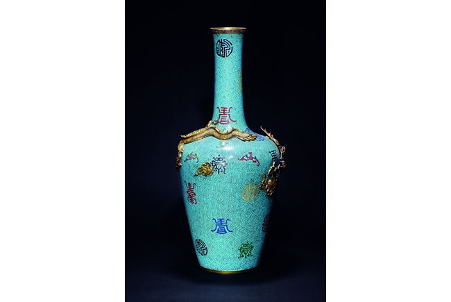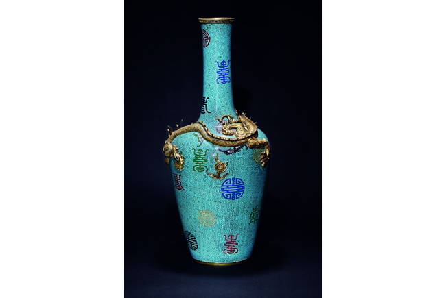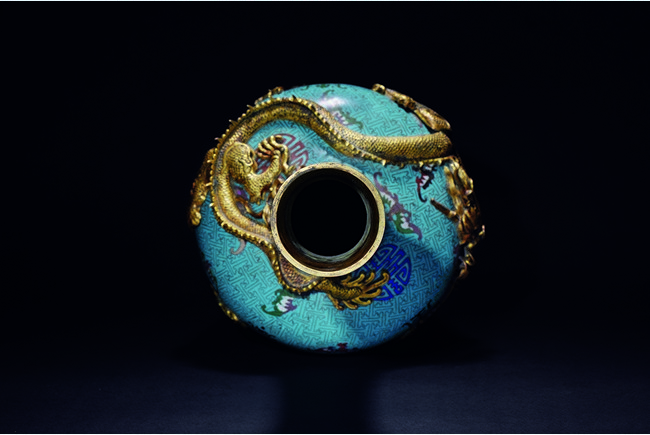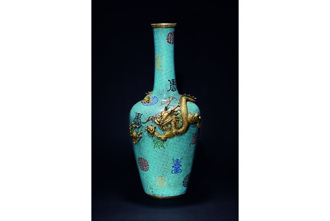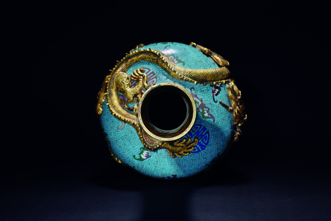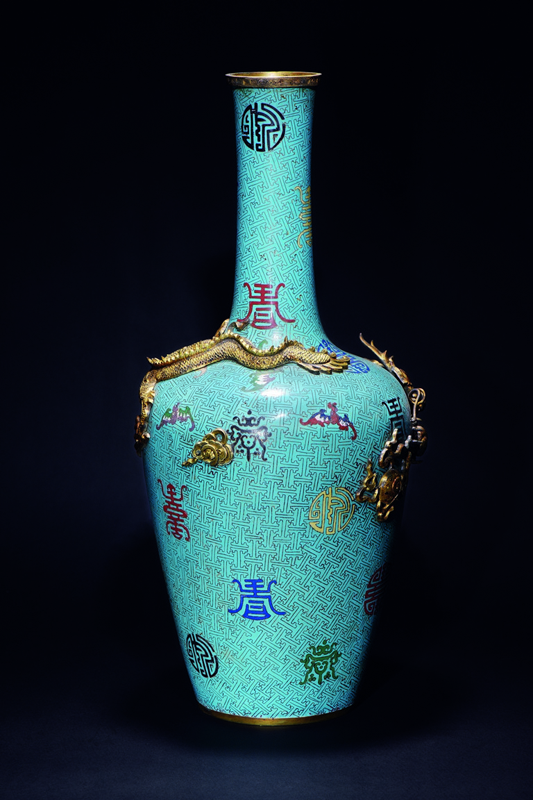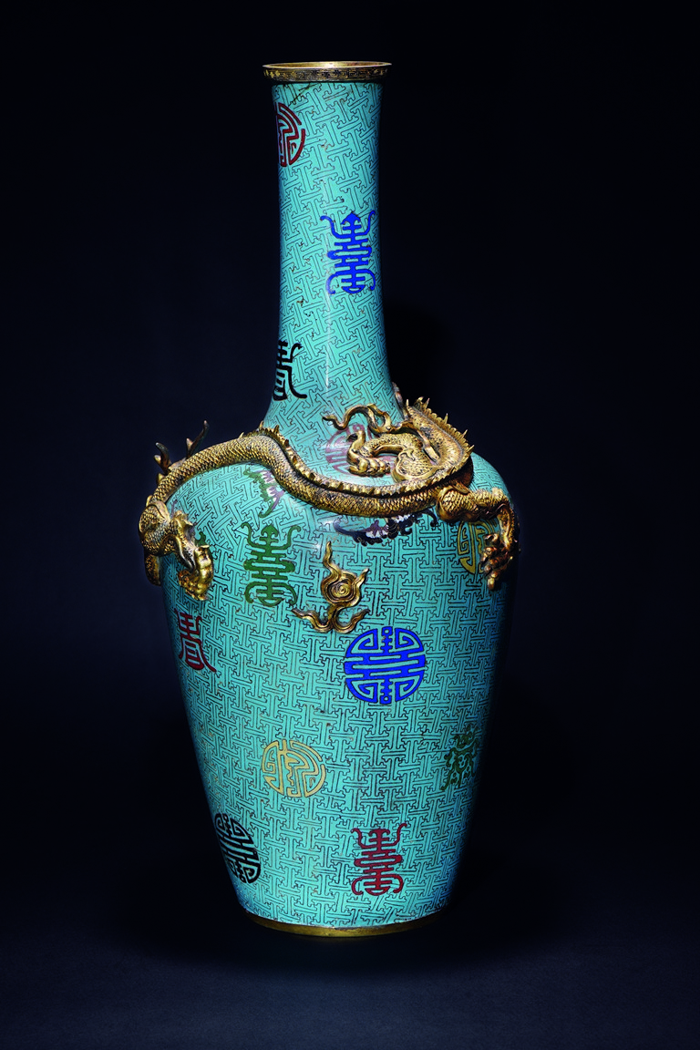 The vase is finely modelled with a powerful gilt-bronze dragon in chase of flaming pearl in high relief on the body, the exterior overall decorated with stylized shou characters and auspicious bats reserved on dense geometric pattern and turquoise ground. The base with four character QIANLONG mark.