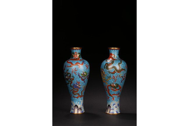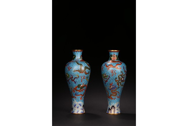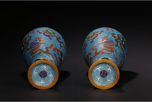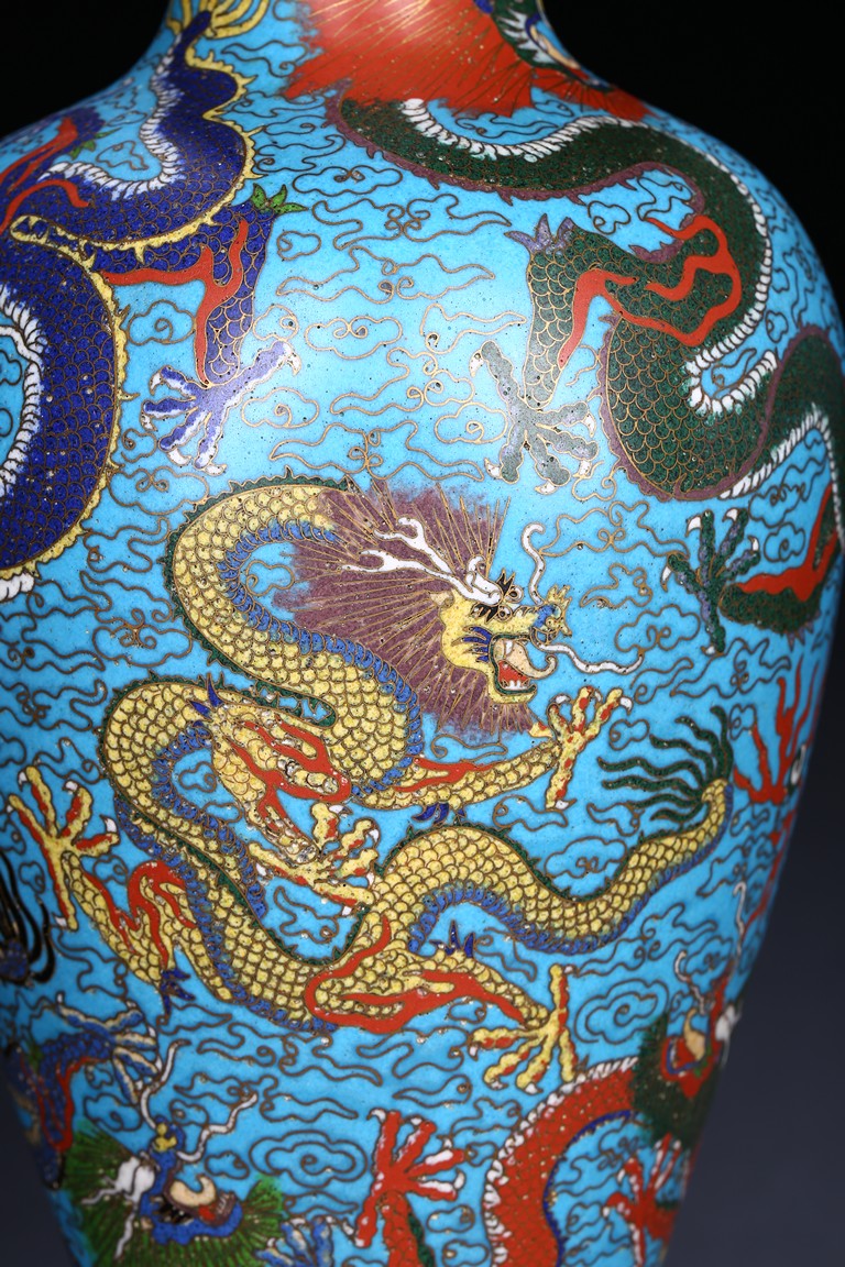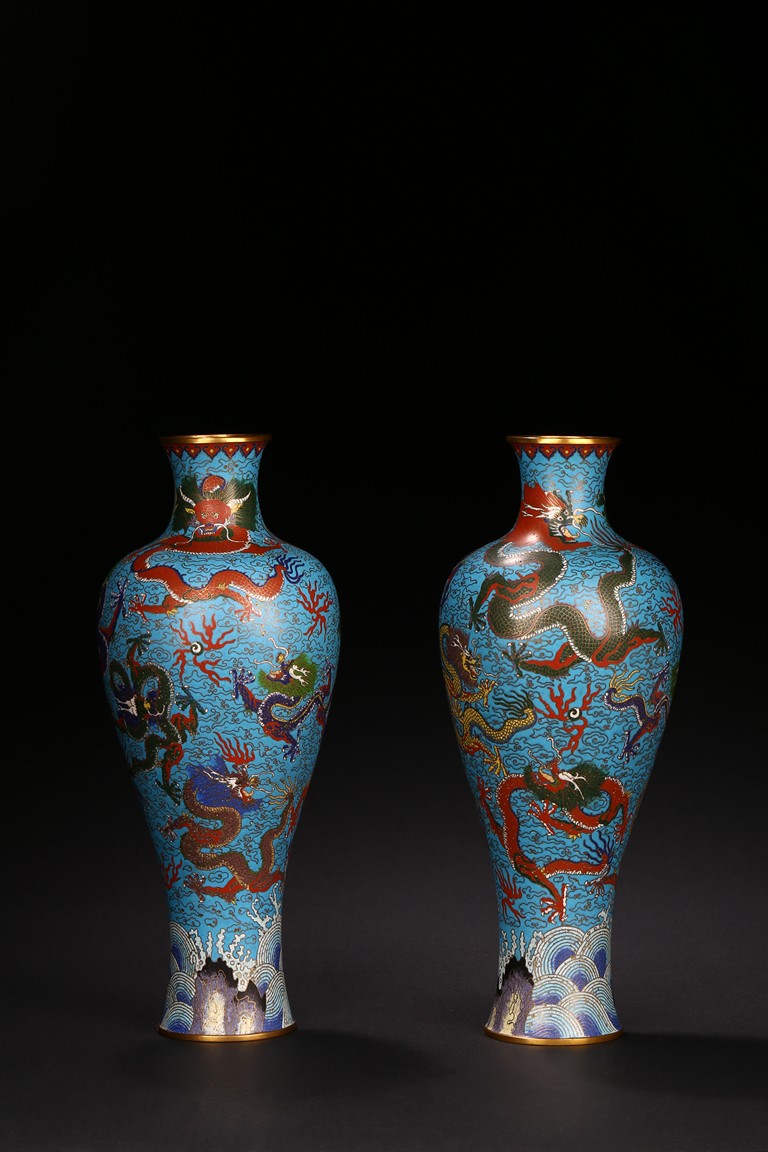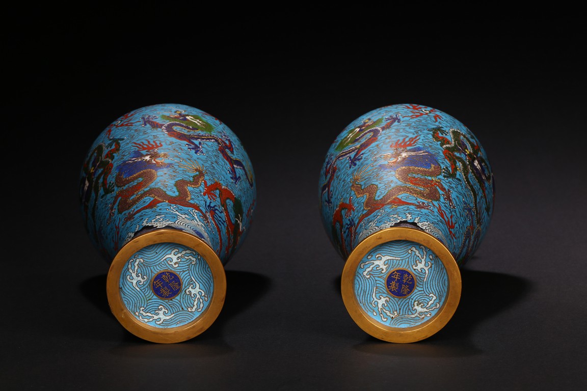 Of slender pear shape, each vase finely enamelled with nine writhining dragons emerging from ocean and above sacred mountain amidst auspicious clouds, all reserved on turquoise ground, the base with four character QIANLONG mark. Qing Dynasty period.