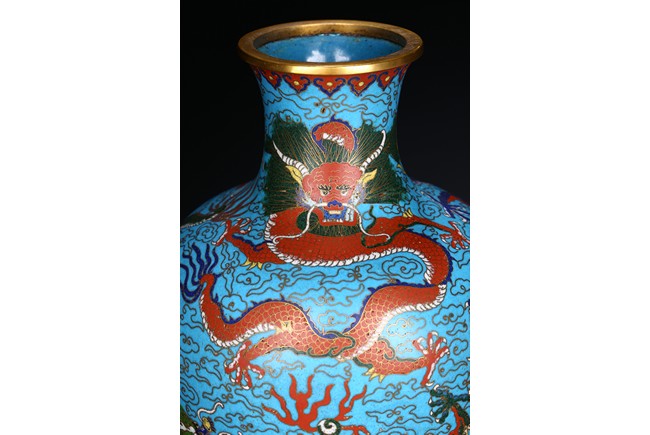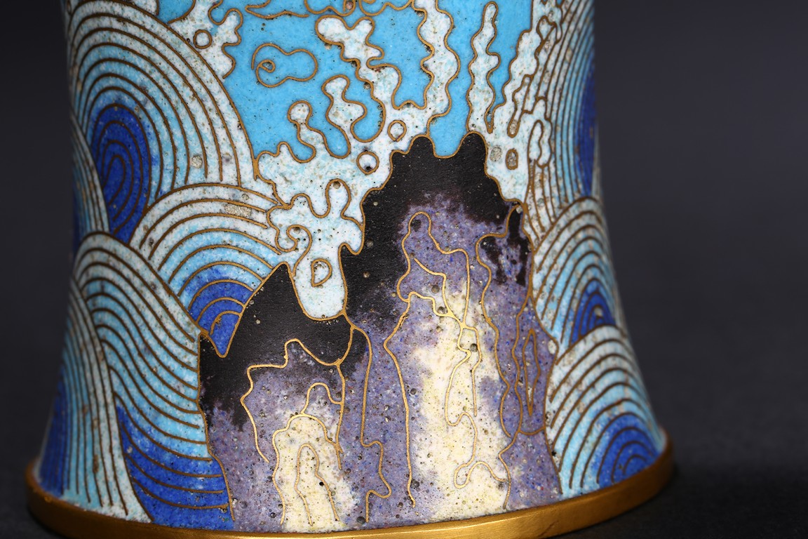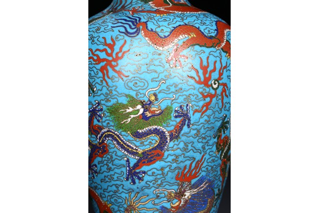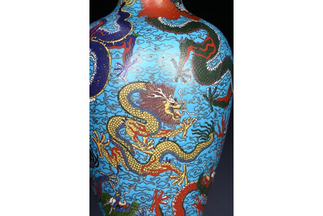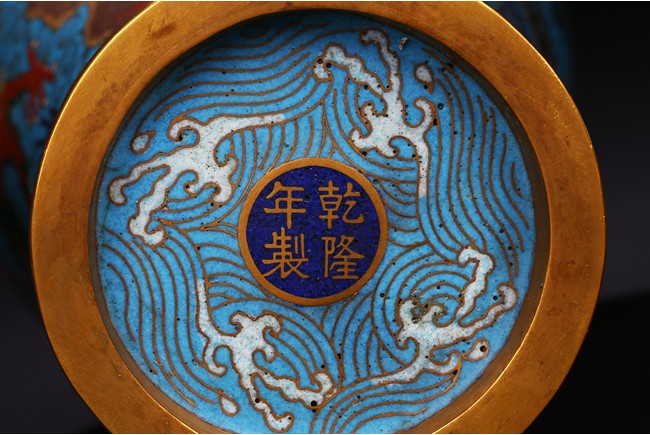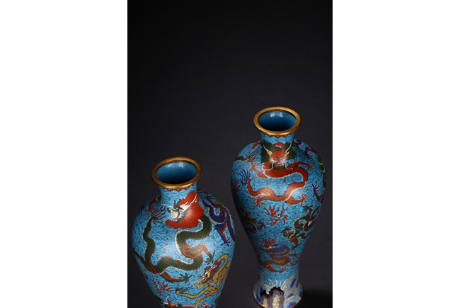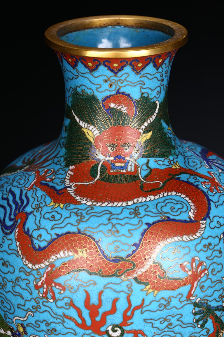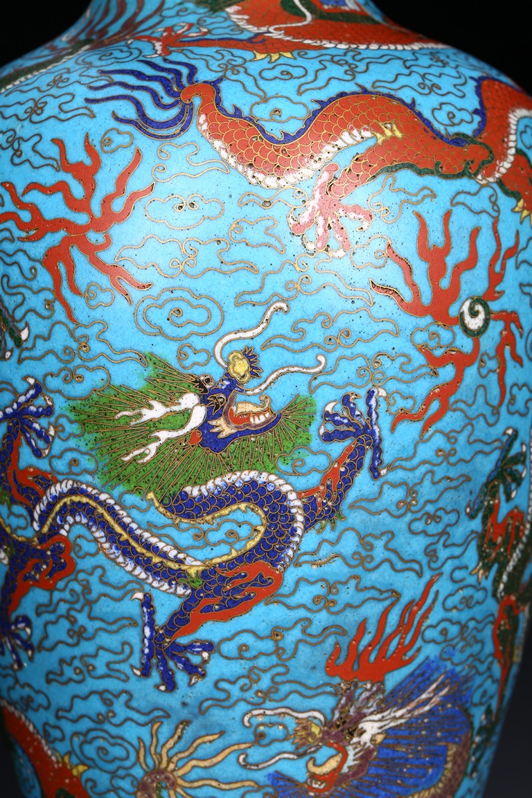Of slender pear shape, each vase finely enamelled with nine writhining dragons emerging from ocean and above sacred mountain amidst auspicious clouds, all reserved on turquoise ground, the base with four character QIANLONG mark. Qing Dynasty period.