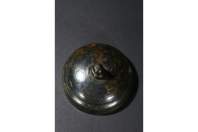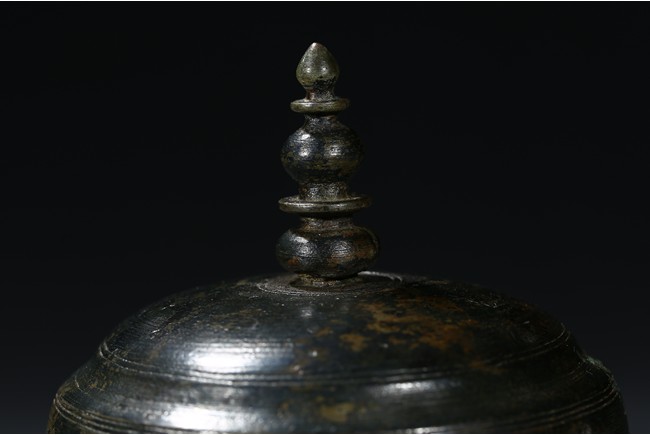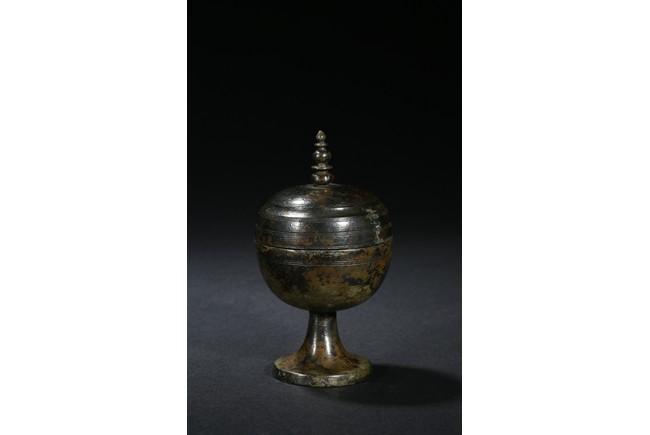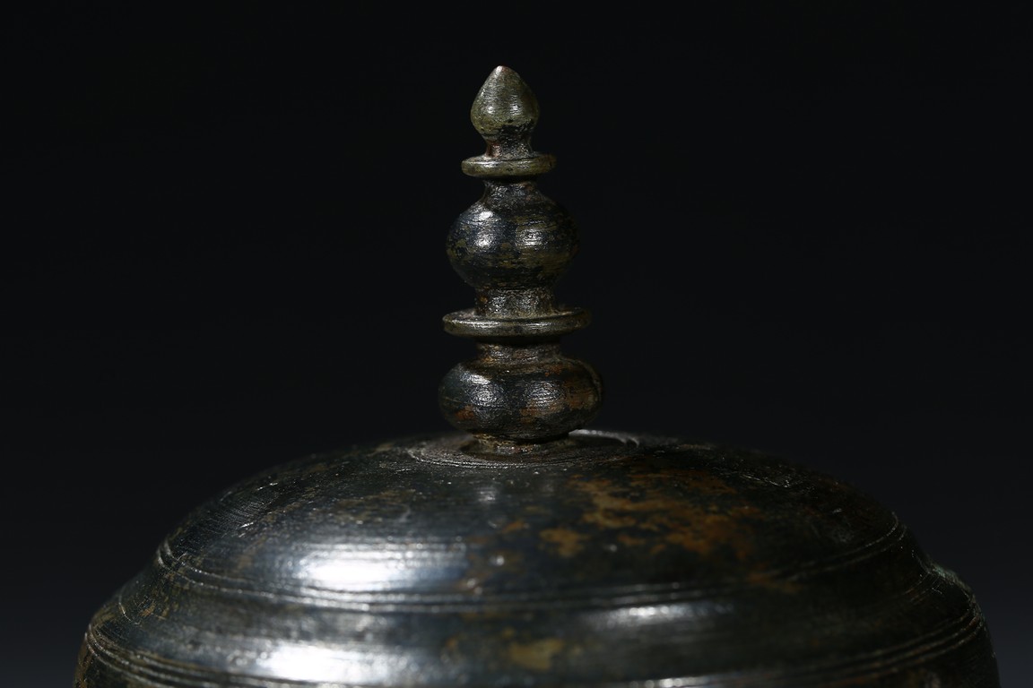 The rounded vessel raised on a spreading pedestal foot, with concentric lines decorated around the body, the cover surmounted with a three bead pagoda-shape finial, with slight pale green patina. Tang Dynasty period.