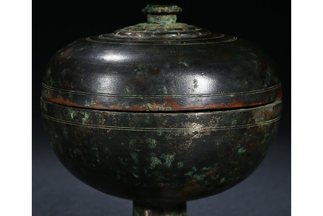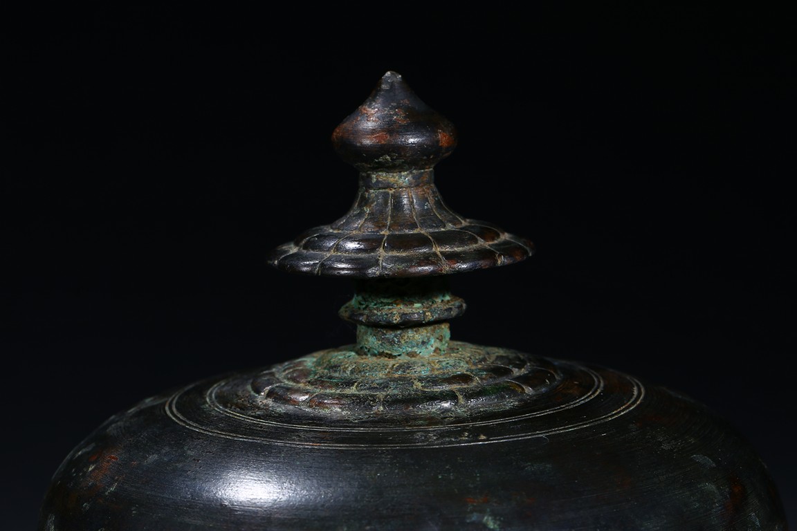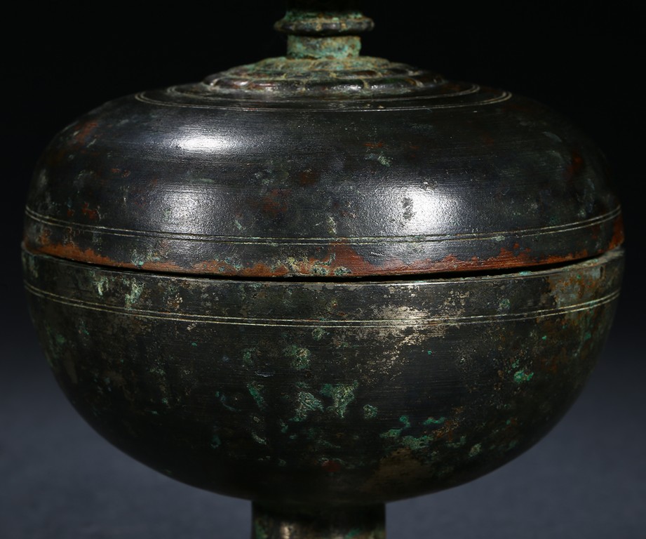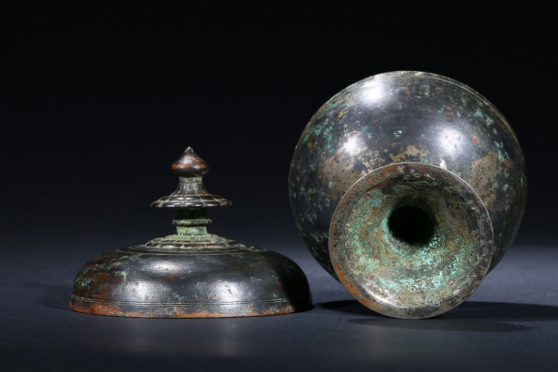 The rounded vessel raised on a spreading pedestal foot, with concentric lines decorated around the body, the cover surmounted with a lotus petal pagoda-shape finial, with slight pale green patina. Tang Dynasty period.