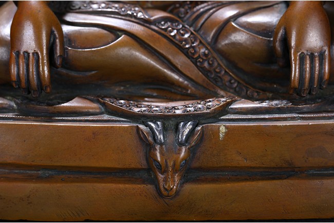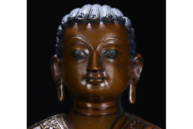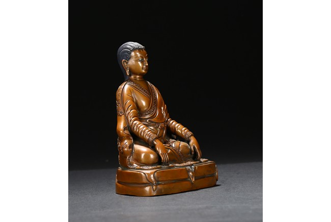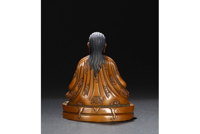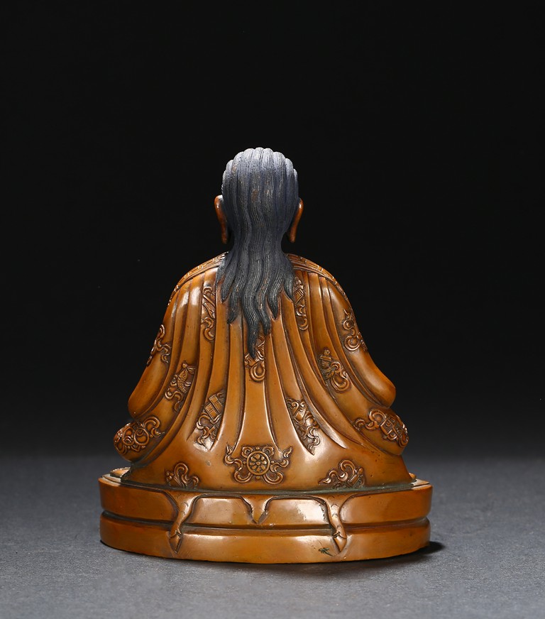 Seated with both hands in his characteristic earth-touching mudra wearing numerous layers of clothing, his eyes with a piercing expression and his long hair swept back and falling in tresses down his back. Qing Dynasty period.