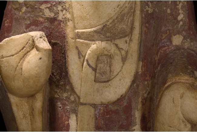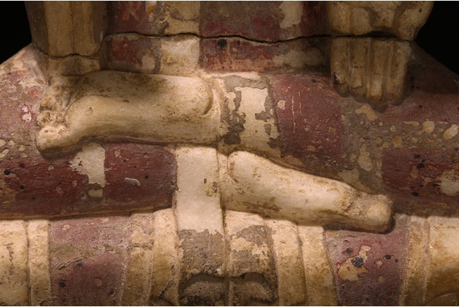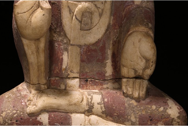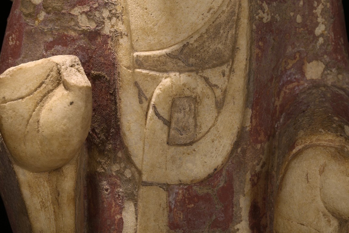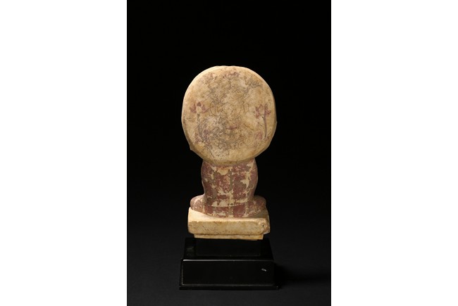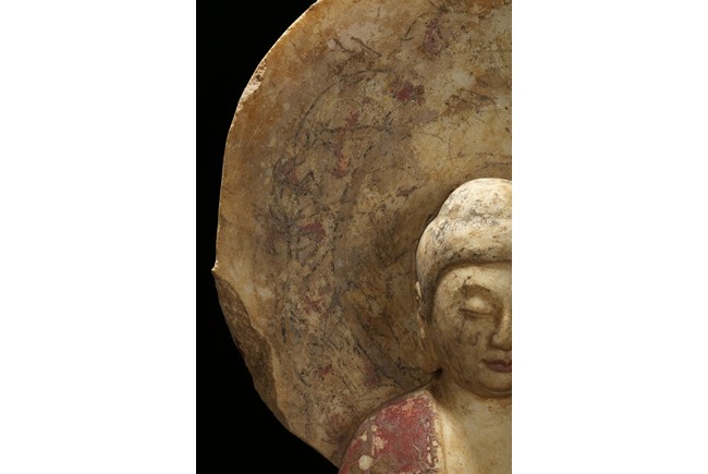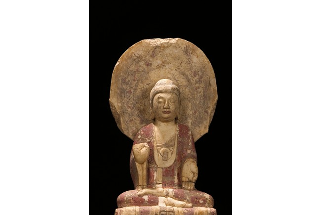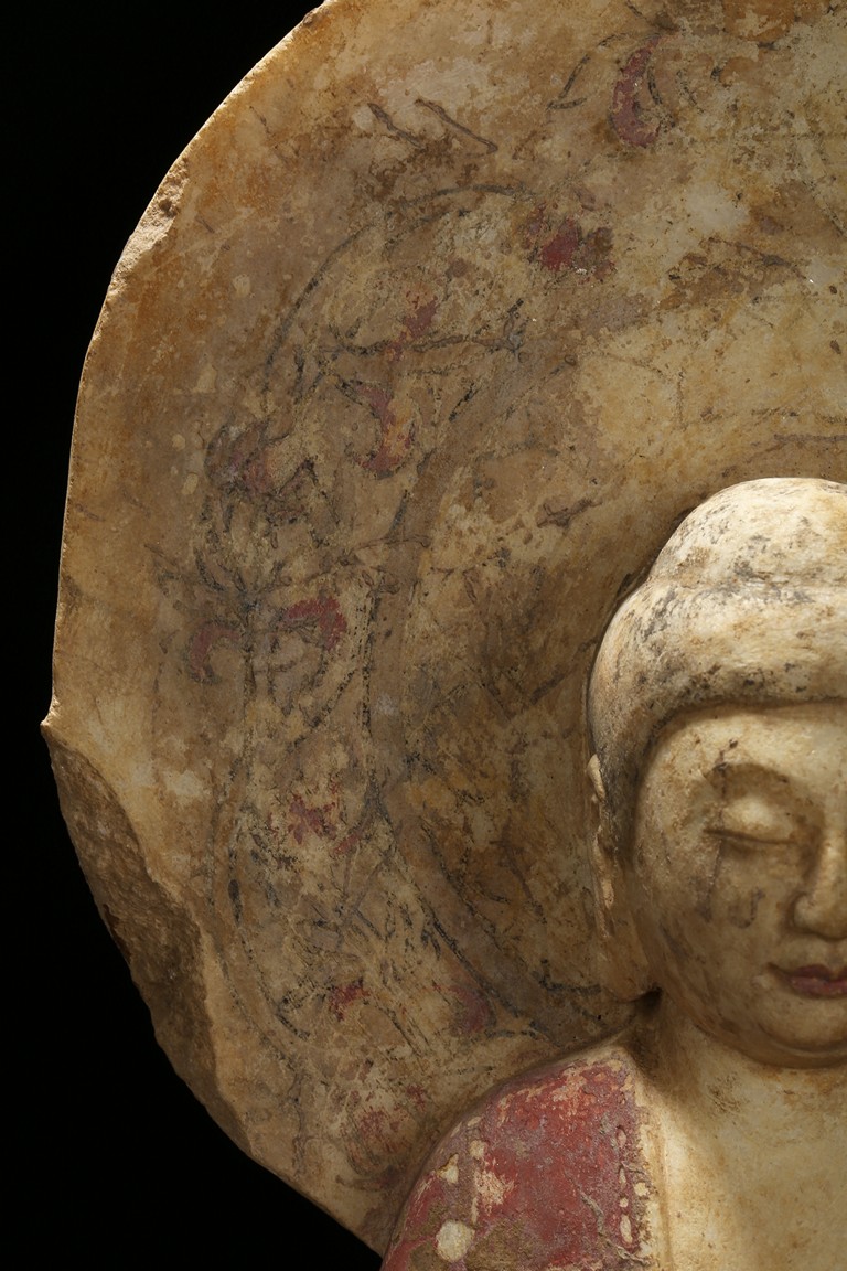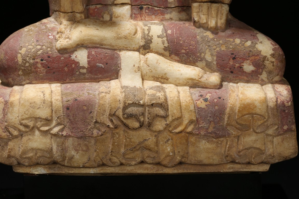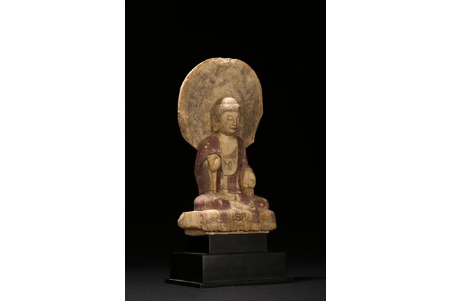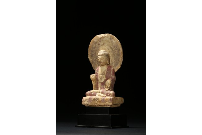 The bodhisattva shown seated in dhyanasana on a plinth, hands in mutra, wearing flowing robes falling in elegant drapes, face with smiling expression and head backed with large mandorla, reverse with decorations, the robe painted with red pigments. Tang Dynasty period.