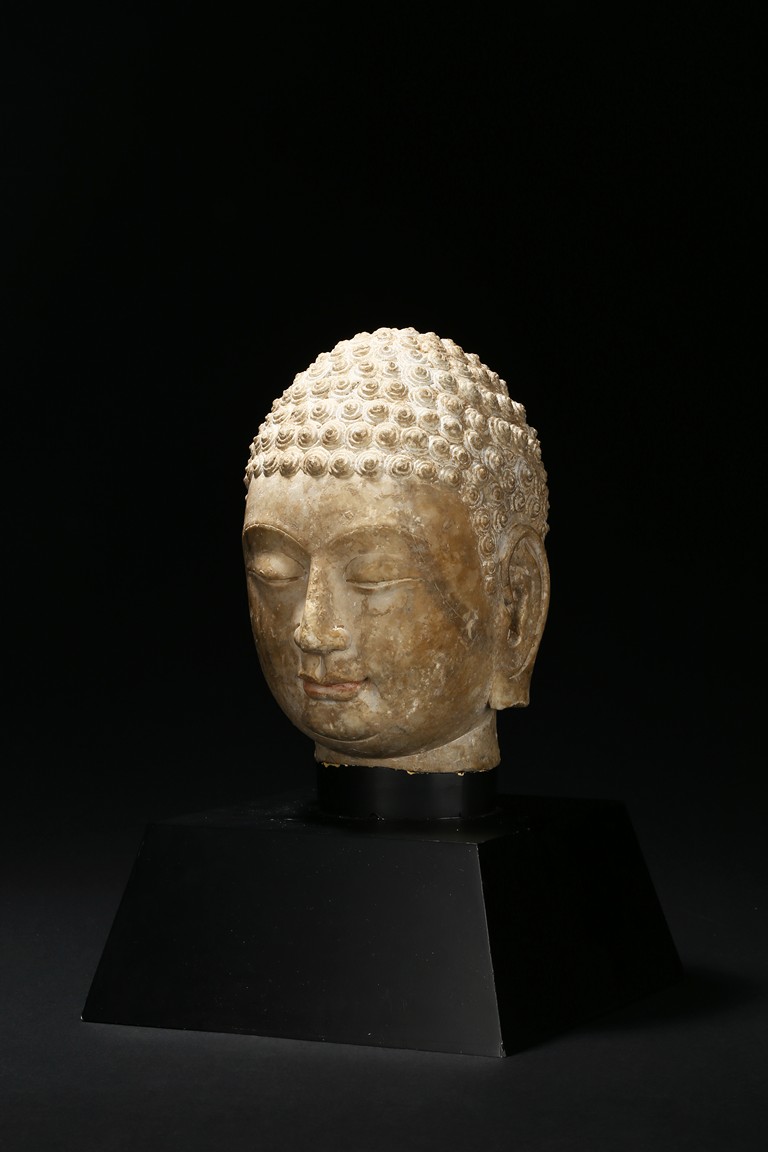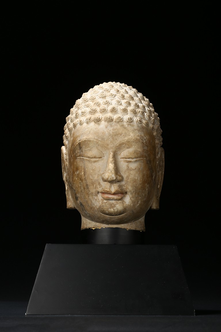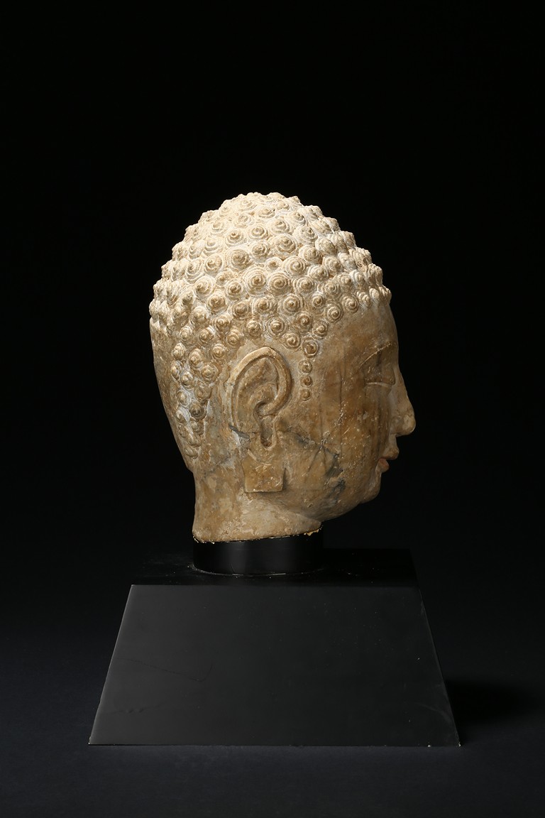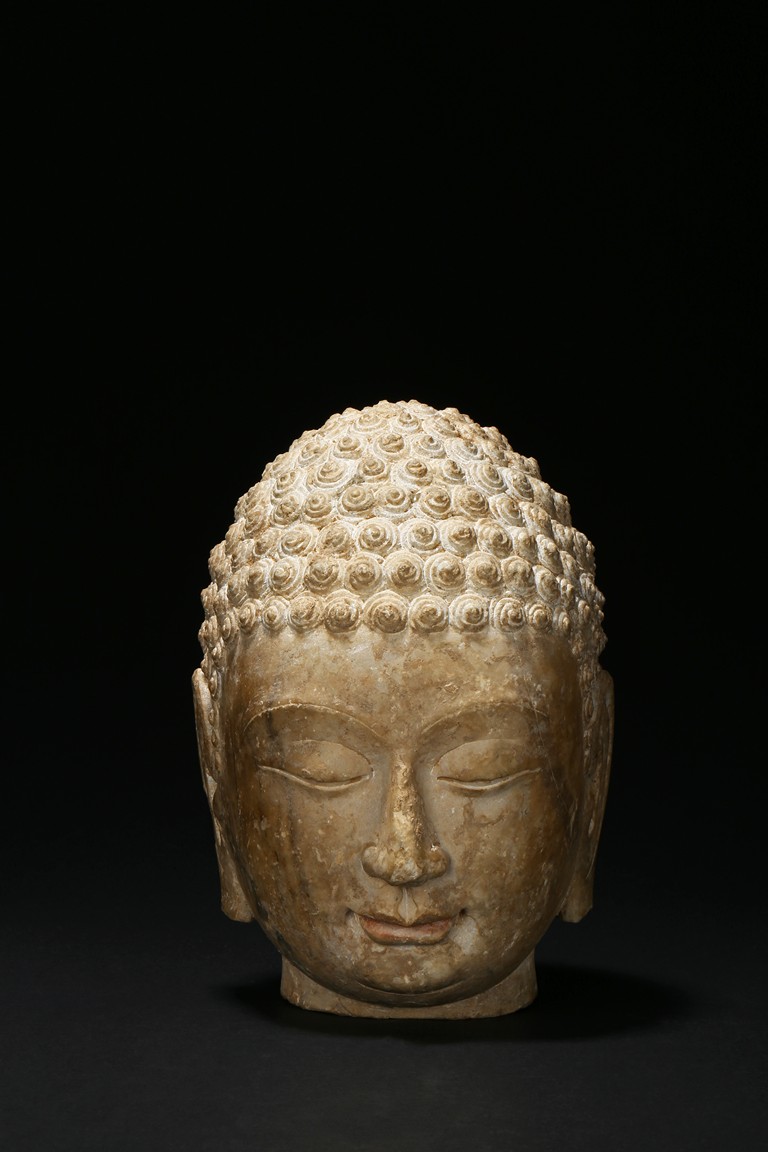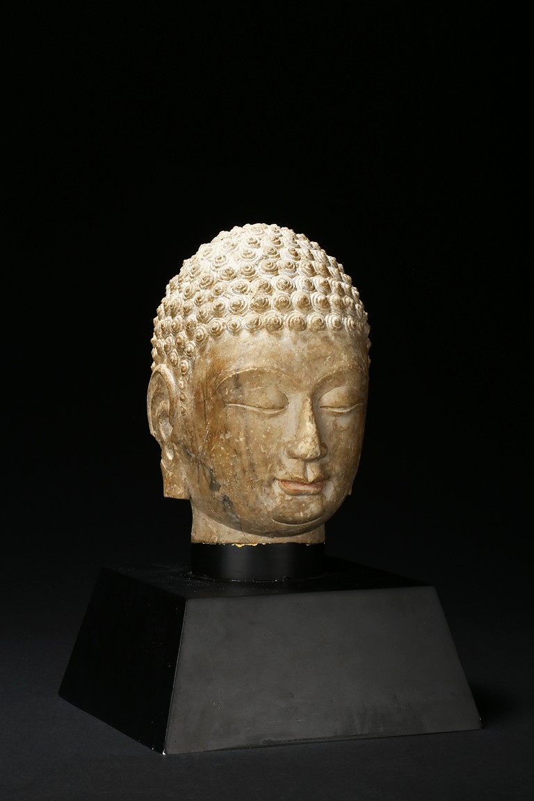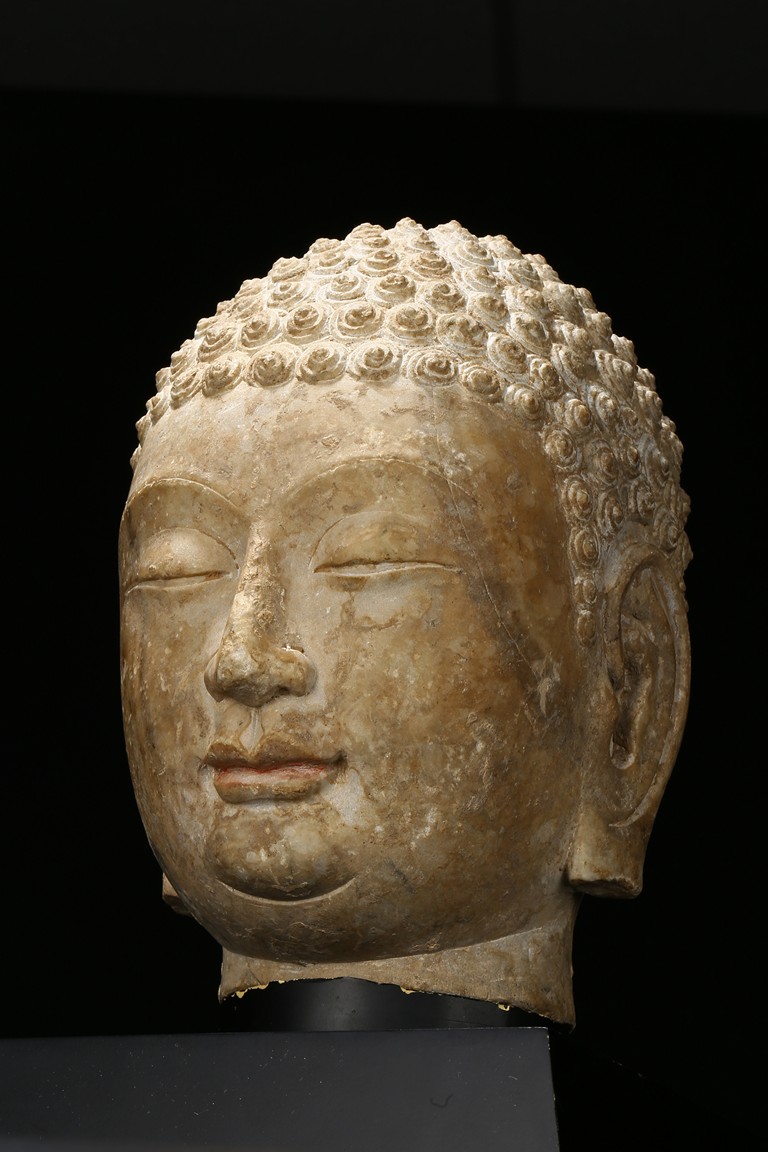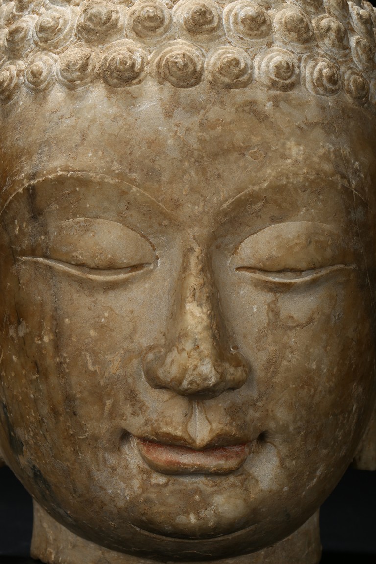 Delicately carved with eyes barely open in meditation, the sharp nose flaring above a sensuous bud mouth, the rounded face flanked by large ears, the hair in tight curls, and with traces of pigments to lips. Northern Qi Dynasty period.