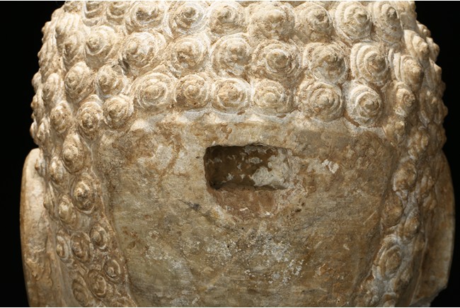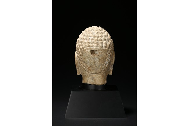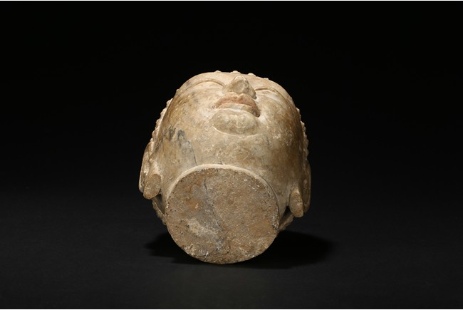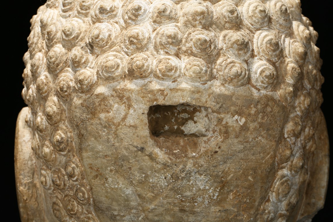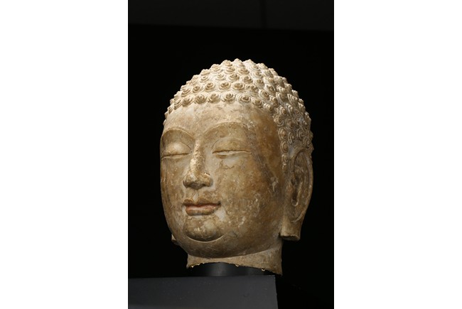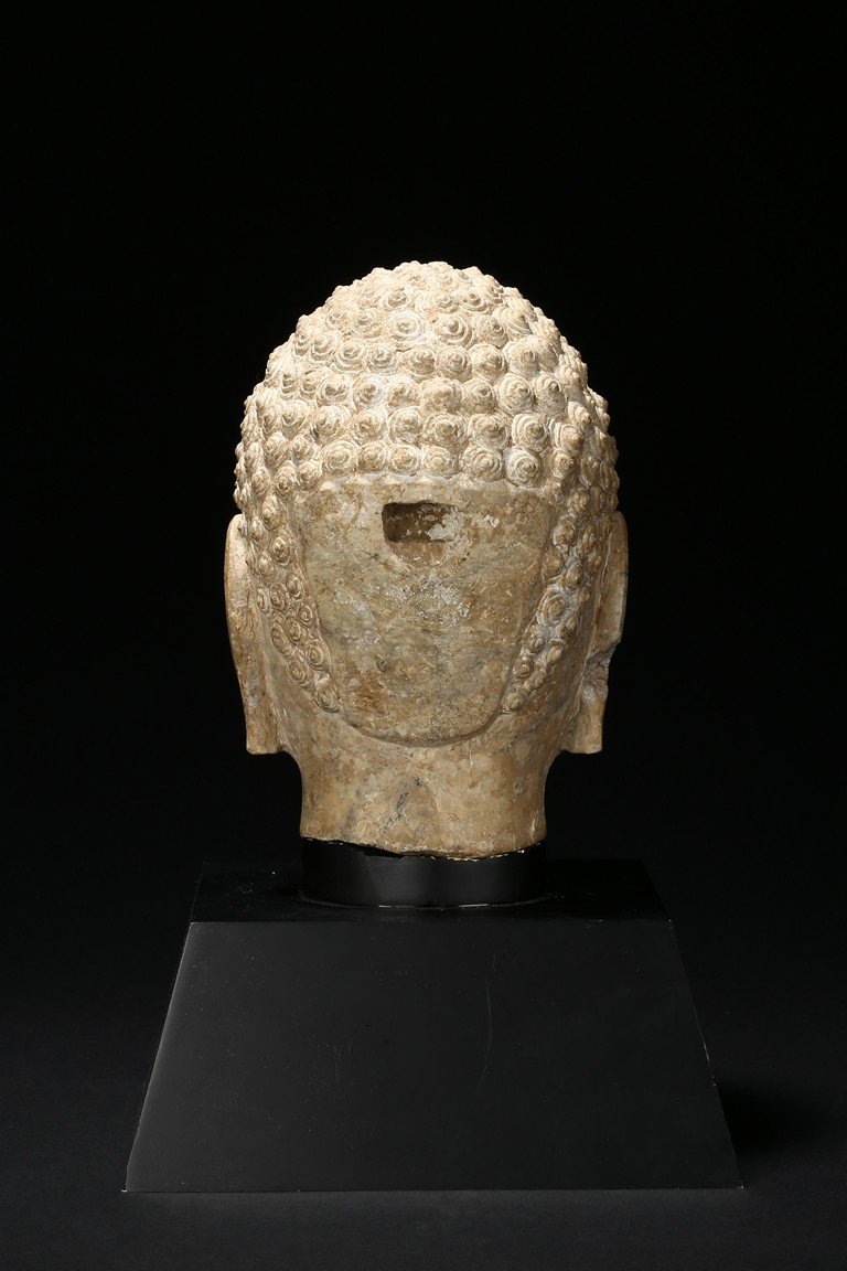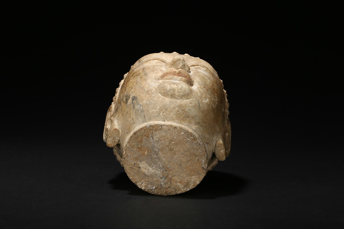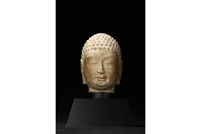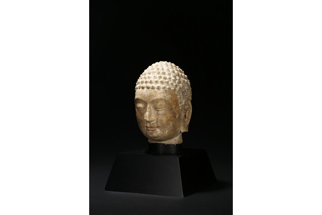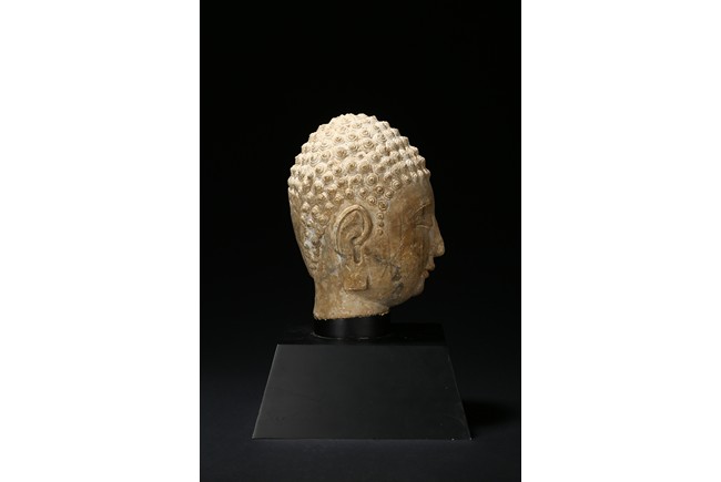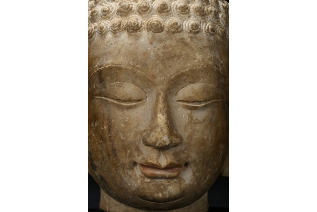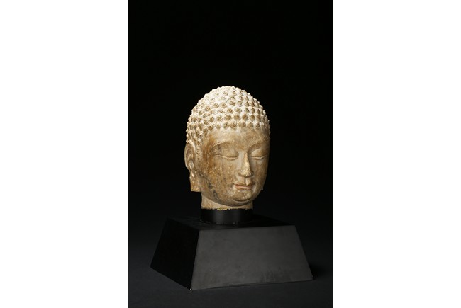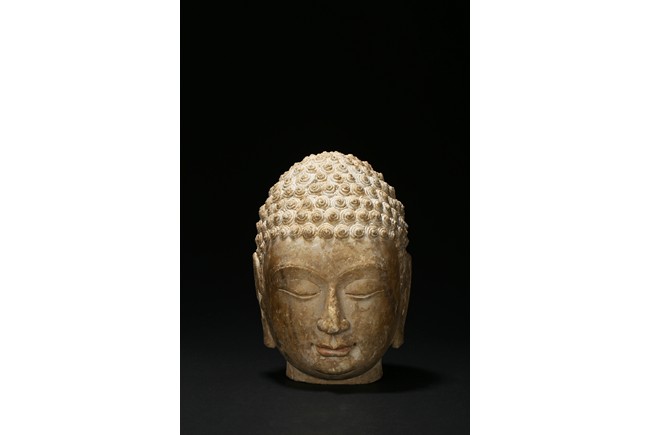 Delicately carved with eyes barely open in meditation, the sharp nose flaring above a sensuous bud mouth, the rounded face flanked by large ears, the hair in tight curls, and with traces of pigments to lips. Northern Qi Dynasty period.