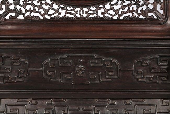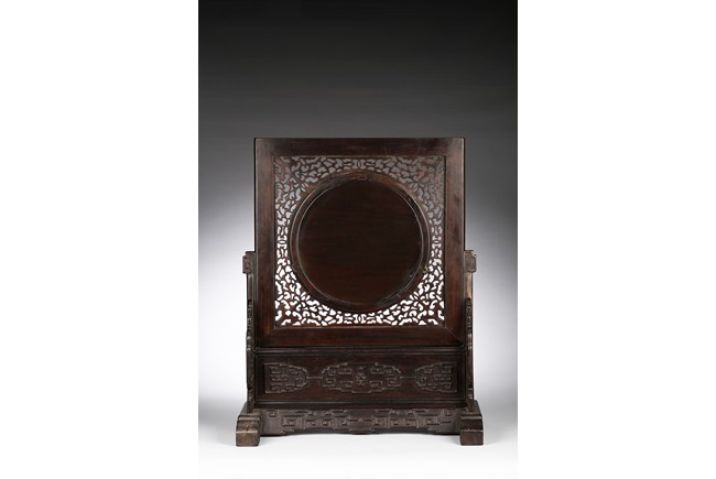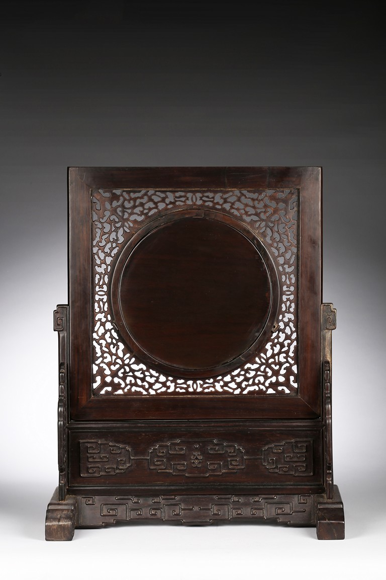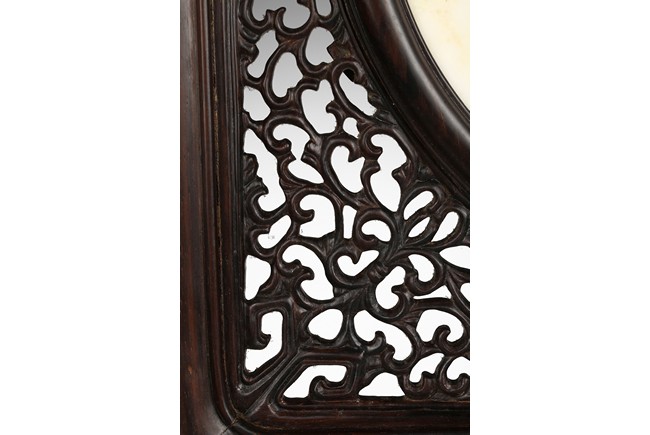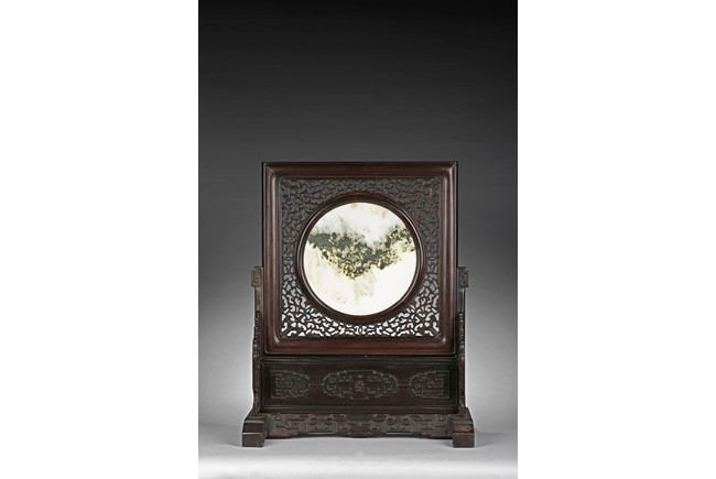 The rectangular wood frame holding a striated marble circular plaque with markings that resemble a horizontal mountain, the frame fitting into a wood stand with key-fret decorations. Republic period.