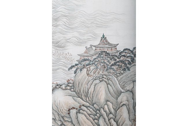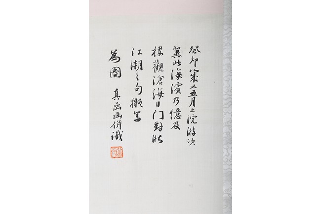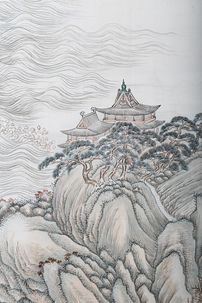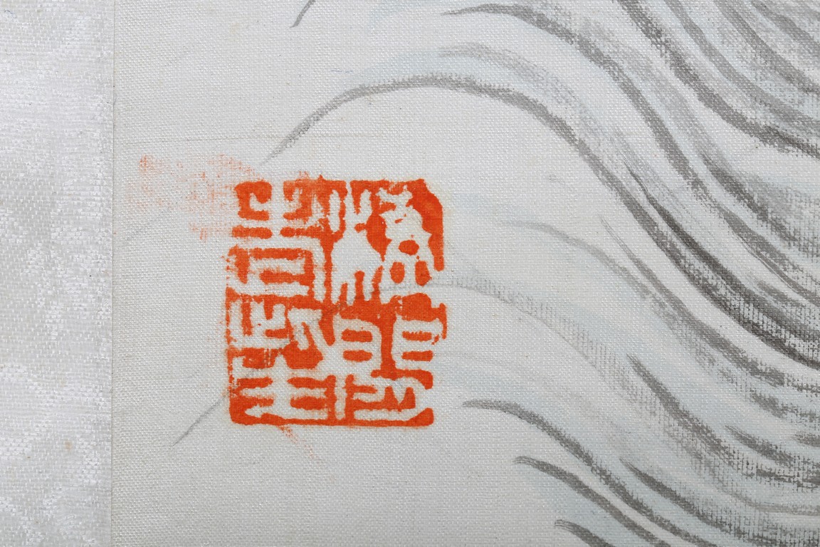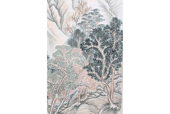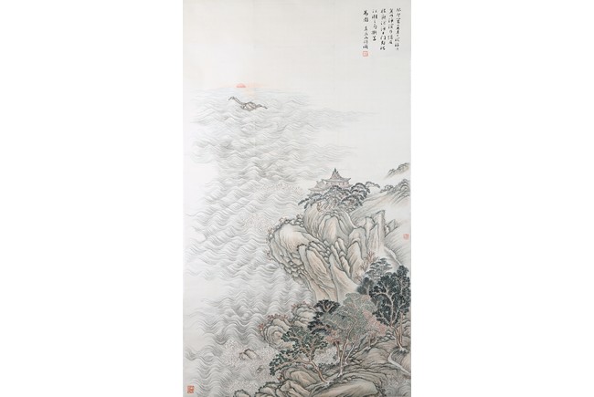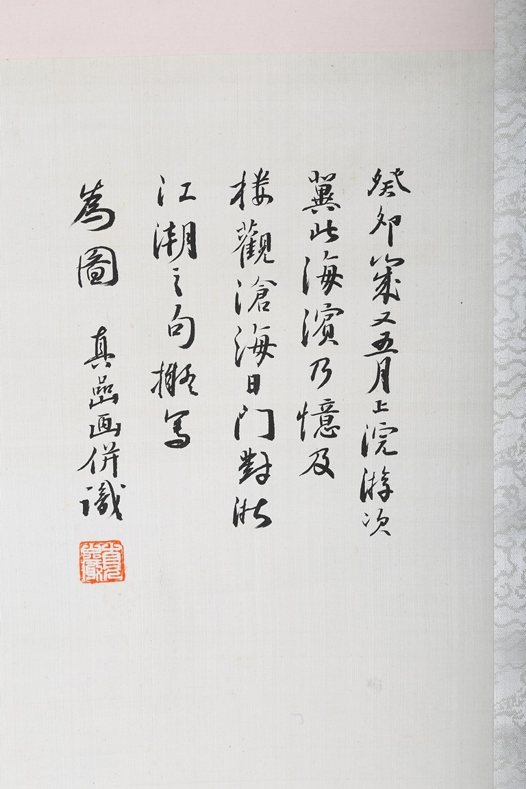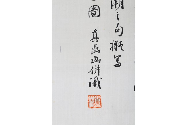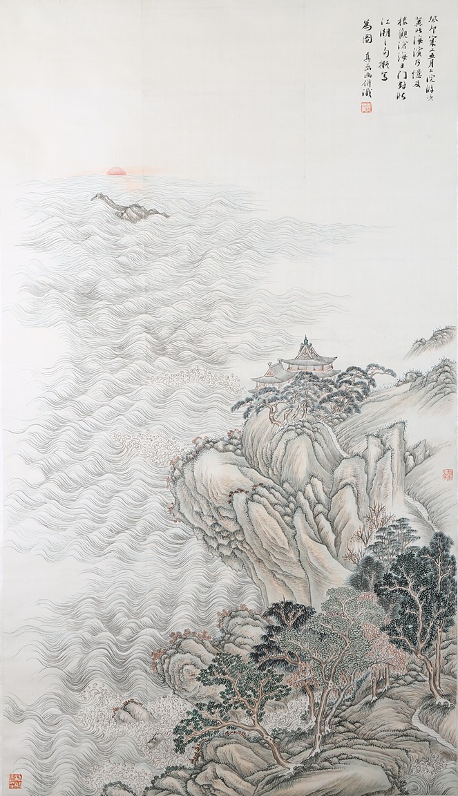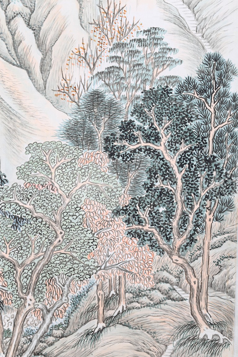 Hanging scroll. Landscape. Ink and color on paper. Inscribed and signed Zhen Yan, with three seals of the artist, dated to the year of 1903.