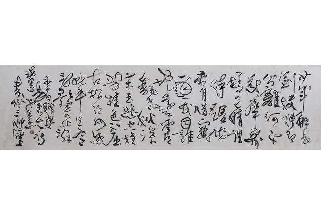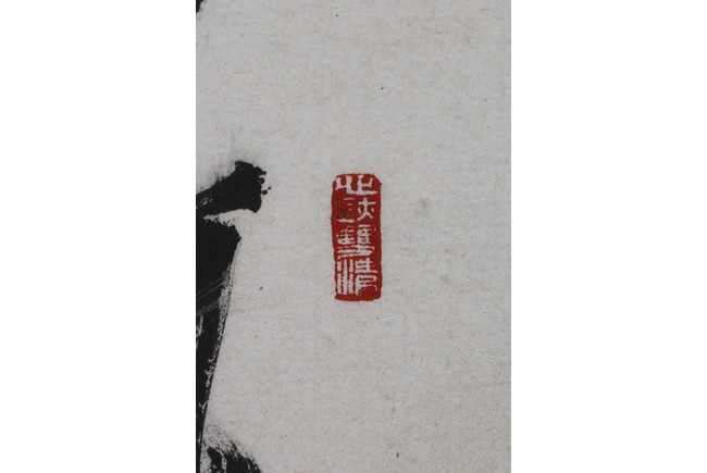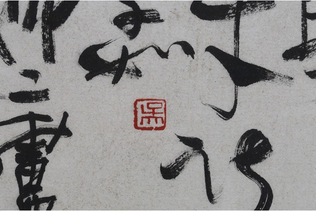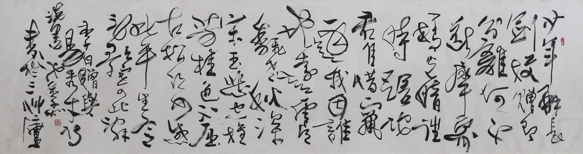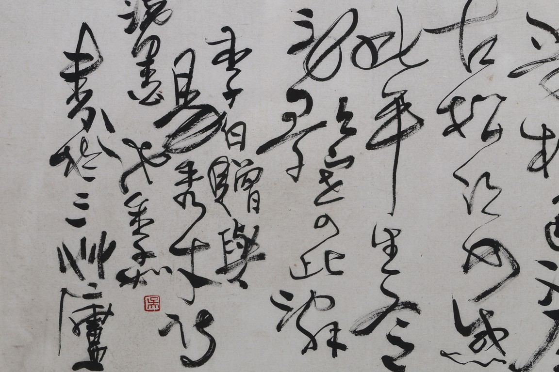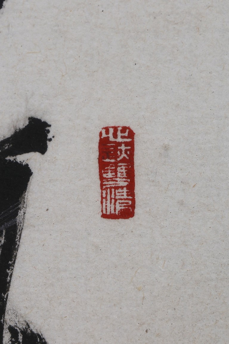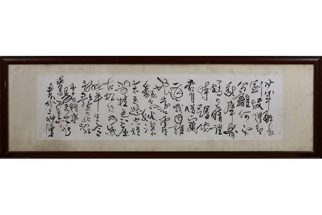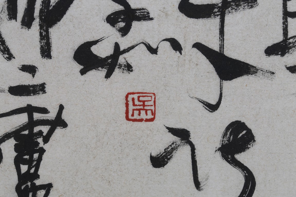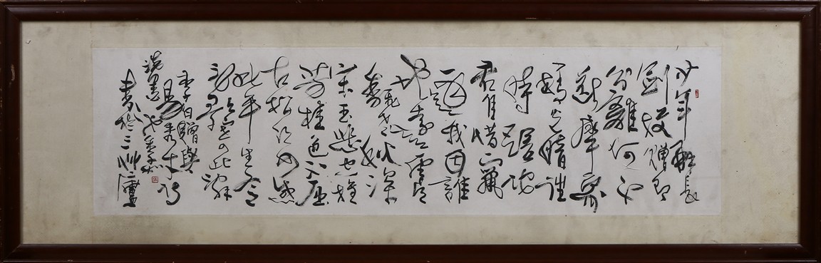 Ink on paper. Cursive script calligraphy. Framed. Inscribed and with two seals of the artist.