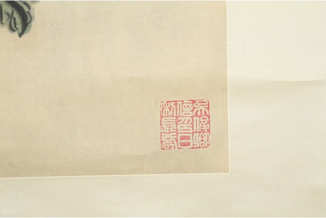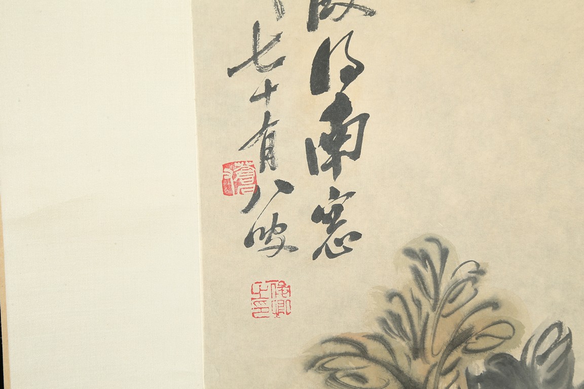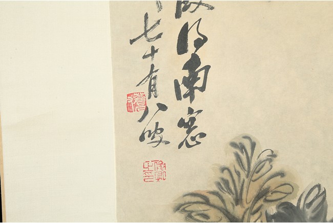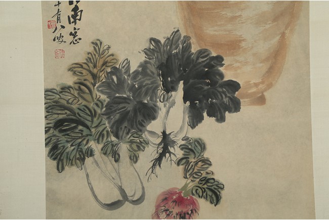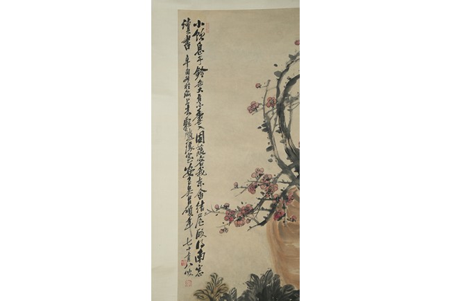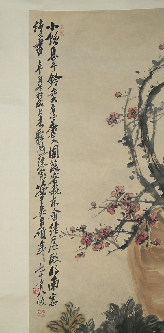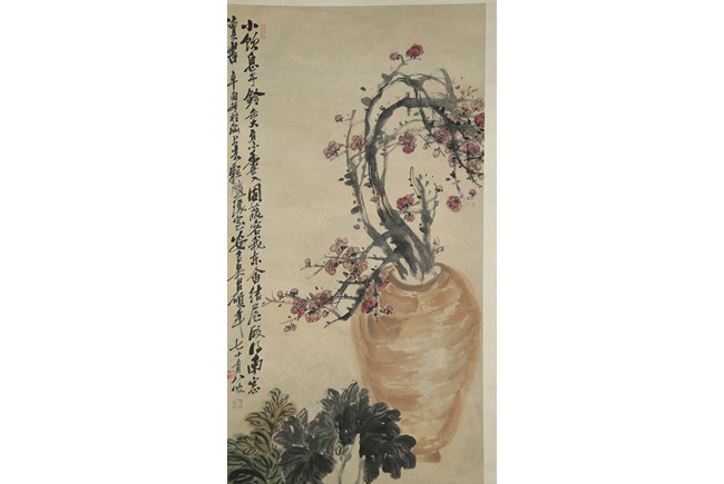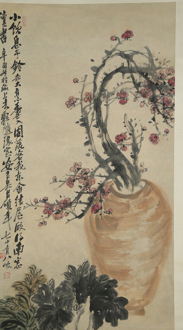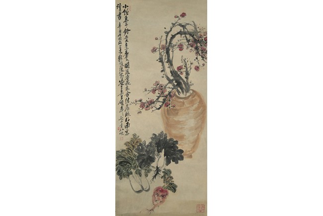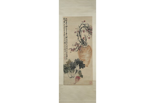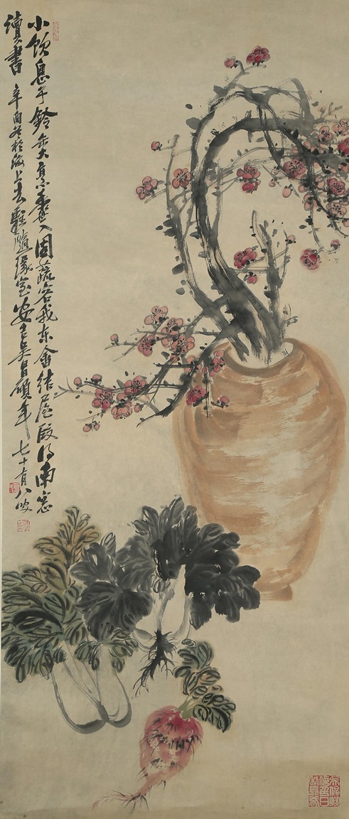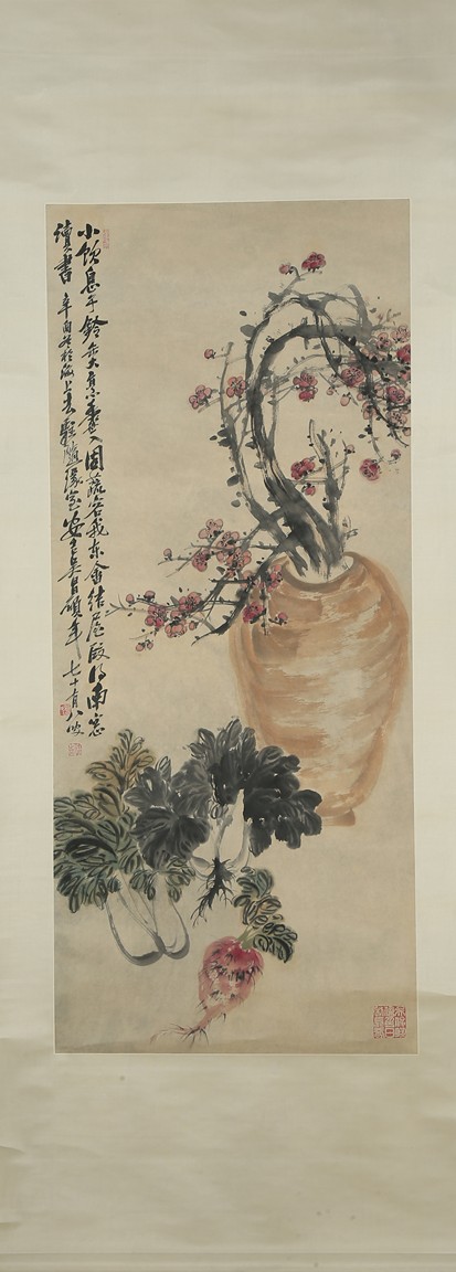 Color and ink on paper. Plum Blossom and Vegetables. Hanging scroll. Inscribed and signed Wu Changshuo, with four seals of the artist.