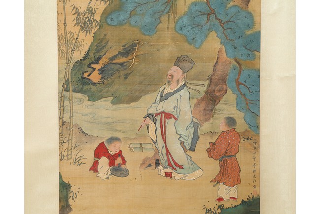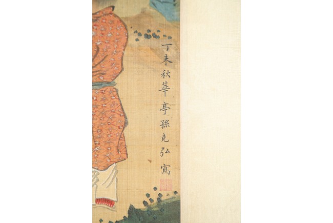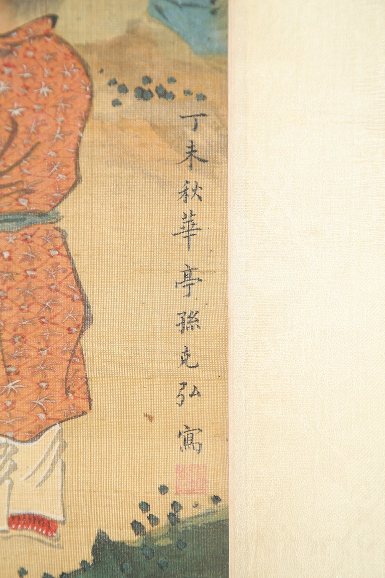Color and ink on silk. Figures. Hanging scroll. Signed Sun Kehong, with one seal of the artist.