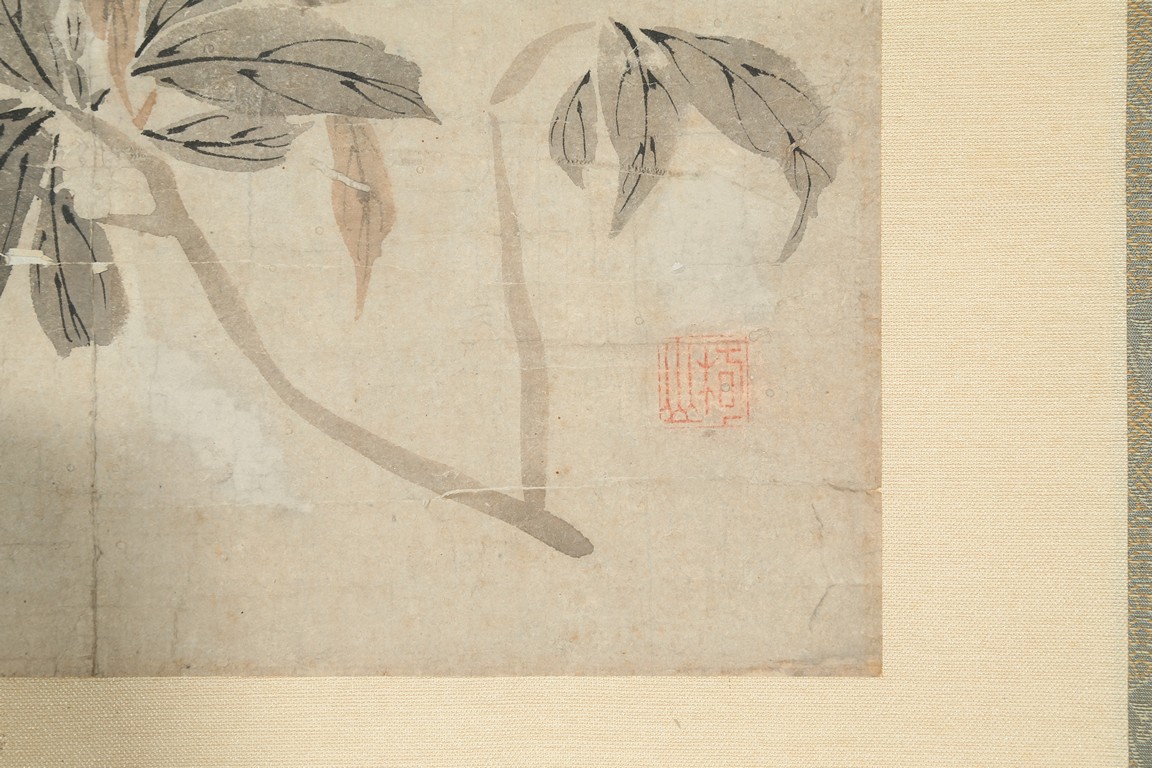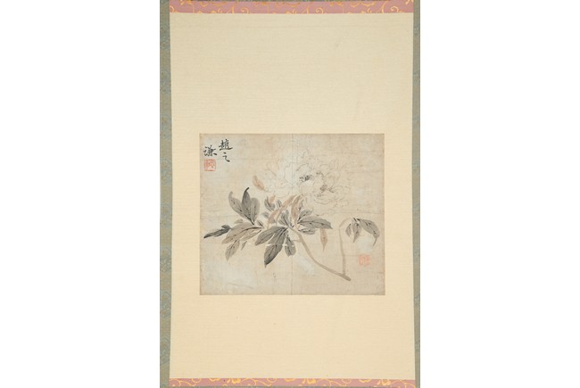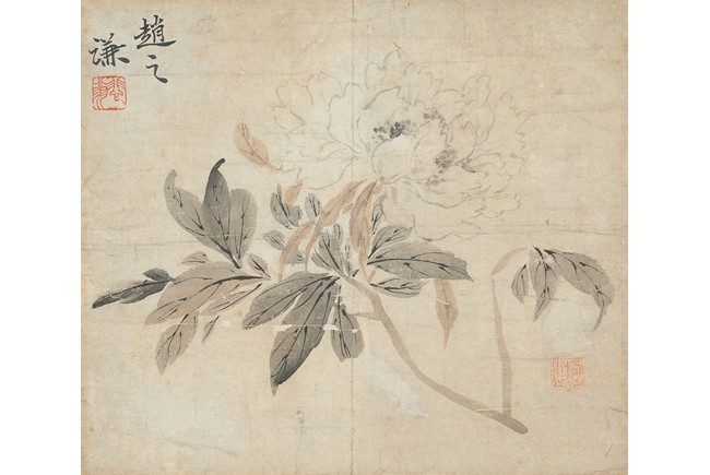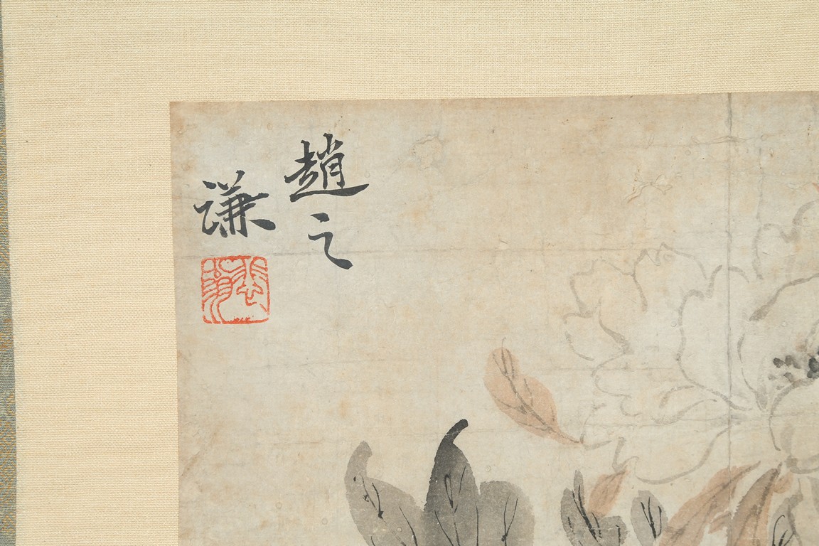 Color and ink on paper. Peony. Mounted for framing. Signed Zhao Zhiqian and with two seals of the artist.