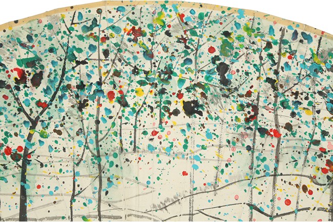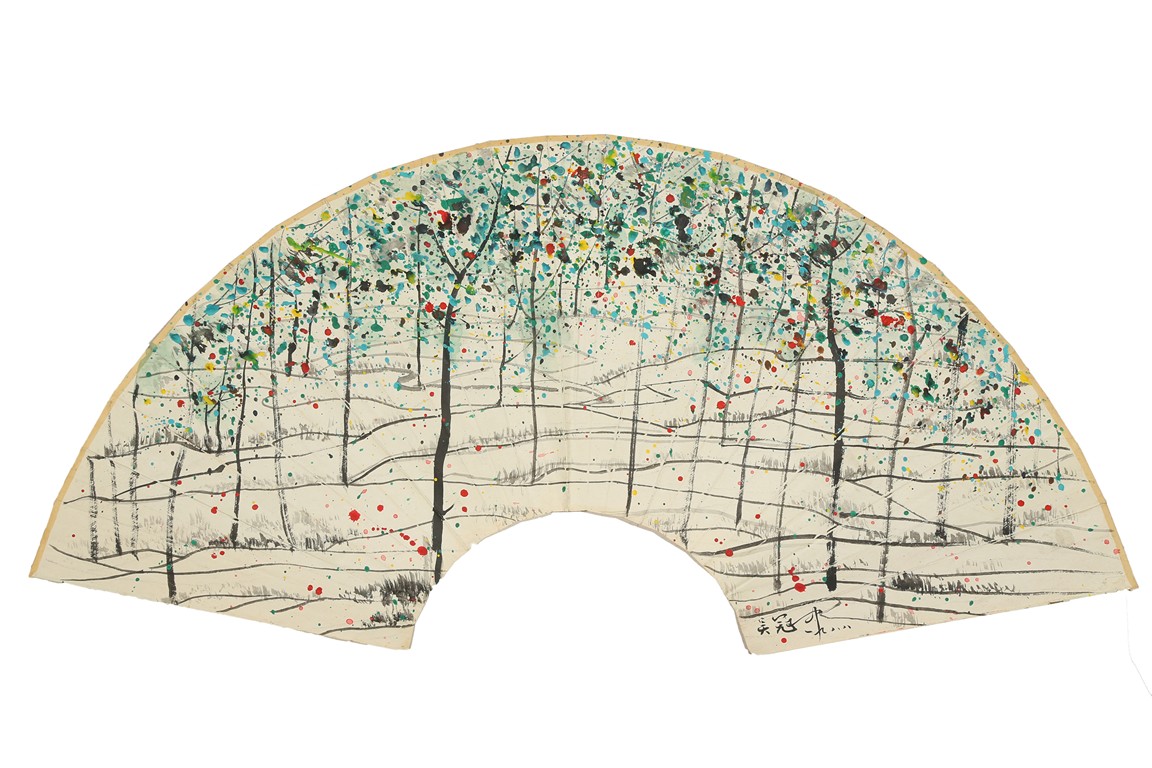 WU GUANZHONG: COLOR AND INK 'LANDSCAPE' FAN PAINTING 吳冠中 樹林 扇面 設色紙本