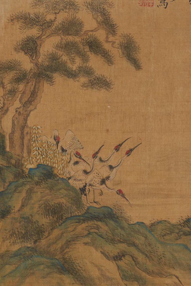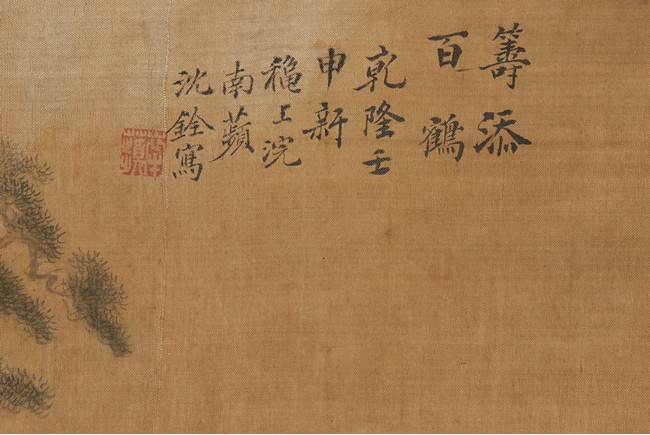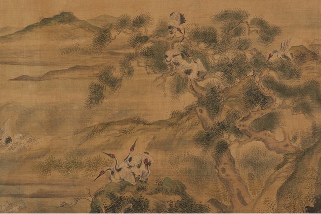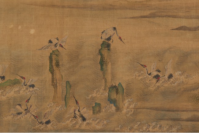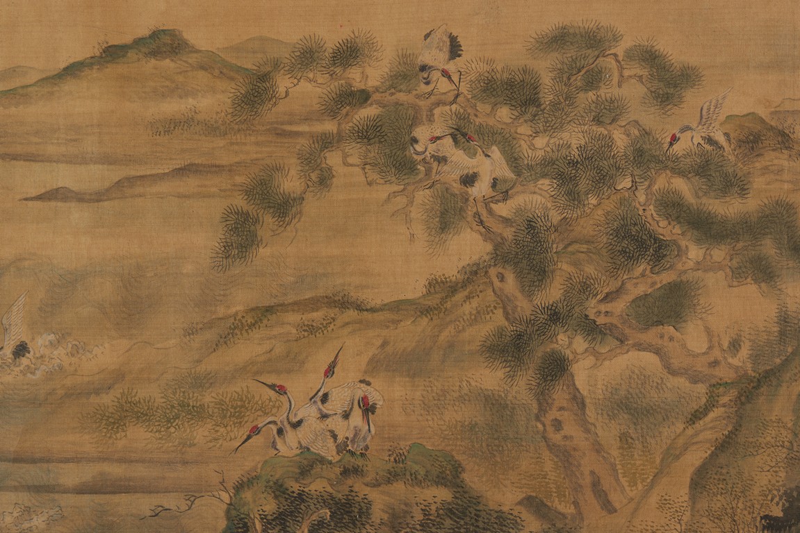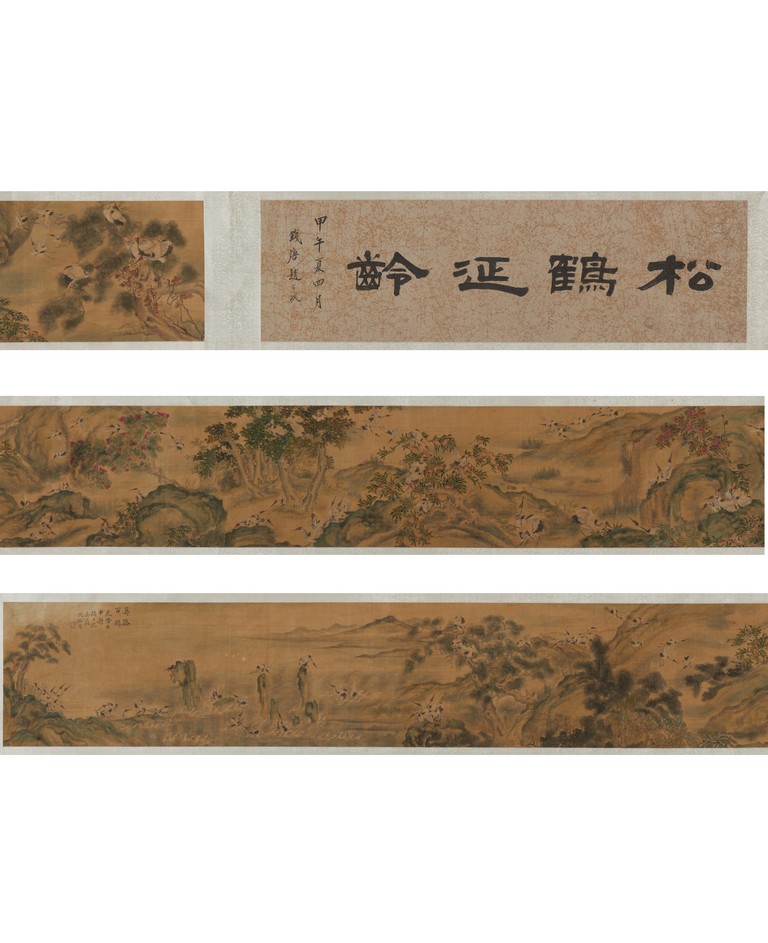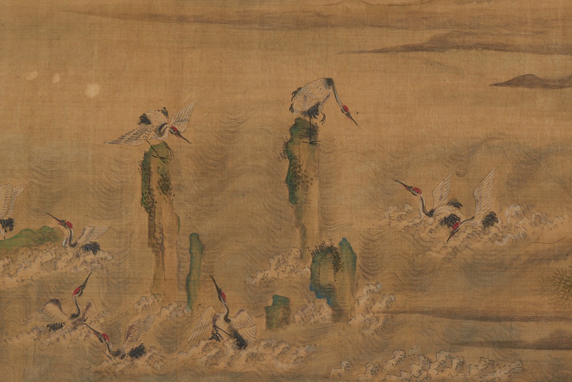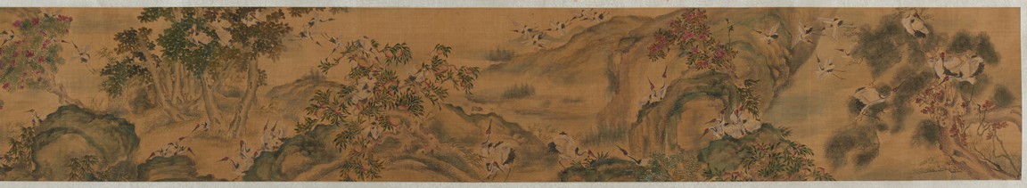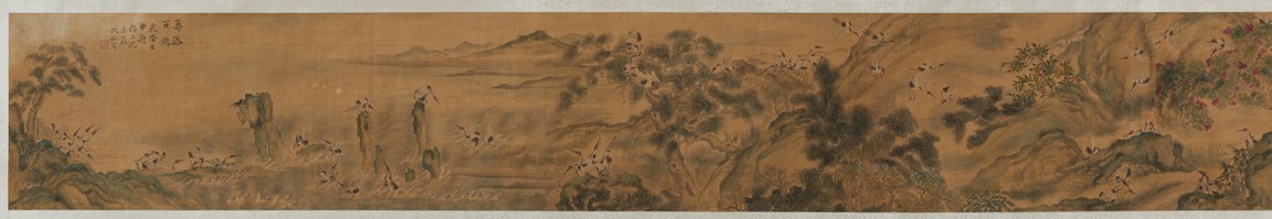 Ink and color on silk. One Hundred Cranes in the Landscape. Handscroll. Inscribed and signed Shen Quan, with one seal of the artist.
