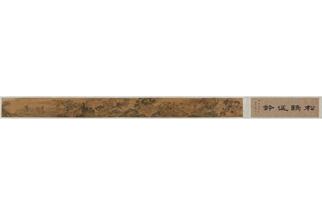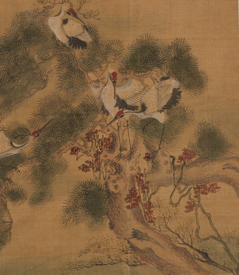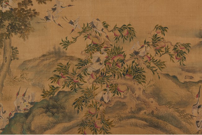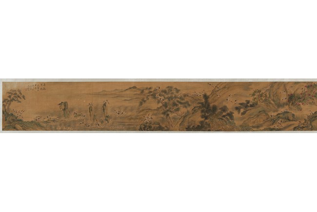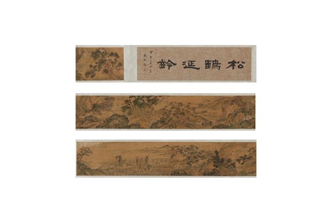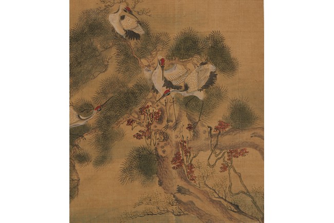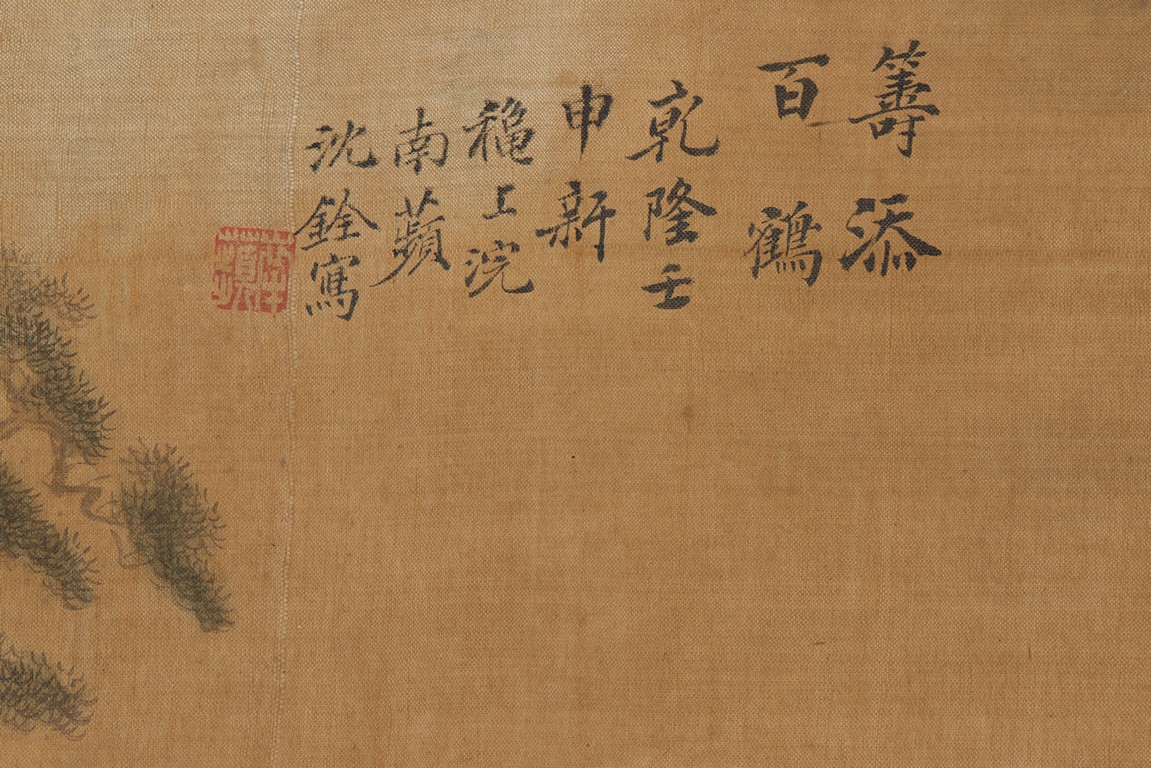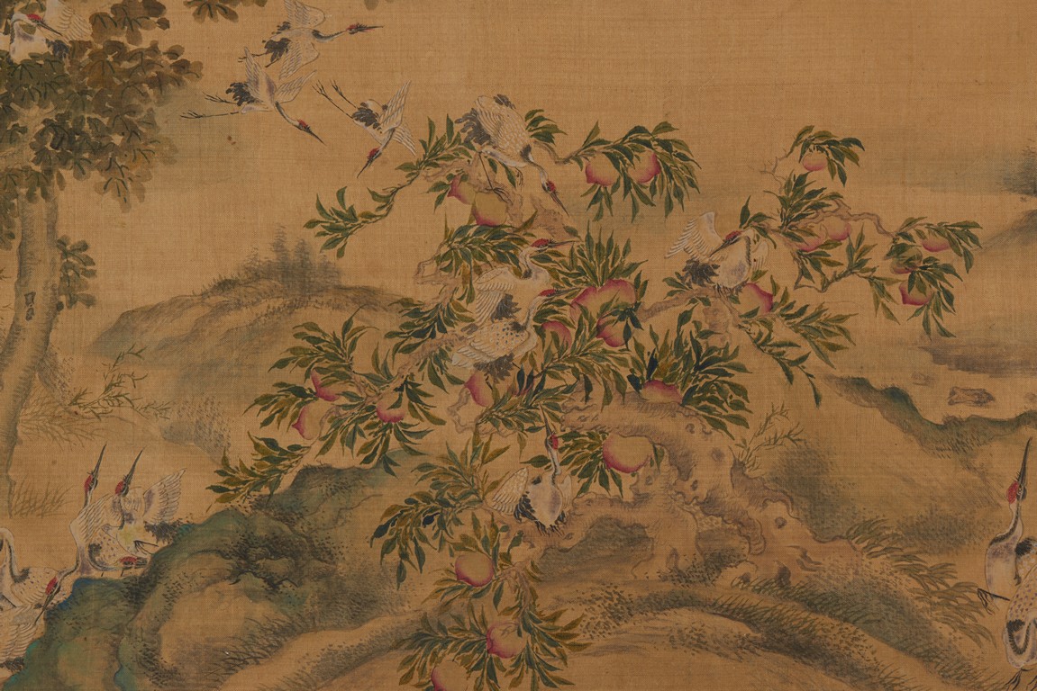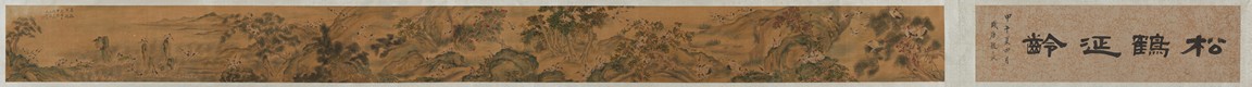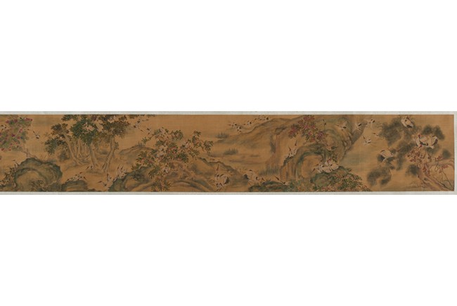 Ink and color on silk. One Hundred Cranes in the Landscape. Handscroll. Inscribed and signed Shen Quan, with one seal of the artist.