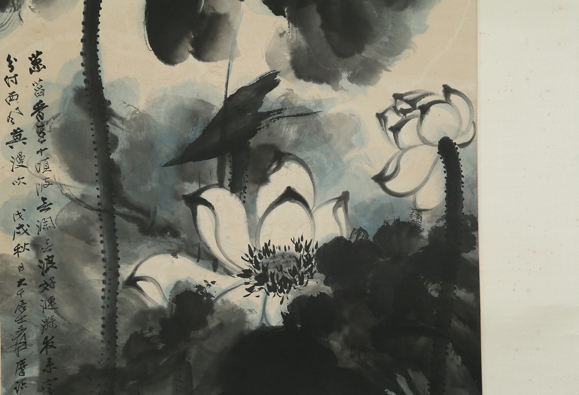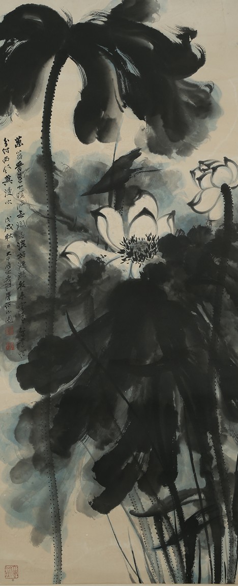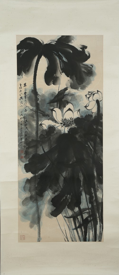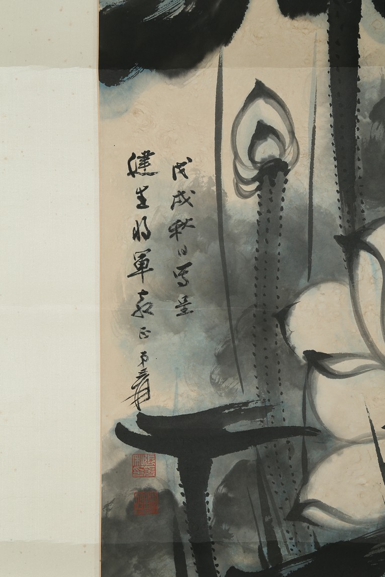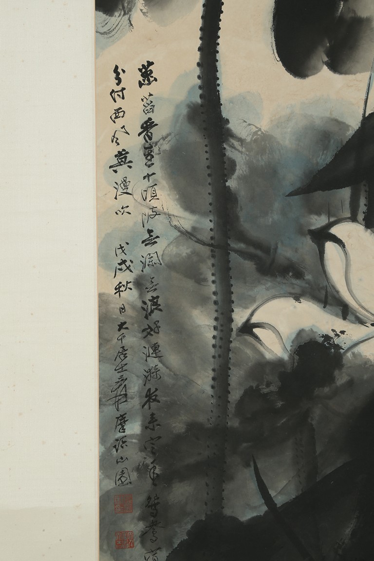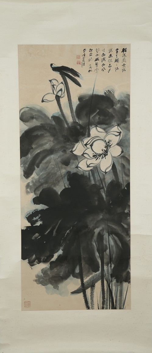 Color and ink on paper. Giant Lotus. Hanging scroll. Each incribed and signed, with three seals of the artist. Attributed to Zhang Daqian.