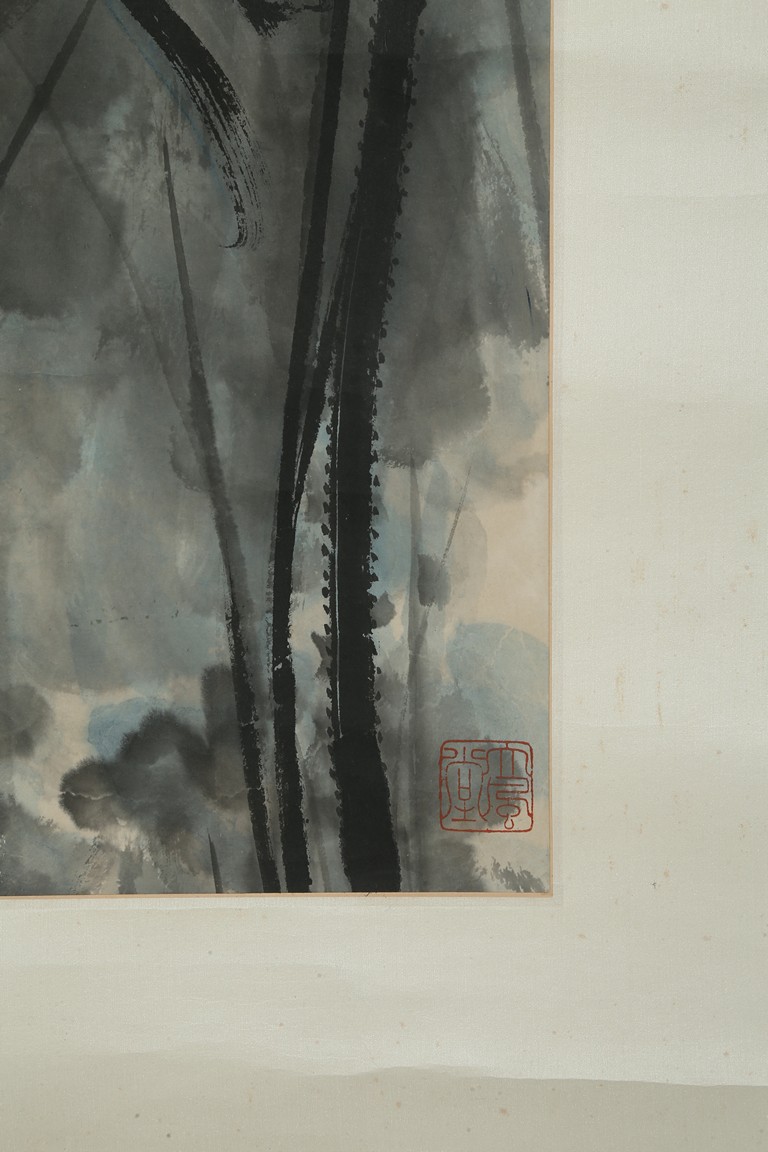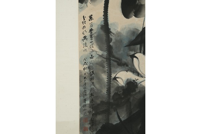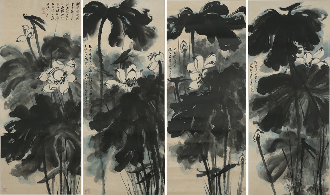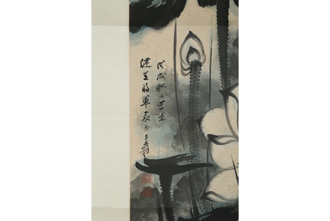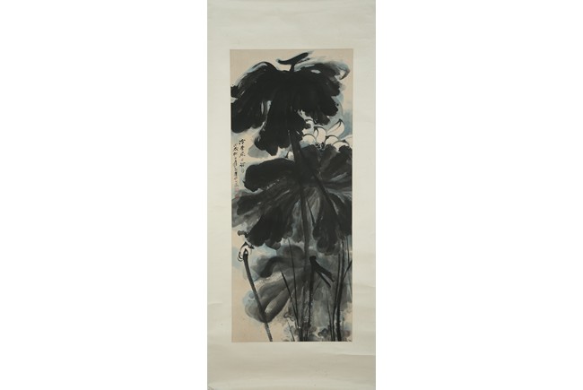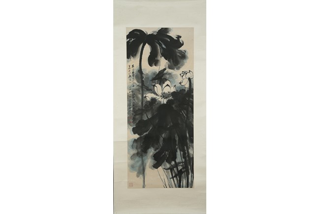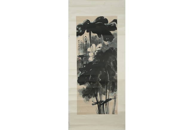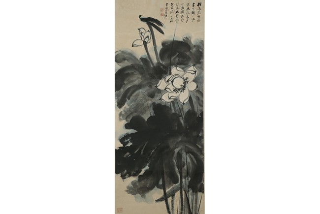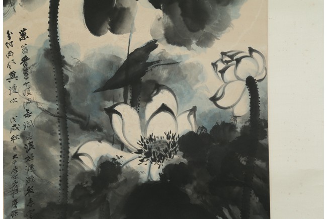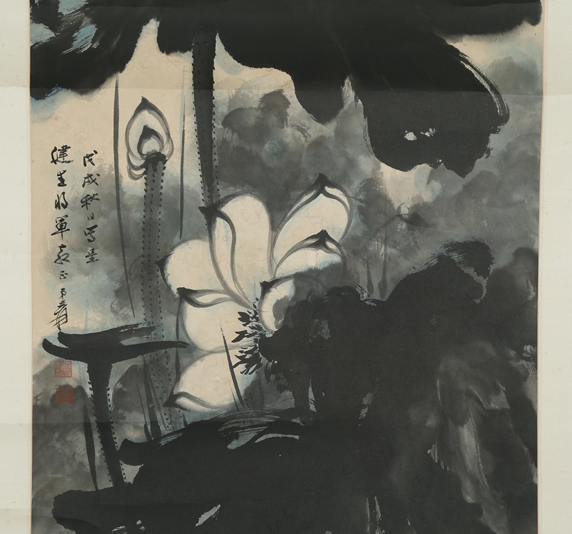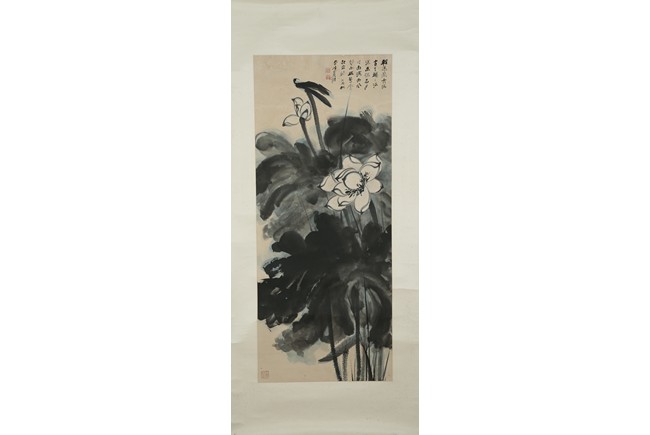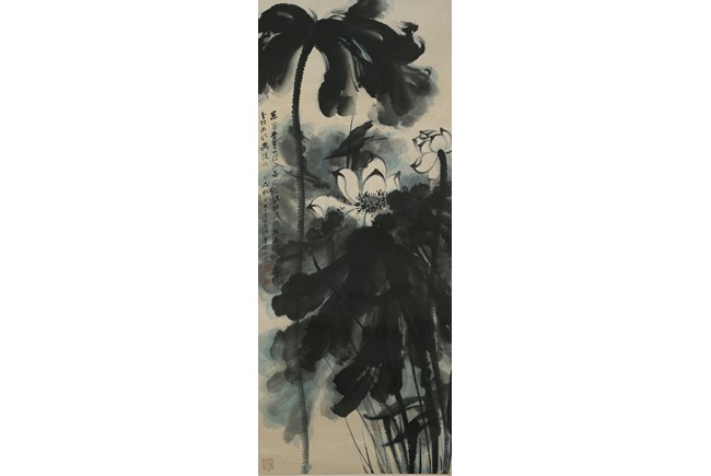 Color and ink on paper. Giant Lotus. Hanging scroll. Each incribed and signed, with three seals of the artist. Attributed to Zhang Daqian.