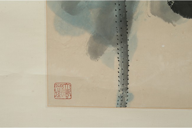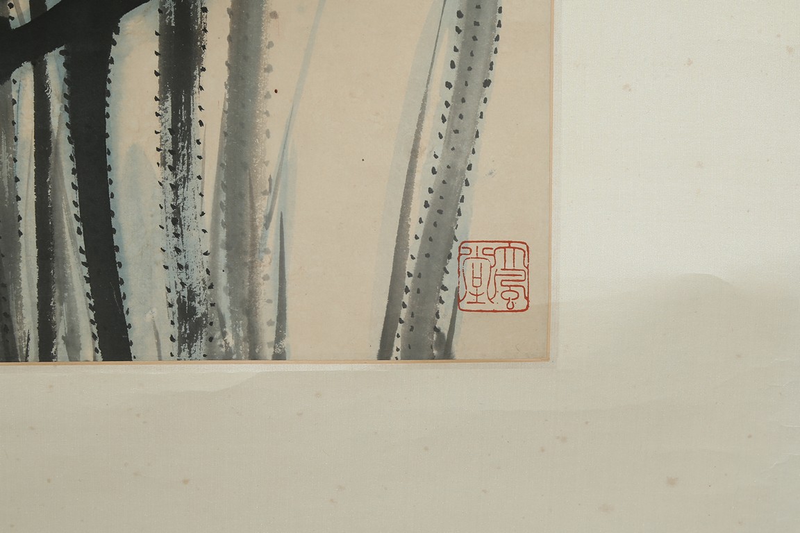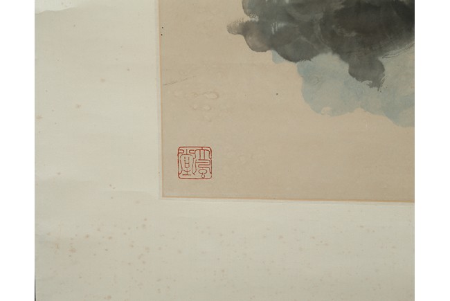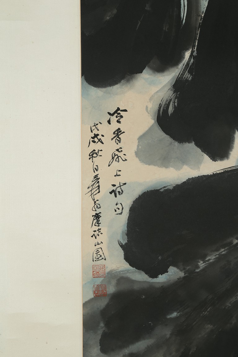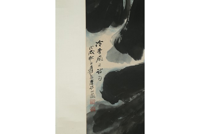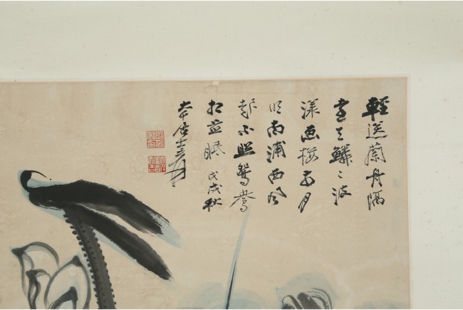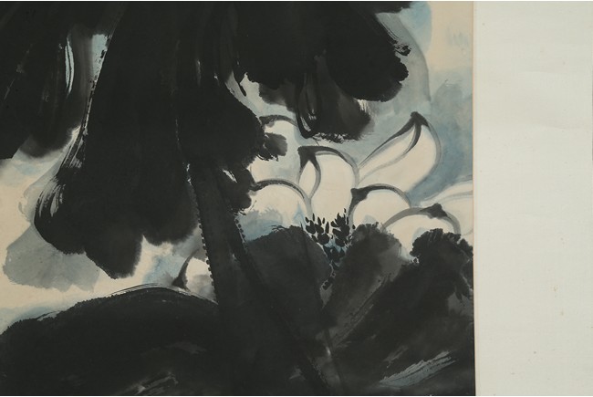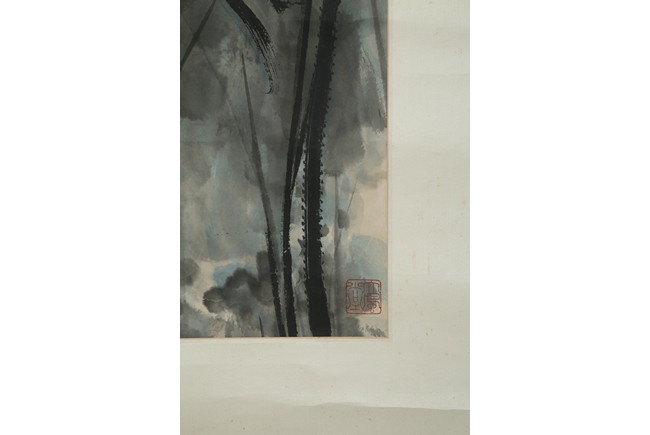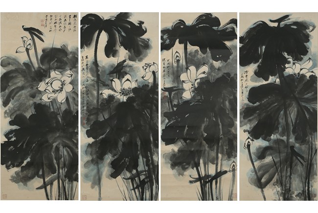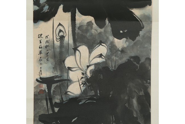 Color and ink on paper. Giant Lotus. Hanging scroll. Each incribed and signed, with three seals of the artist. Attributed to Zhang Daqian.